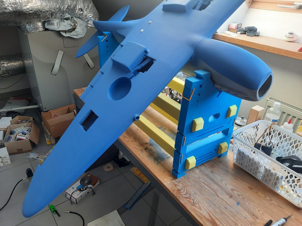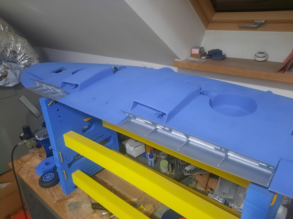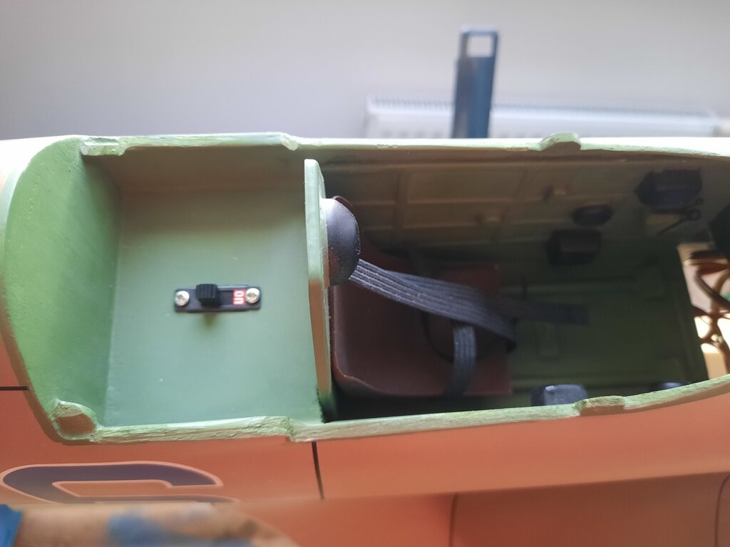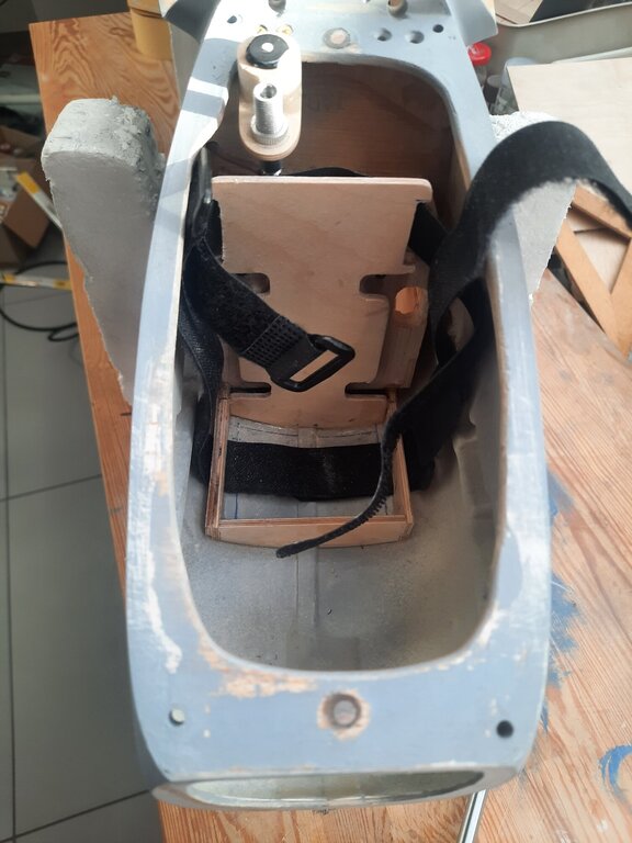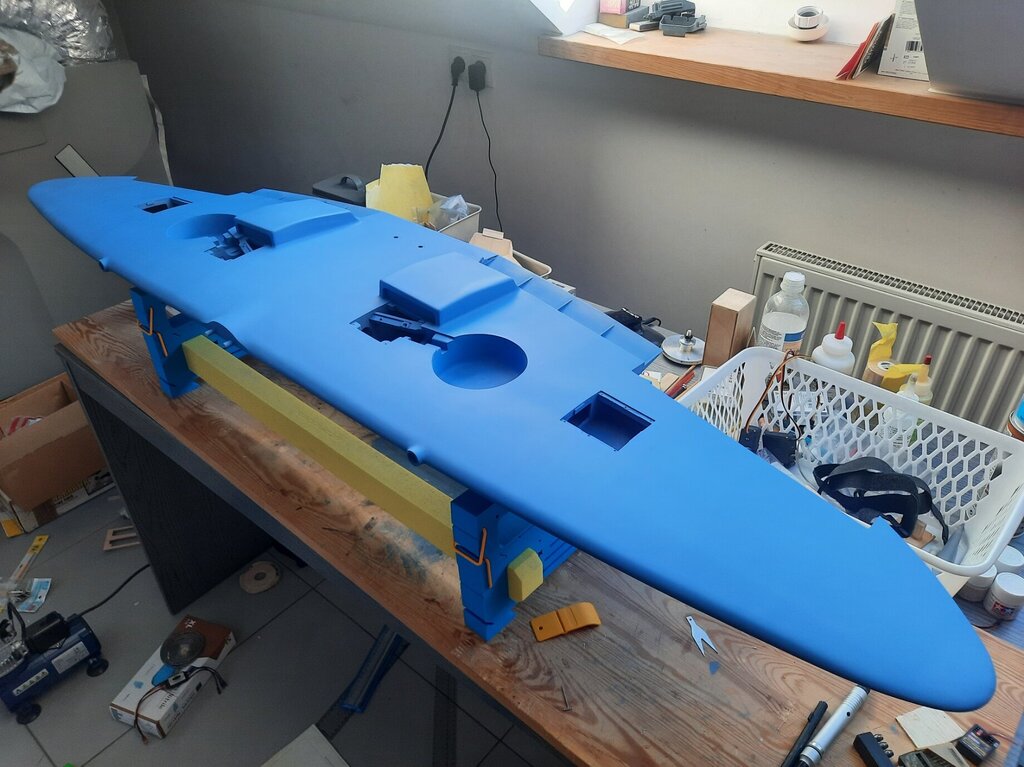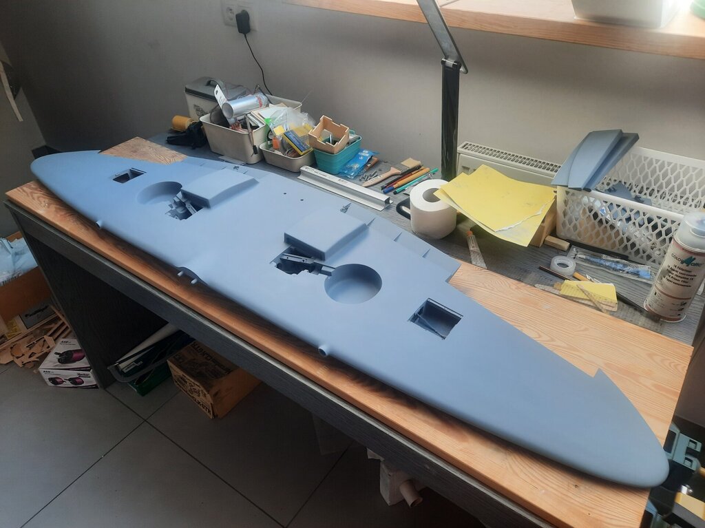 Zrobione mocowanie baterii. Przycięta została również owiewka kabiny i ruszyły przygotowania kadłuba do malowania. -