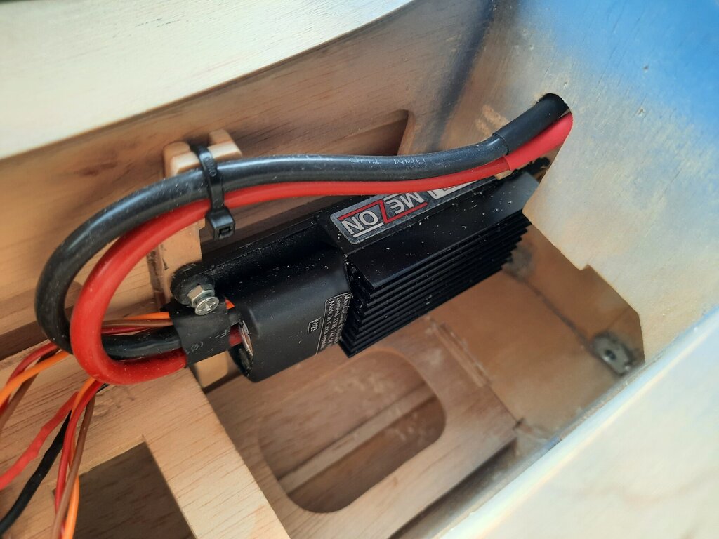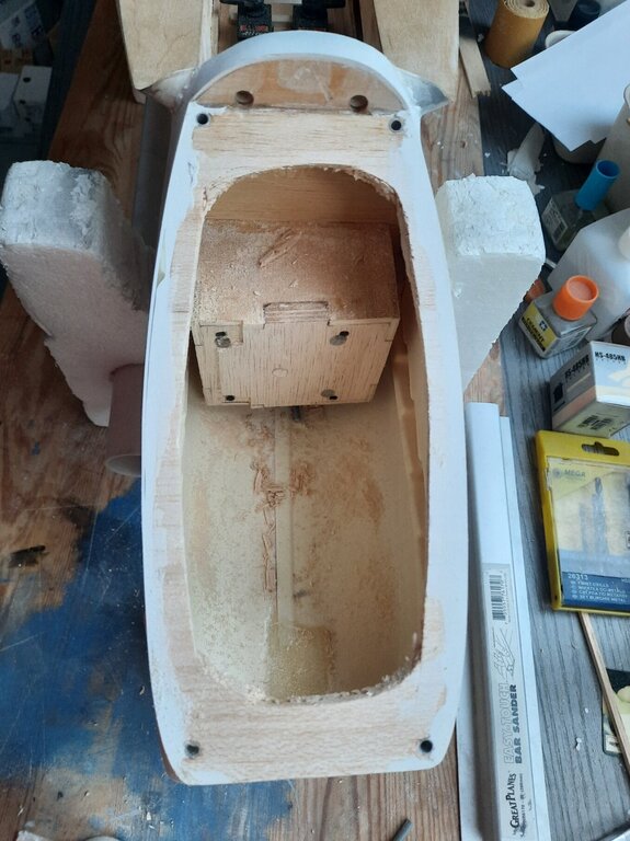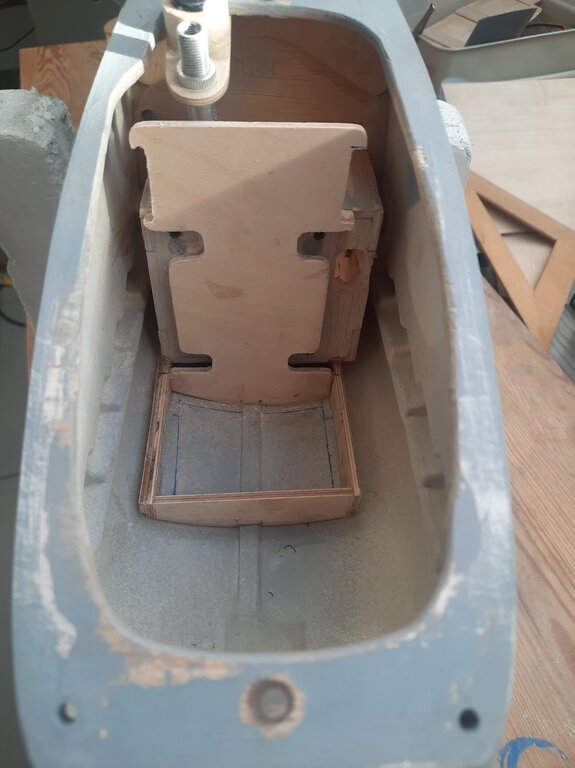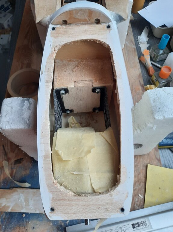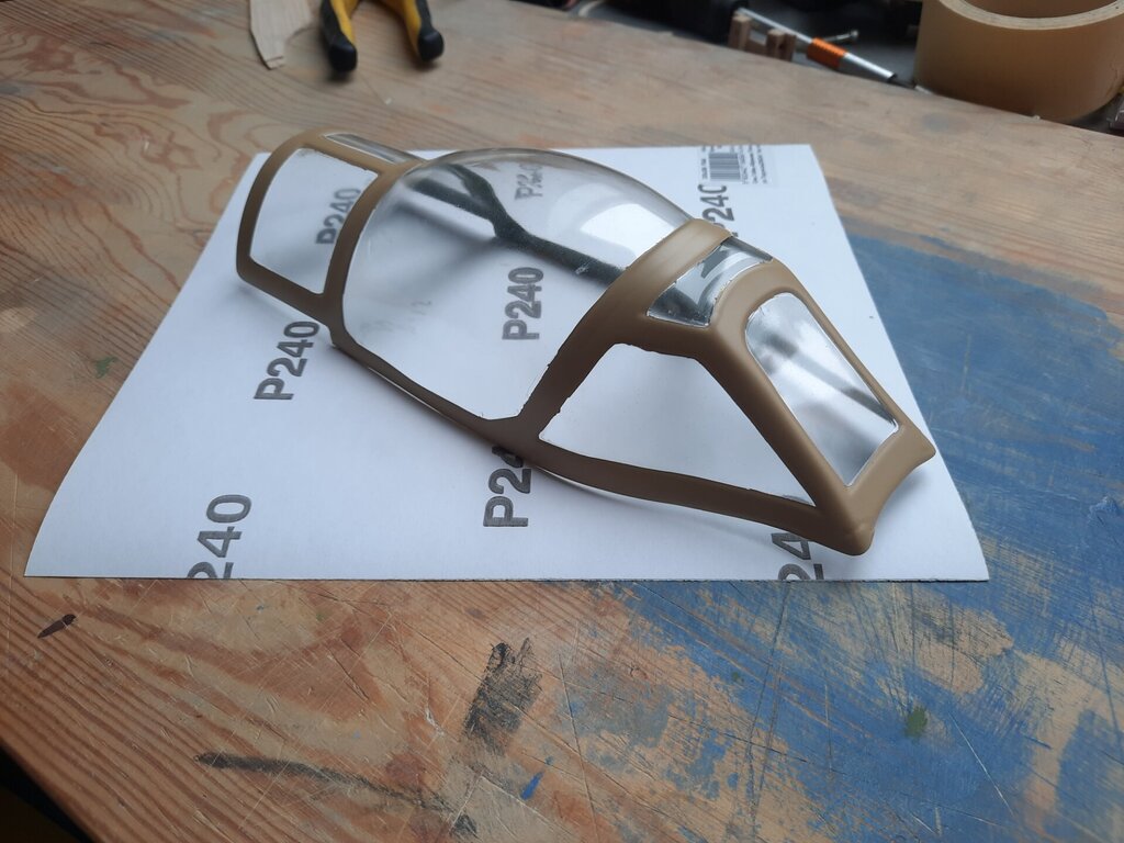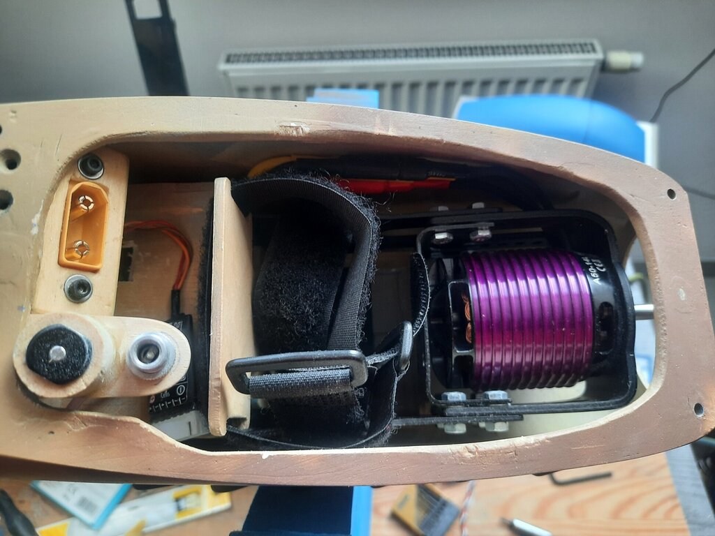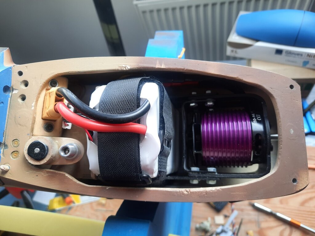 Zrobione mocowanie baterii. Przycięta została również owiewka kabiny i ruszyły przygotowania kadłuba do malowania. -