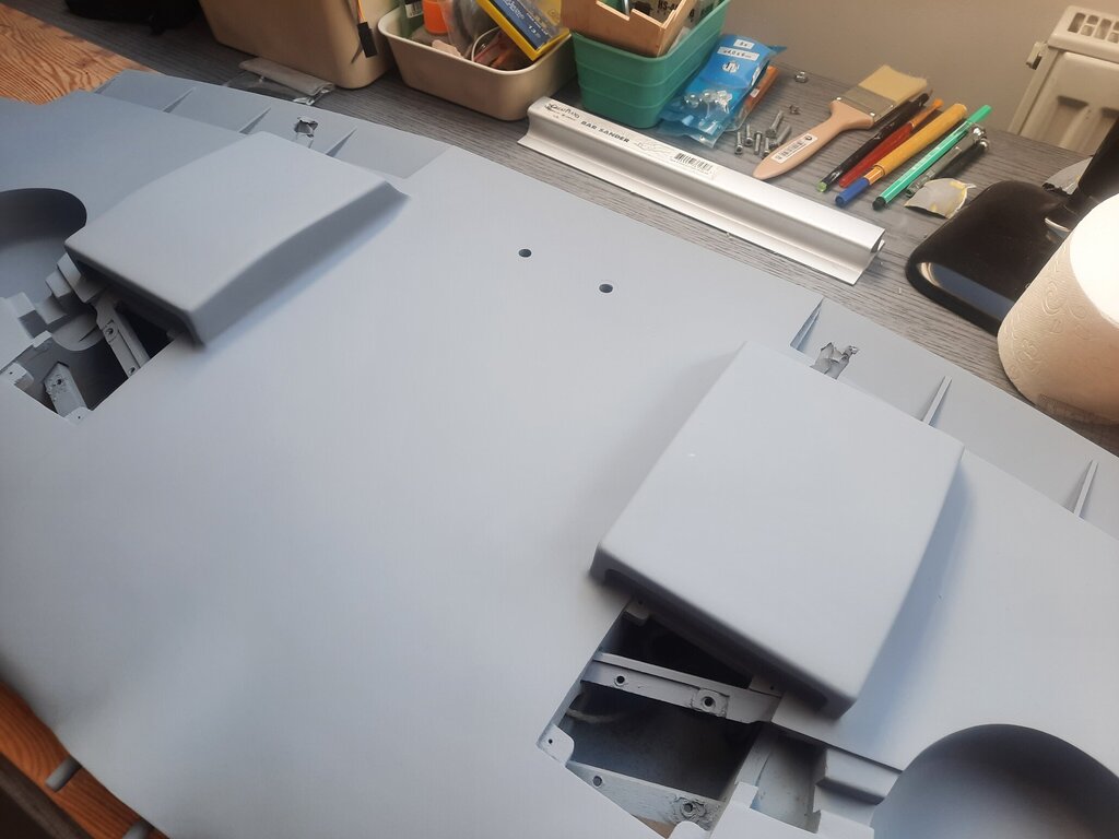 Bardzo dziękuję z miłe słowa. Ostatnio niewiele zostało zrobione - po oznaczeniach zrobiłem linie paneli z jednomilimetrowej (a fragmenty trzymilimetrowej), czarnej tasiemki i pomalowałem całość przeźroczystym matem. Dzięki matowi naklejane oznaczenia już się tak nie świecą i nie wyróżniają i całość wygląda bardziej spójnie. Cały czas mam problem z kabiną. Wklejenie aluminiowej blaszki nie zadziałało jak należy. Wziąłem zbyt cienką, zbyt wiotką blaszkę i owiewki nie da się trwale dopasować. Będę walczył dalej... -