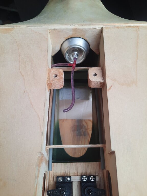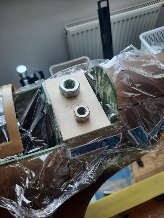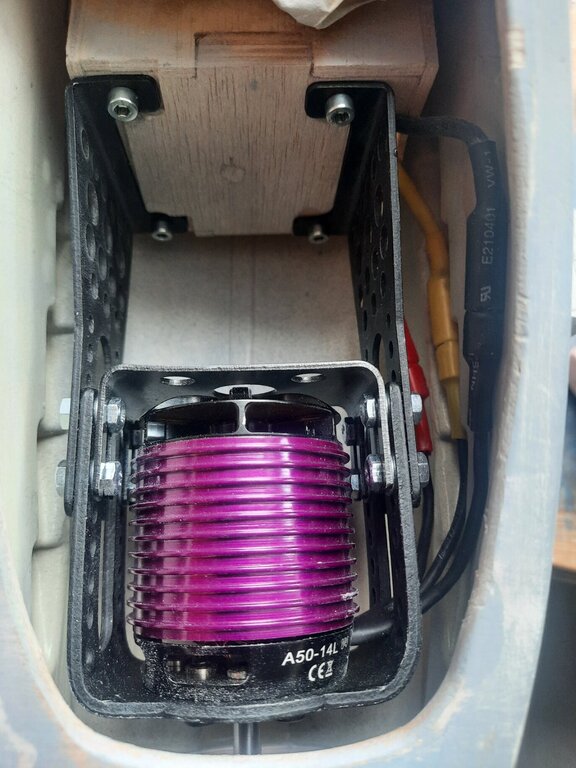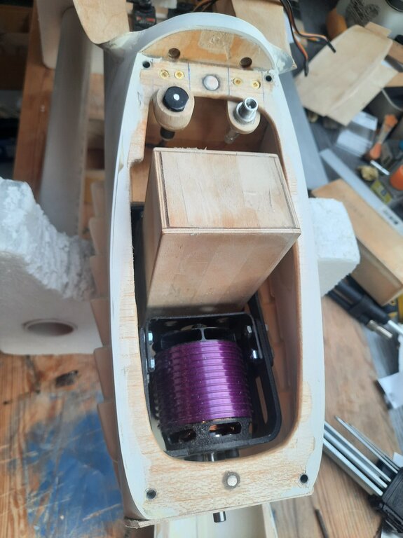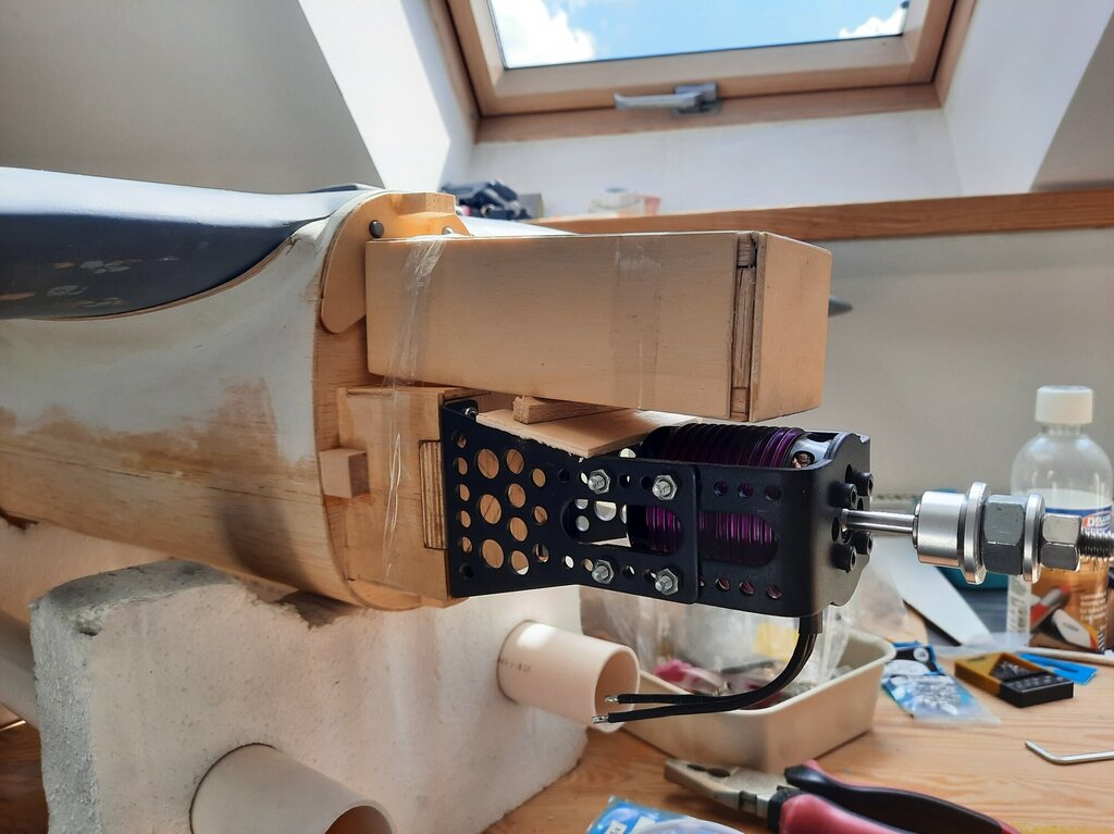 Skrzydło zostało zalaminowane przy użyciu Eze-Kote i dostało warstwę podkładu. Gdyby rzeczywistość była taka jak na zdjęciach to byłbym bardzo zadowolony, niestety jest sporo gorsza. Widać łączenia poszczególnych pasków poszycia, widać garb na dźwigarze. Również krawędź natarcia ma jakiś kiepski, kanciasty profil - ewidentnie niedoszlifowany. Wyszło tak sobie, gorzej niż bym sobie życzył. Mam nadzieję, że po szlifie i drugiej warstwie przynajmniej łączenia znikną lub chociaż będą mniej widoczne. Poczyniłem pierwsze kroki z kokpitem. 'Firmowy' kokpit TopFlite składa się z kilku topornych elementów formowanych próżniowo. Zostały wycięte, dwa z nich podkleiłem balsą, skleiłem również drążek z dwóch połówek. 'Jakość' kokpitu widać chociażby po zegarach - na naklejce jest ich więcej niż w plastikowym elemencie. Mocno mnie to zdziwiło, do czasu aż wstępnie zamontowałem elementy w kadłubie. Okazało się, że cały kokpit jest tak wąski, że boki by po prostu przykrywały skrajne zegary. Stąd też pewnie decyzja by ze skrajnych zegarów zrezygnować. Na naklejce jednak pozostały. Przyszedł już czas aby się w końcu zdecydować co robić z silnikiem. W zestawie jest łoże do silnika spalinowego. Nie znalazłem jednak żadnego patentu jak by można było zamontować do takiego łoża silnik elektryczny. Planuję więc przesunąć wręgę silnikową poprzez przedłużenie tej kwadratowej konstrukcji, tak aby można było silnik przykręcić bezpośrednio do niej. Będzie przy okazji więcej miejsca za wręgą na manewrowanie pakietem. Zrobiłem wstępny prototyp tej 'przedłużki', wydaje mi się, że jest szansa, że takie coś się sprawdzi. Docelową przedłużkę planuję zrobić już pod konkretny silnik. Mam więc dwa pytania. Przede wszystkim - czy dobrze kombinuję? Ma to sens? I drugie - silnik. Mam już śmigło - 4x16x8. Na podstawie danych mi rad (za wszystkie bardzo dziękuję) wybrałem następujący: - Hacker A50-12L - 1650 W - 355 U/min-1 (kv) - 445 g https://www.hacker-motor-shop.com/Brushless-Motors/Hacker-Outrunner/Hacker-A50/A50-14pol/A50-12-L-V4-kv355.htm?shop=hacker_e&SessionId=&a=article&ProdNr=15726840&p=6681 Jest jednak chyba dosyć ciężki. Jest lżejszy: - Hacker A50-16S - 1250 W - 365 U/min-1 (kv) - 345 g https://www.hacker-motor-shop.com/Brushless-Motors/Hacker-Outrunner/Hacker-A50/A50-14pol/A50-16-S-V4-kv365.htm?shop=hacker_e&SessionId=&a=article&ProdNr=15726839&p=6681 Czy któryś z nich będzie dobry? Który lepszy? -