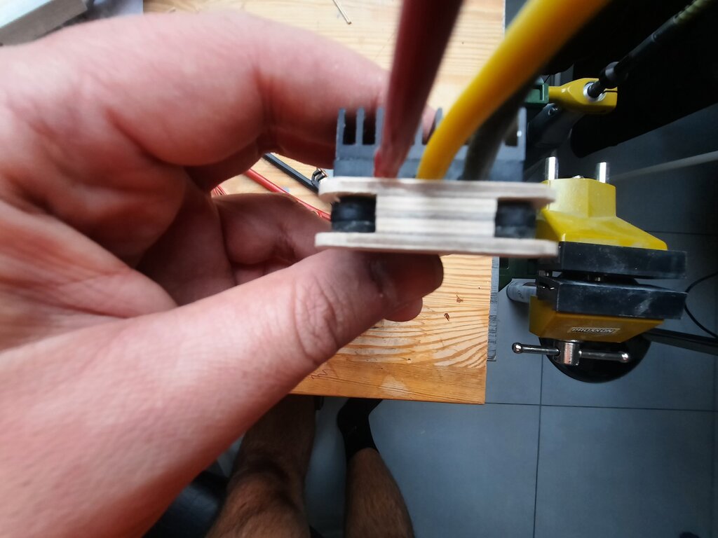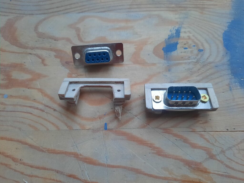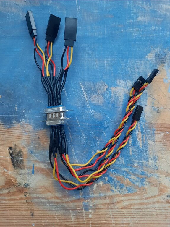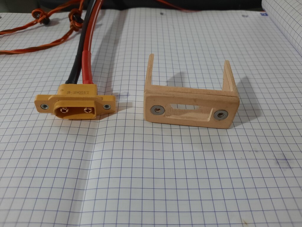 Poczytałem różne fora i faktycznie idea by zasilanie szło jedną parą pinów jest dosyć popularna. Szczególnie poważnie podeszli do tego twórcy takich złącz. Na woltaż pokaźne piny, na sygnały już mniejsze. Cena iście modelarska - stówka za parkę. Może i bym się zastanawiał gdyby nie to że d-suby już mam. A więc: - zrobiłem ramki do d-subów - wkleiłem złącze z ramką w kadłub stycznie do krzywizny skrzydła - po wyschnięciu podłączyłem drugą część złącza z ramką - posmarowałem drugą ramkę żywicą - przykręciłem skrzydło - całość ustawiłem tak by żywica nie spływała w nieodpowiednie miejsca i pozwoliłem wyschnąć, nie dałem żywicy dużo, tylko tyle aby ramka została złapana w odpowiednim miejscu Po wyschnięciu odkręciłem śruby trzymające skrzydło, staram się je wyciągnąć, a ono ani drgnie. Super, myślę, gdzieś nie dochowałem żywicowej higieny i jednak się przykleiło. No to się siłuję, delikatnie podważam - w końcu puściło. Patrzę - wszystko czyste, żadnego śladu po zbędnym kleju. No to próbuję je znowu zamontować a tu się okazuje, że złącza nie trafiają w siebie o dobre kilka milimetrów - może dwa, może trzy. Naciągam, dociskam - nie ma szans. W końcu odpadła ramka w skrzydle (mało żywicy). Porażka na całego. Trochę mi zapał opadł ale mimo wszystko (zgodnie z planem) polutowałem sobie kabelki. Mam te dziewięć pinów, i tak za dużo, nie było co oszczędzać ich na współdzielenie zasilania - wlutowałem trzy przedłużacze. Może trzeci się przyda. Przyszedł czas na poprawę ramek. Jak już w skrzydle jednej nie było i nie miało co przeszkadzać, zrobiłem krok w tył i spokojnie popatrzyłem jak wystające z kadłuba gniazdo chowa się w skrzydle - wcale nie prostopadle do stycznej skrzydła. Profil skrzydła nie ma tu żadnego znaczenia. Tym razem wziąłem linijkę, przyłożyłem jeden koniec do wręgi kadłuba tam gdzie wchodzą kołki od skrzydła i ona mi wyznaczyła płaszczyznę na jakiej ma się znaleźć ramka. Oczywistość! Zmieniłem więc położenie ramki w kadłubie i powtórzyłem całą operację. Tym razem wszystko pasowało gładko. Dodałem na koniec jeszcze trochę żywicy w miejsca, które wyglądały słabo i chyba jest dobrze. Zmieniłem jeszcze położenie wentyla od pneumatyki. Poprzednie zabierało za dużo miejsca i utrudniałoby podłączanie baterii. Do regulatora nie mam jeszcze wlutowanego konektora do baterii. Chyba wlutuję i przykręcę do jakiegoś uchwytu coś takiego. -