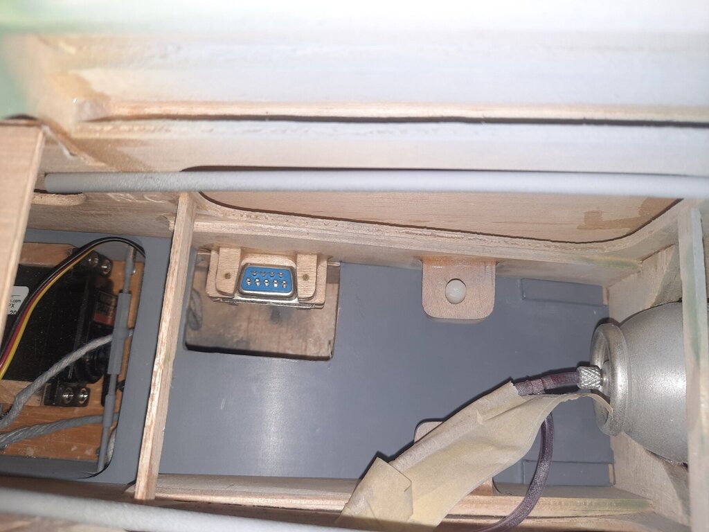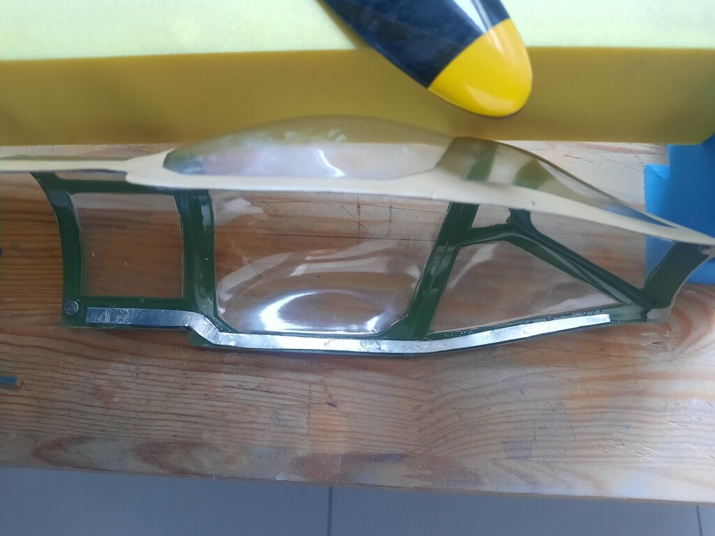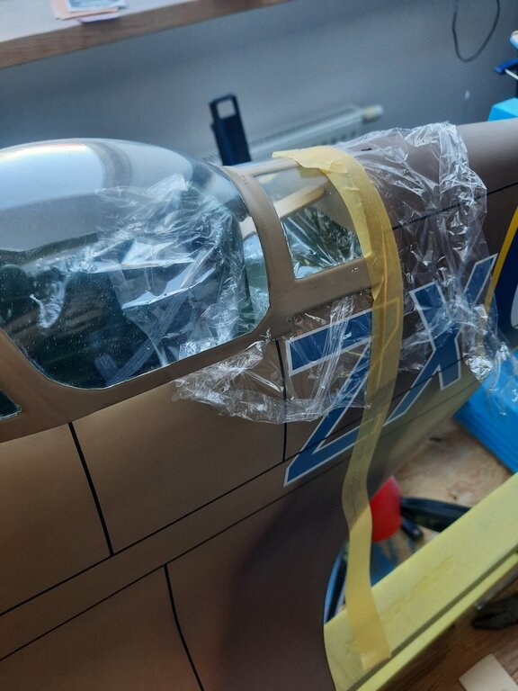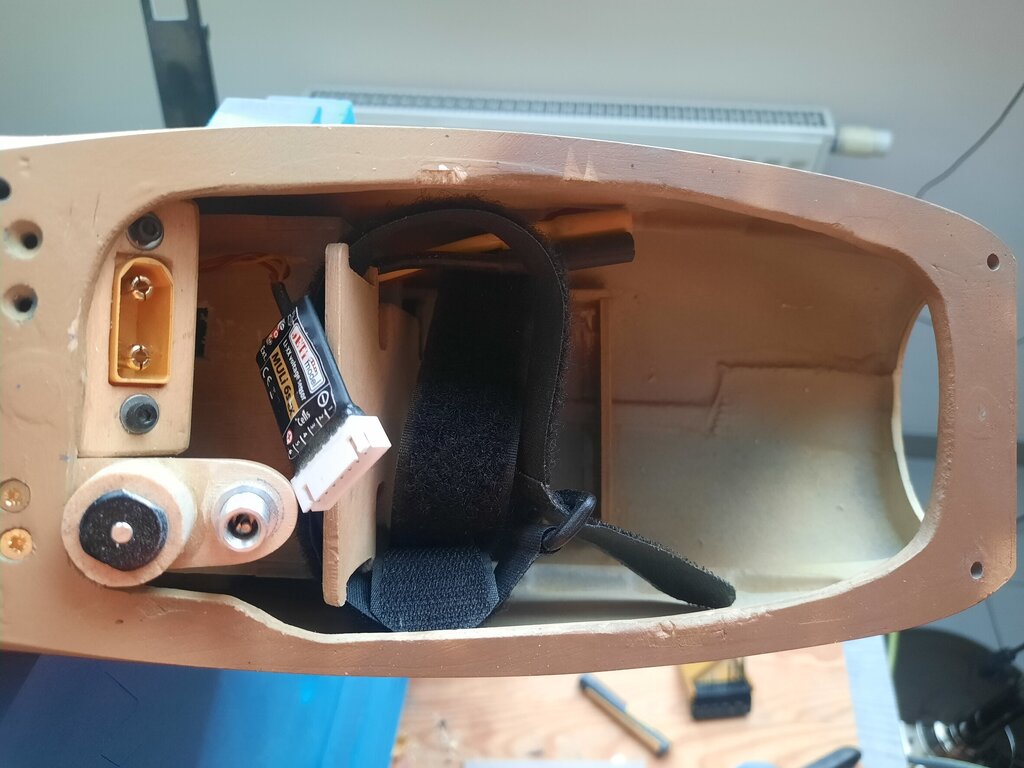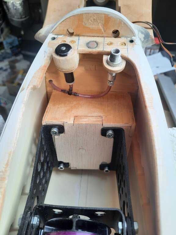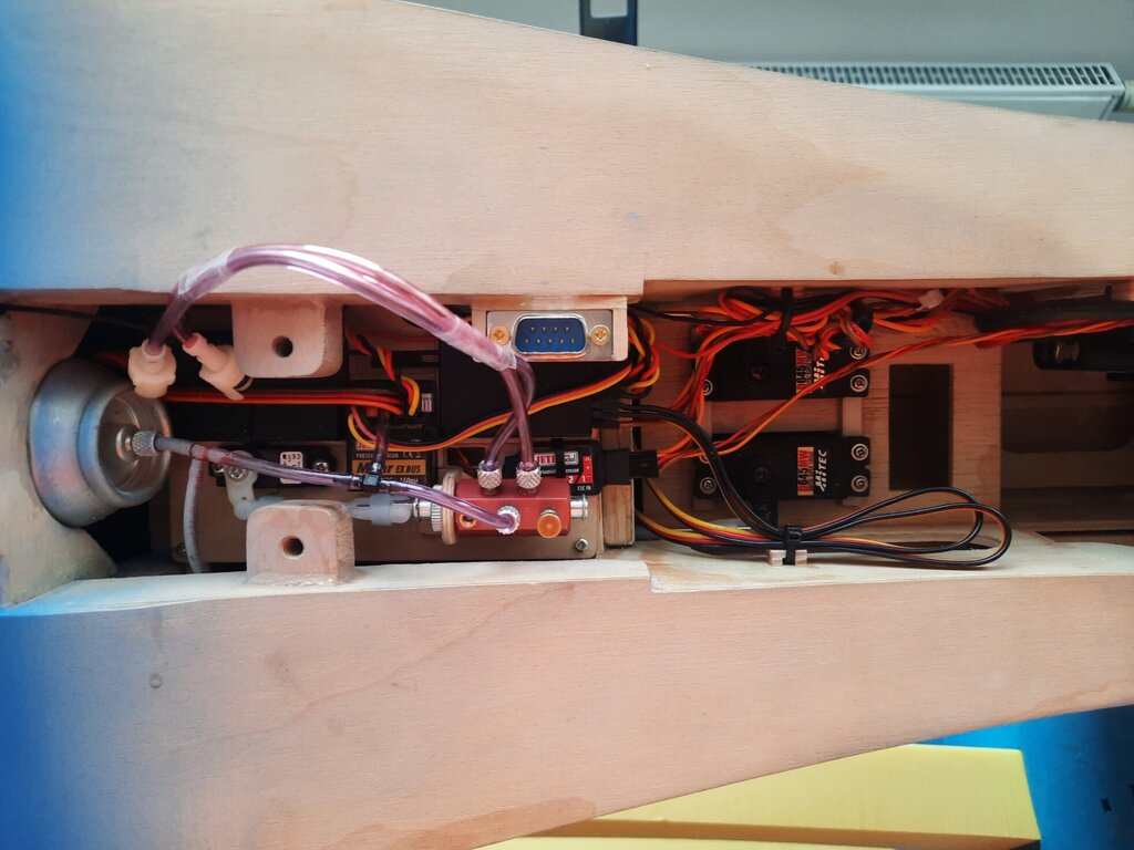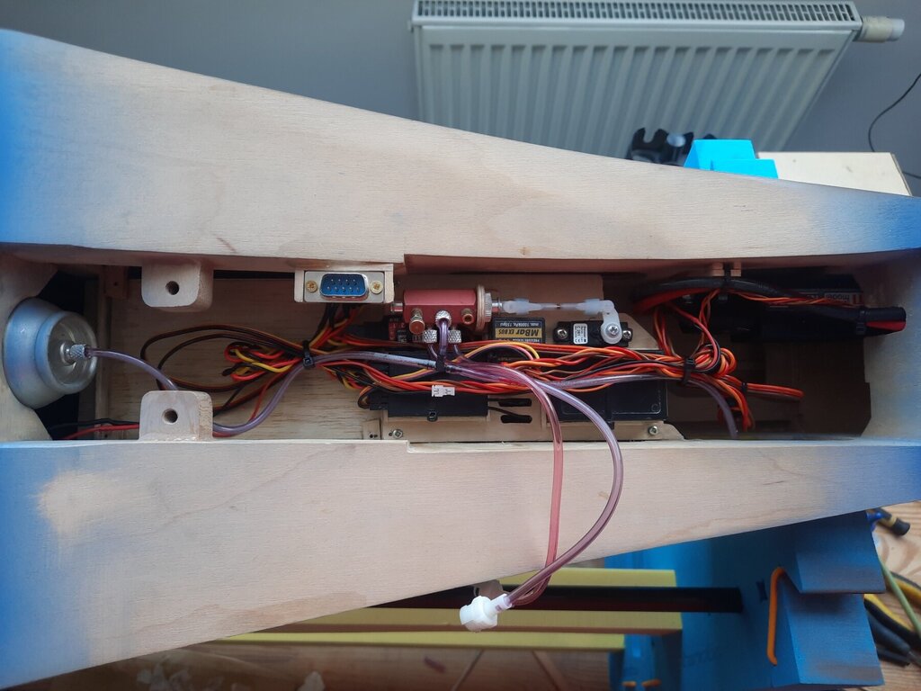 Została ogarnięta cała instalacja w kadłubie. Zamontowałem włącznik - wcześniej miał być pod osłoną silnika, finalnie trafił do kabiny - będzie bardziej dostępny gdy samolot będzie stał na kołach. Pod osłonę silnika, blisko akumulatora trafił sensor napięcia. Płytka z elektroniką została przykręcona w kadłubie. Dodałem dwa dodatkowe zaczepy i ogarnąłem trytytkami wszystkie kable tak by nie było szans na kontakt z serwami. Jak wcześniej wspominałem połączenie ze skrzydłem będzie przez złącze d-sub9 które jest również zamontowane. Całość instalacji domyka pneumatyka, która będzie połączona ze skrzydłem przy pomocy dwóch szybkozłączek. Szybkozłączki są 'damskie' i 'męskie' i zostały zamontowane na przemian. Jedna mieszana para jest w kadłubie, druga mieszana para w skrzydle - nie będzie można się pomylić przy podłączaniu. Jestem w trakcie kolejnego podejścia do owiewki. 'Technika' którą tu obmyśliłem polega na tym że przykładam kawałek sklejki do kadłuba, odrysowuję ją i potem docinam. Następnie unieruchamiam taki kawałek w kadłubie, smaruję żywicą, nakładam owiewkę i pozwalam by wyschło. Dopasowanie sklejki do owiewki jest takie sobie, raczej mało dokładne ale żywica wypełnia braki. Żeby nie przykleić owiewki do kadłuba stosuję folię, którą znalazłem w kuchni. Proces żmudny i długotrwały bo każdy kolejny element jest dokładany dopiero gdy poprzedni dobrze wyschnie - czyli kolejnego dnia. Przykleiłem tak na razie trzy elementy i wygląda że pomysł może się sprawdzić. Jak wszystko wykleję zacznę wycinać sklejkę tak by została tylko ramka. Coś podobnego zrobiłem w przypadku osłony silnika. Mam nadzieję, że tu zrobię to trochę ładniej. Zobaczymy. -