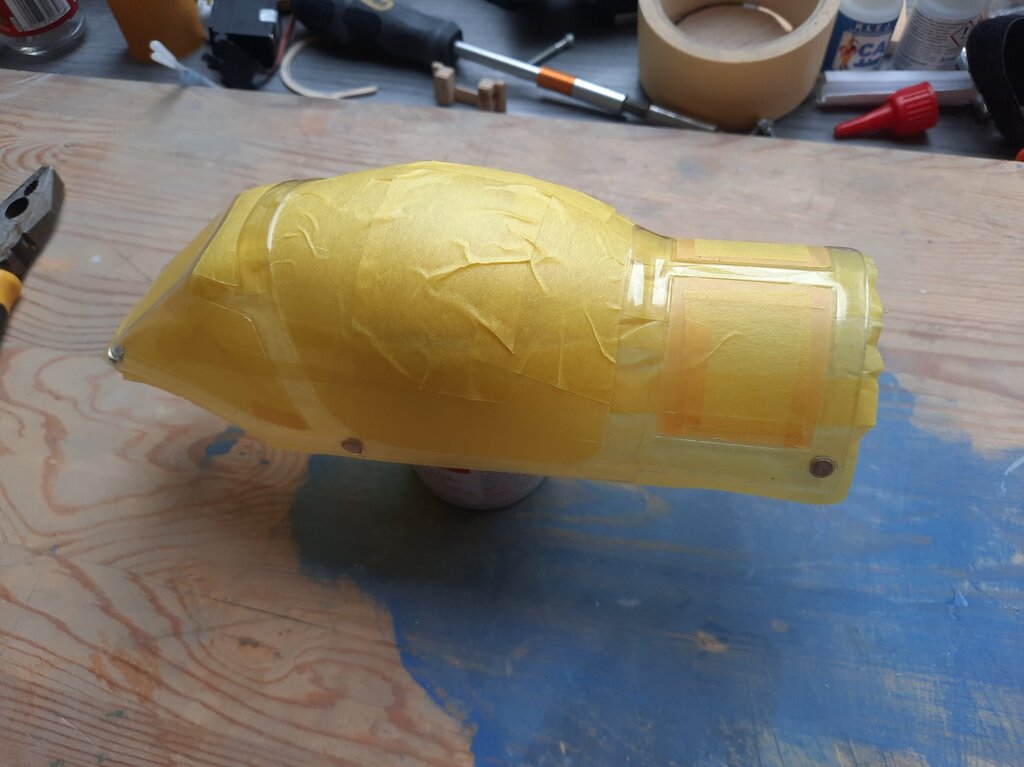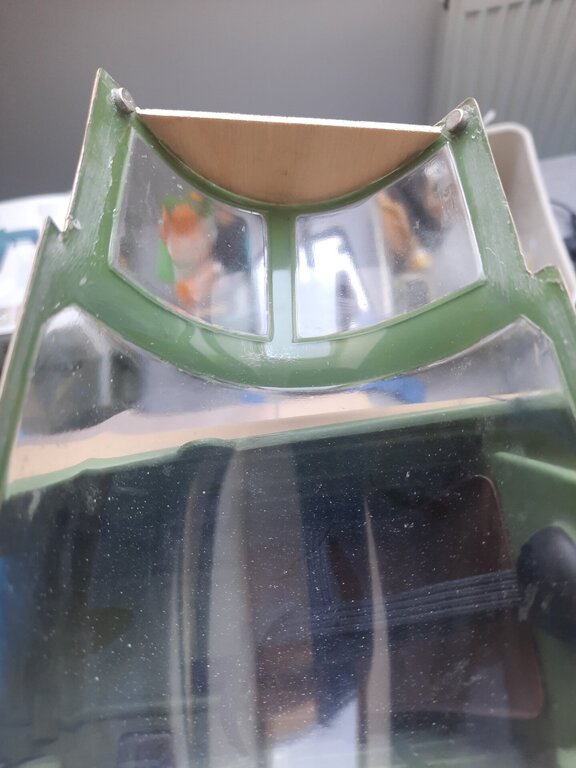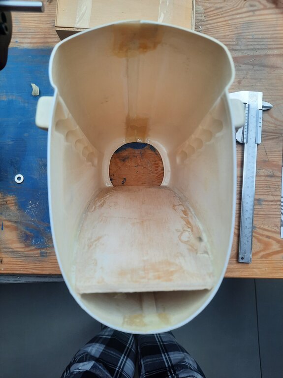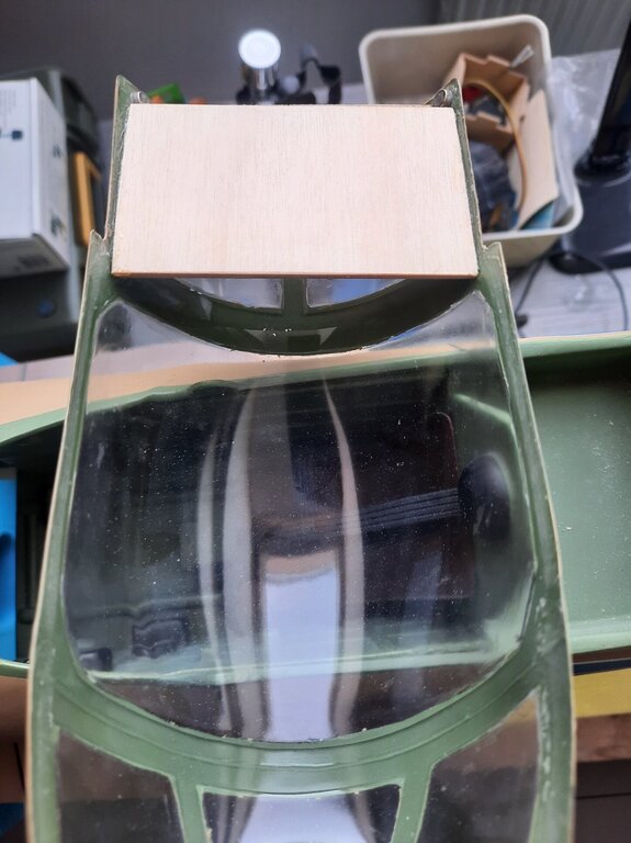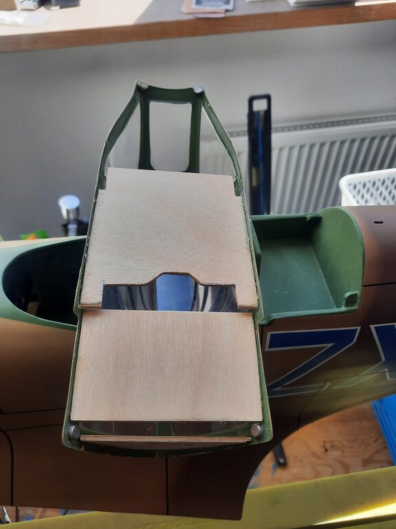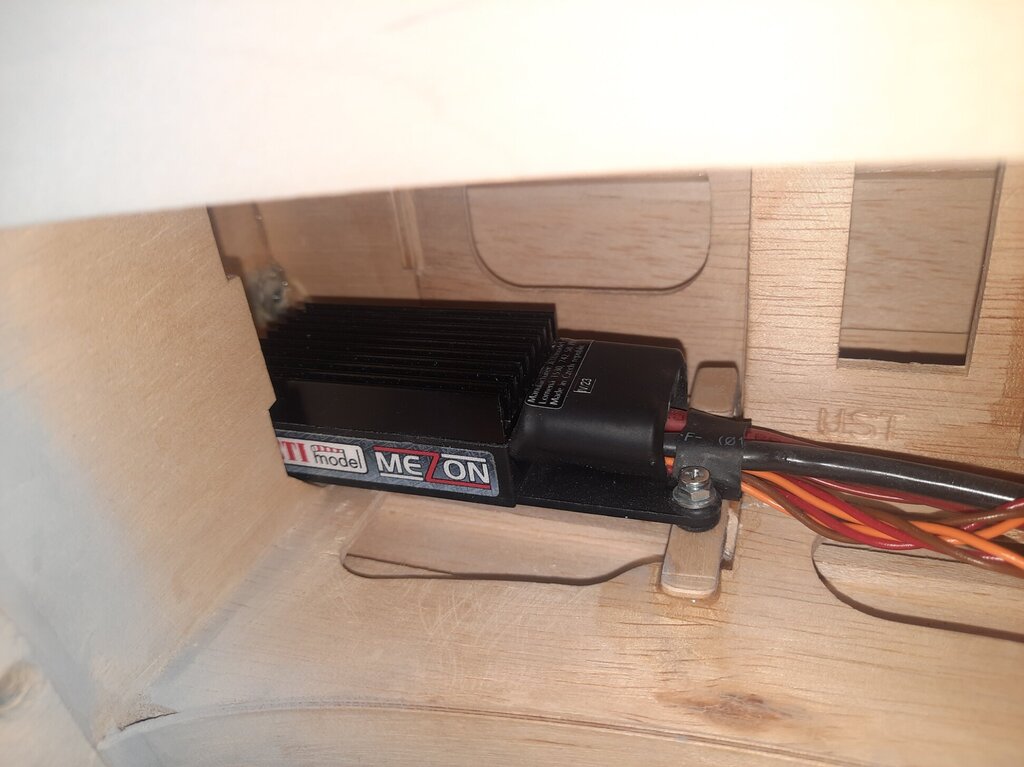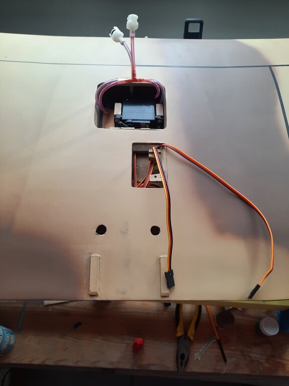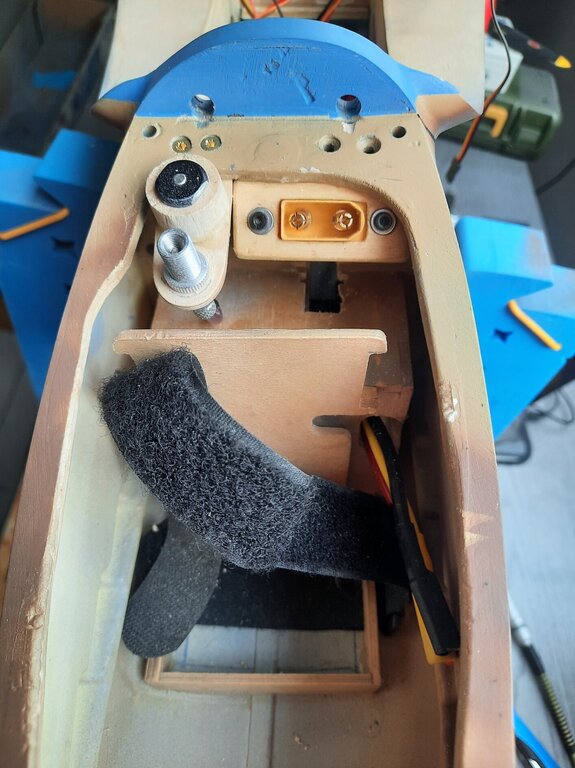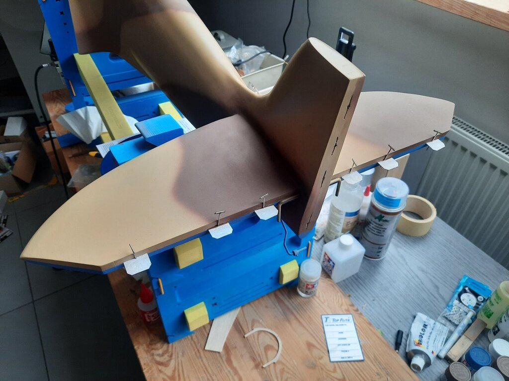 Została ogarnięta cała instalacja w kadłubie. Zamontowałem włącznik - wcześniej miał być pod osłoną silnika, finalnie trafił do kabiny - będzie bardziej dostępny gdy samolot będzie stał na kołach. Pod osłonę silnika, blisko akumulatora trafił sensor napięcia. Płytka z elektroniką została przykręcona w kadłubie. Dodałem dwa dodatkowe zaczepy i ogarnąłem trytytkami wszystkie kable tak by nie było szans na kontakt z serwami. Jak wcześniej wspominałem połączenie ze skrzydłem będzie przez złącze d-sub9 które jest również zamontowane. Całość instalacji domyka pneumatyka, która będzie połączona ze skrzydłem przy pomocy dwóch szybkozłączek. Szybkozłączki są 'damskie' i 'męskie' i zostały zamontowane na przemian. Jedna mieszana para jest w kadłubie, druga mieszana para w skrzydle - nie będzie można się pomylić przy podłączaniu. Jestem w trakcie kolejnego podejścia do owiewki. 'Technika' którą tu obmyśliłem polega na tym że przykładam kawałek sklejki do kadłuba, odrysowuję ją i potem docinam. Następnie unieruchamiam taki kawałek w kadłubie, smaruję żywicą, nakładam owiewkę i pozwalam by wyschło. Dopasowanie sklejki do owiewki jest takie sobie, raczej mało dokładne ale żywica wypełnia braki. Żeby nie przykleić owiewki do kadłuba stosuję folię, którą znalazłem w kuchni. Proces żmudny i długotrwały bo każdy kolejny element jest dokładany dopiero gdy poprzedni dobrze wyschnie - czyli kolejnego dnia. Przykleiłem tak na razie trzy elementy i wygląda że pomysł może się sprawdzić. Jak wszystko wykleję zacznę wycinać sklejkę tak by została tylko ramka. Coś podobnego zrobiłem w przypadku osłony silnika. Mam nadzieję, że tu zrobię to trochę ładniej. Zobaczymy. -