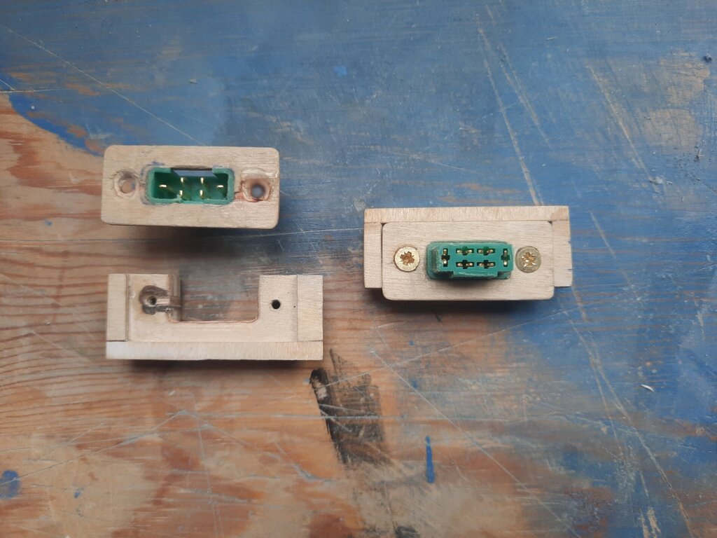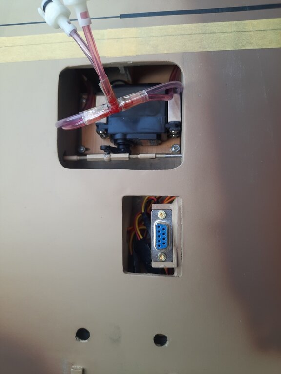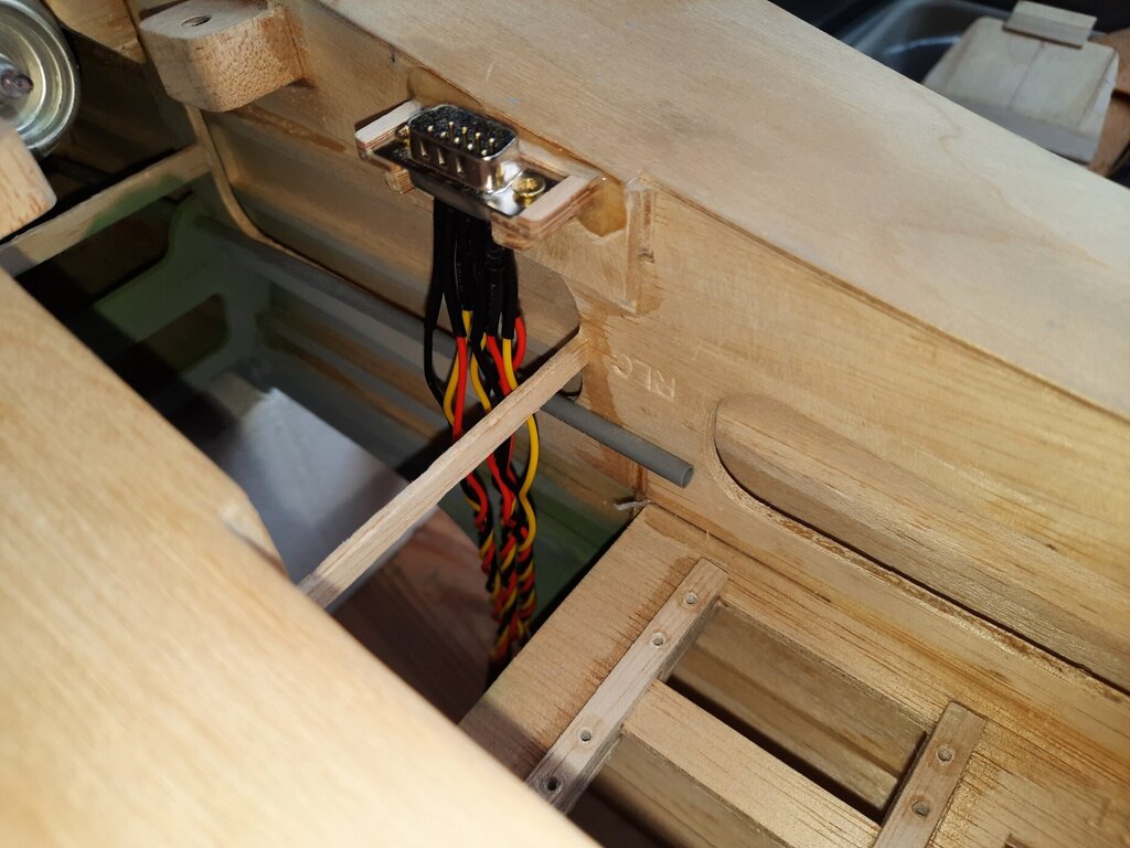Udało się zrobić kilka kolejnych kroków. Antena - zasadniczo sklejka oklejona balsą i sklejkowe gniazdo. Maska - zgodnie z moimi założeniami rozcięta na część górną i dolną. Generalnie męka, gdybym pozostawił tak jak to wymyślił producent to łączenie wyszło by mi bardzo brzydko. Pneumatyka - poprzedni pomysł na baterię upadł. Pojawił się nowy - zaraz za silnikiem. Powstało więc miejsce na wentyl i mechaniczny wskaźnik ciśnienia. Regulator - pod maską nie ma już miejsca, musiał trafić za firewall. Bateria będzie przesunięta w lewo (silnik jest przesunięty w lewo i skręcony w prawo) więc regulator został przesunięty w prawo. Kable nie mogą przechodzić przez środek firewalla bo będą kolidować z baterią. Muszą być poprowadzone poza obrysem mocowania silnika. Po prawej stronie jest trochę miejsca. Konektory nie przejdą, trzy dosyć grube kable już tak - w pionie. Regulator jest więc również w pionie - na prawej ściance. Powinien być zamocowany na czterech śrubach. Do dwóch jednak nie ma praktycznie w ogóle dostępu, do trzeciej jest ciężki, do czwartej w miarę ok. Będzie więc na jednej śrubie. Pozostałe, ogumowane oczka będą na wcisk. Uchwyt silnika musi być zamontowany po przeciągnięciu kabli. Montowanie całości jest dosyć uciążliwe ale w końcu kiedyś będzie zrobione po raz ostatni i tak pozostanie. Dalej - chcę zminimalizować uciążliwości z przyszłą obsługą. W szczególności z montowaniem skrzydła. Do podłączenia są dwa serwa i dwa wężyki od pneumatyki. Z pneumatyką chyba niewiele da się zrobić. Szkoda, że w tę stronę poszedłem - elektryczne podwozie byłoby znacznie wygodniejsze. Bez konieczności podłączania wężyków i bez pompowania. No ale trudno. Chcę aby przynajmniej dwa serwa podłączało się bezproblemowo. W moim sklepie dostałem tylko złącza mpx. Zacząłem z nimi kombinować aż w końcu dotarło do mnie, że wyglądają trochę jak już dawno zapomniane złącza w kompach - d-sub. No więc kupiłem złącza d-sub 9 - idealne na trzy serwa. Klapy, lotki i ... podwozie. Ehh, no nic, zobaczymy co z tego wyjdzie... -