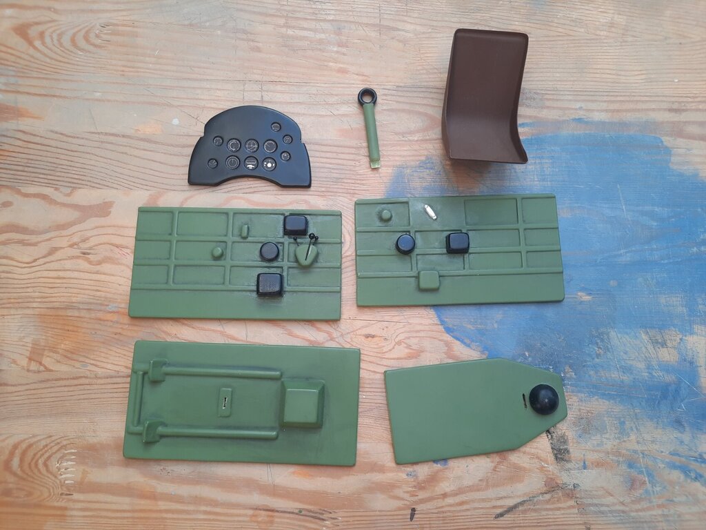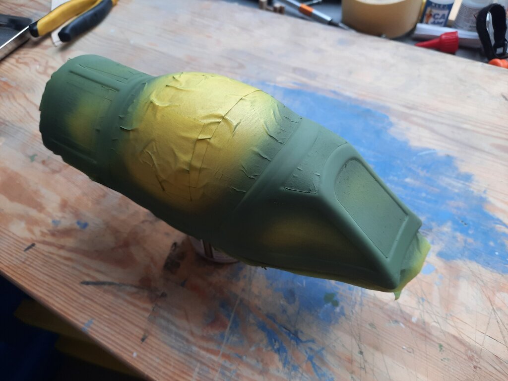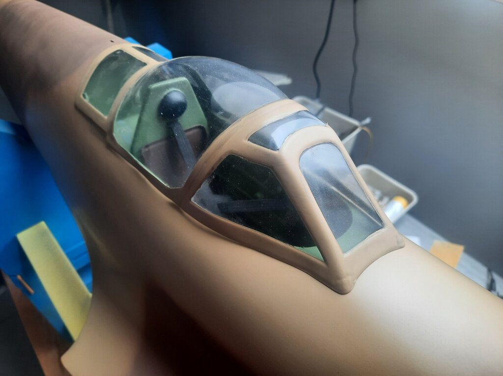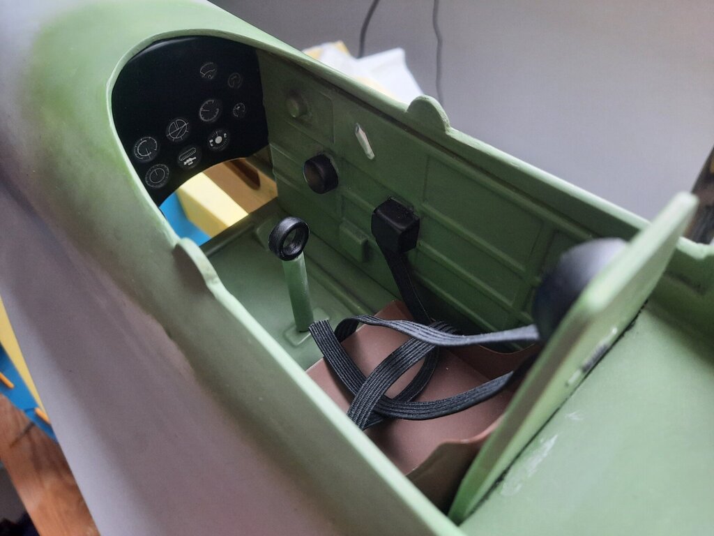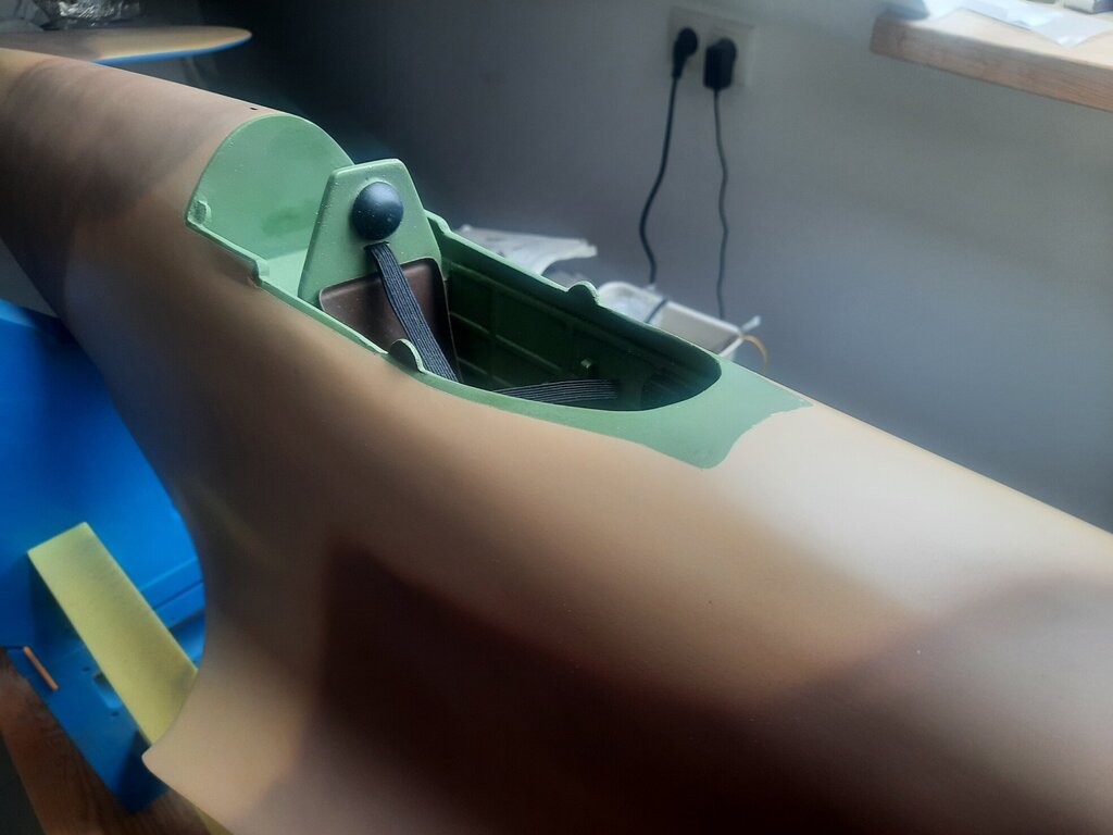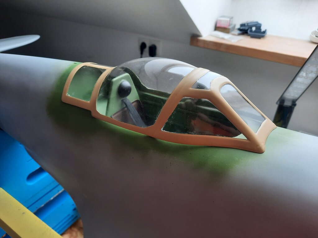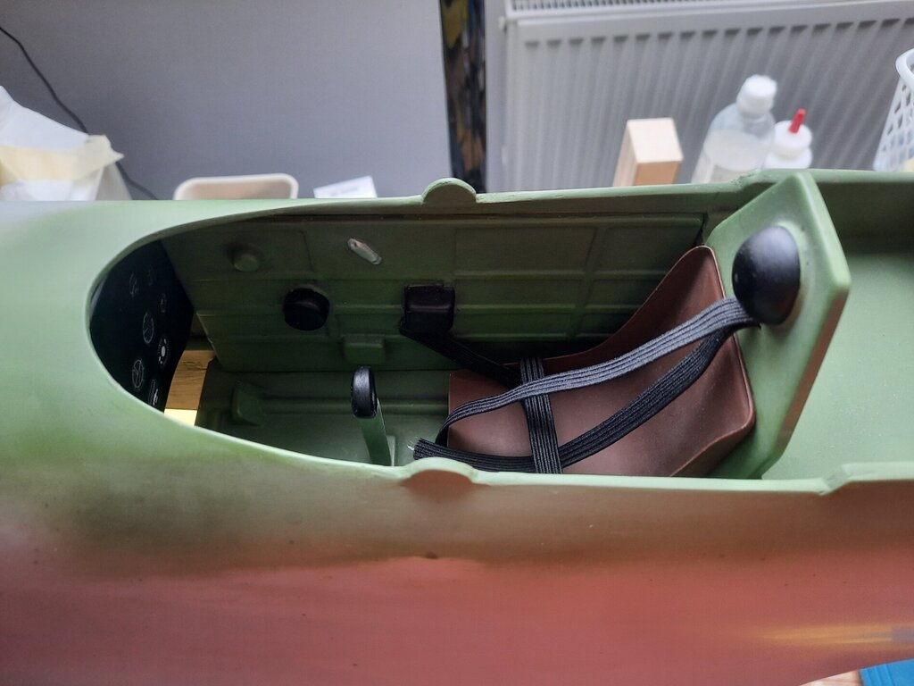 Kadłub został finalnie przygotowany do malowania. W pierwszej kolejności zabrałem się za kokpit. Zrobione wnętrze. Nie mam pojęcia do dalej z pasami. Gotowy zestaw nie miał żadnych zapięć czy chociażby imitacji - ot kawałek czarnej gumki. Pasy mają być wkomponowane w pilota i przypięte lub przyklejone. Na razie sobie po prostu dyndają. Do tego momentu nie zastanawiałem się nad pilotem. Prawdę mówiąc nie przepadam za figurkami. Zawsze bardziej podobały mi się gołe maszyny. Czy to w formie zaparkowanej czy nawet jeszcze lepiej w formie serwisowej - z bebechami na wierzchu. Ten model jednak nie jest po to by stać tylko uczestniczyć w akcji no i pilot pewnie by się przydał. Tym bardziej, że wygląda na to, że będę potrzebował 60 gramów balastu w okolicach kabiny. Aby móc podjąć później decyzję odnośnie pilota postanowiłem zrobić kabinę otwieraną. Przez moment chciałem by otwierana była tylko środkowa część. Szybko jednak uznałem, że to mi się raczej nie uda. Będzie więc mocowana na magnesy i ściągana w całości. Wkleiłem sześć par malutkich magnesów w owiewkę i kadłub. Kolejnym etapem miało być obrysowanie owiewki i zamaskowanie kadłuba tak by wewnątrz kabiny pozostawić wąski margines zielonego koloru. Niestety owiewka nie pasuje jak należy. Gdy była jeszcze przeźroczysta wydawało mi się, że szczeliny są niewielkie, teraz widać, że są bardzo duże. Słabo to wygląda, może jednak będzie trzeba owiewkę przykleić... -