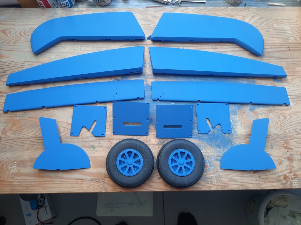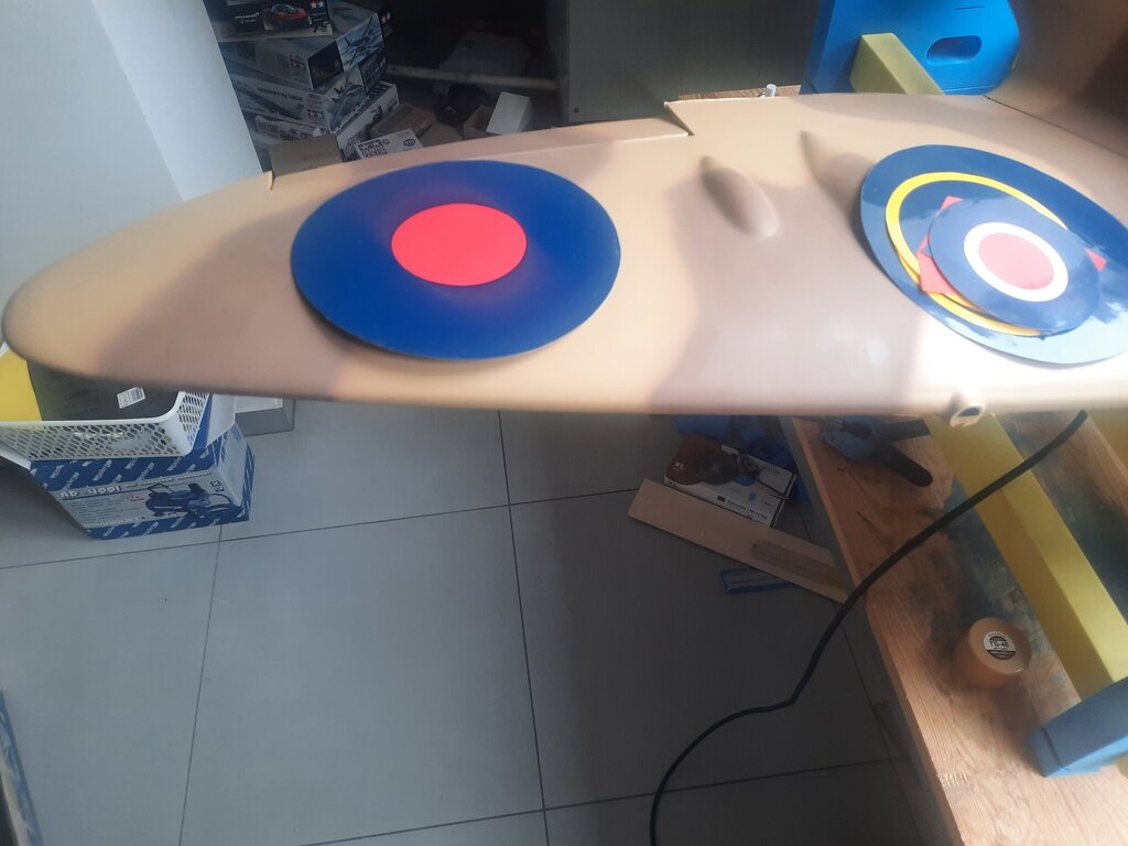 Przyszedł w końcu czas na malowanie. Na początek niebieski. Na zdjęciach wyszedł bardzo jaskrawy, w rzeczywistości jest intensywny ale nie aż tak. Potem maskowanie i najpierw kolor piaskowy potem brązowy. Kabina niestety nie pasuje jak powinna... Kolejny etap to naklejki dołączone do zestawu. Najpierw jednak muszę ogarnąć kolejną katastrofę. Jak widać malowanie i maskowanie folii oracover to nie był dobry pomysł. W pozostałych miejscach zero problemu, na folii dramat. Specjalnie wybrałem mat ale widać to za mało. Może powinienem ją bardziej zmatowić papierem ściernym przed położeniem? Gdybym chociaż użył srebrnej folii zamiast białej to może nawet miałoby jakiś urok. -
