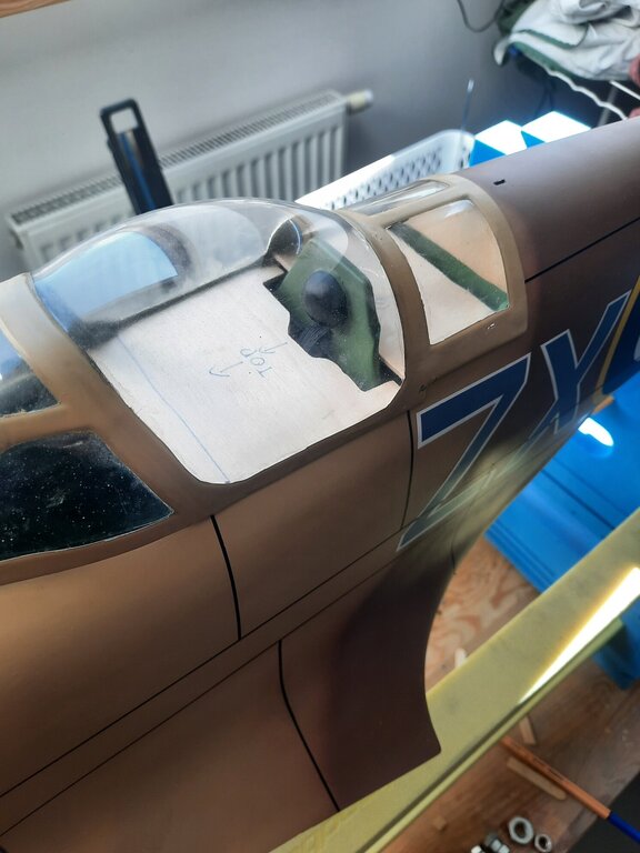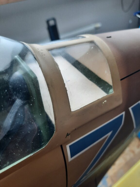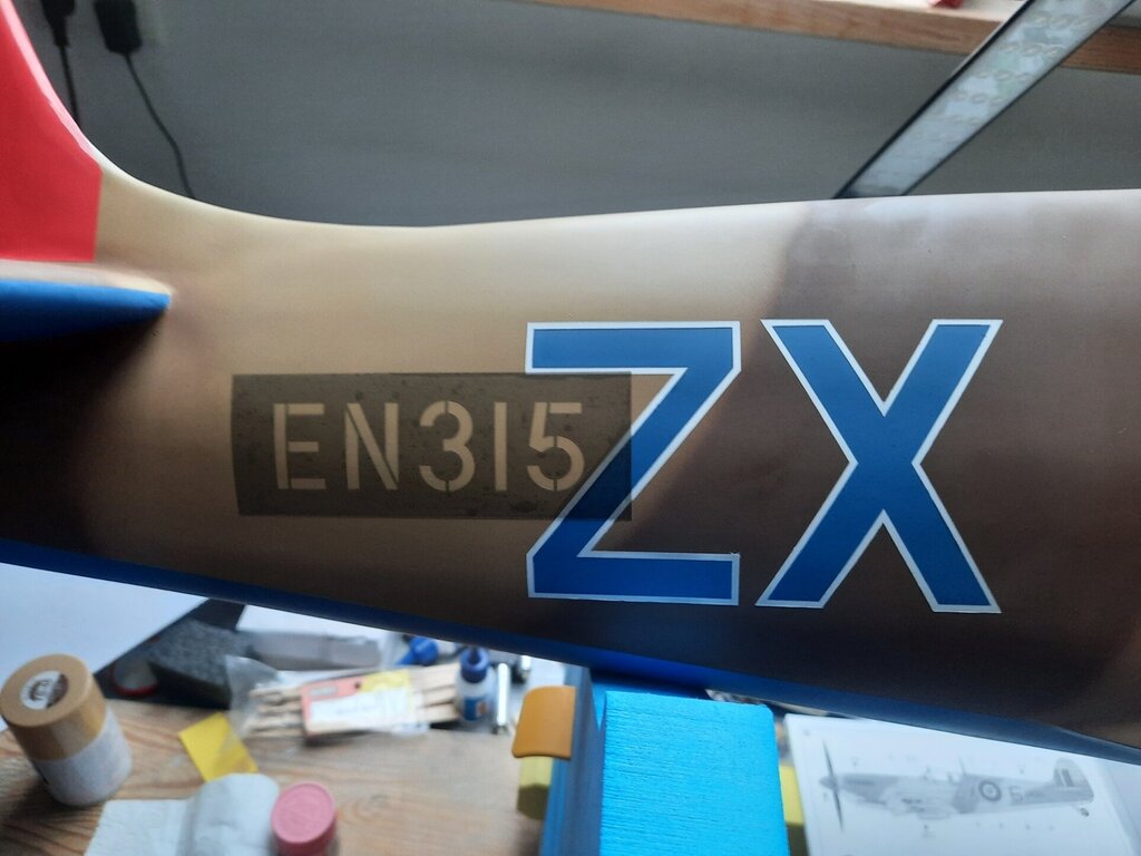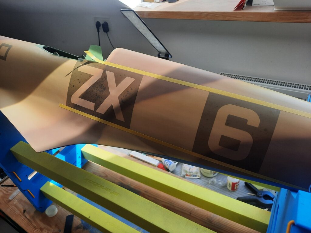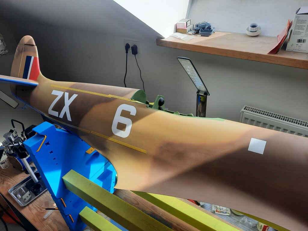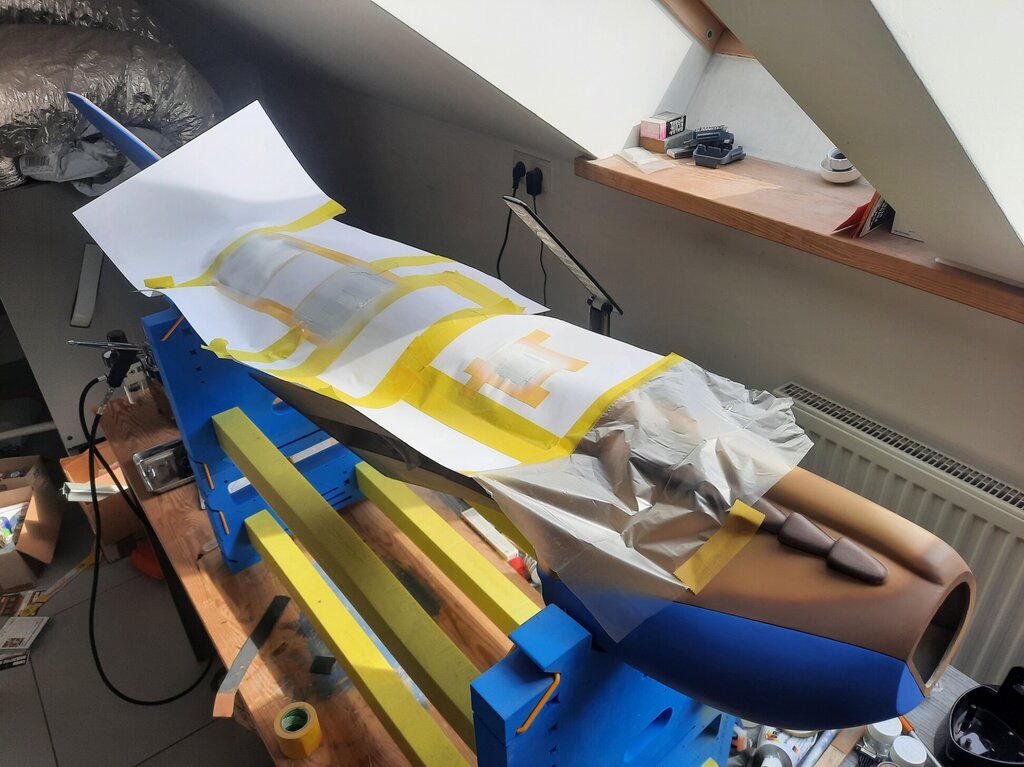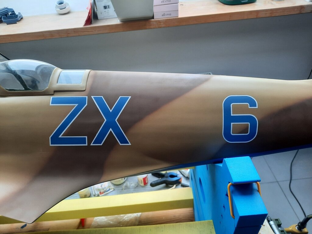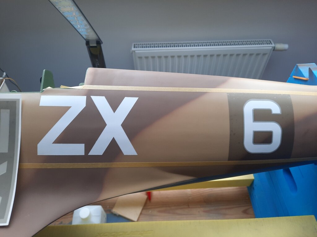 Wklejone zostały stery. Klapy na prawdziwych zawiasach, reszta na paseczkach zwanych w instrukcji zawiasami CA. Wnętrze klap pozostawiłem niepomalowane ? Oznaczenia z zestawu które pasowały do mojej wersji przykleiłem, brakujące zostały namalowane. Malowanie było tak przyjemne i dało tak dobry efekt, że teraz żałuję, że przykleiłem gotowe naklejki. Nie będę już ich zdzierał ale je również należało namalować. Naklejki z plastikowego zestawu Tamiya w skali 1/32 zostały zeskanowane, przerysowane w Corelu i przeskalowane o 410% i posłużyły do wycięcia na ploterze masek z folii oramask. Biało niebieskie litery i szachownice były malowane w dwóch warstwach i miały dwa zestawy masek. Całość odbyła się ze wsparciem poligrafii Mefisto z Wrocławia - serdecznie wszystkim polecam. Kontakt, wsparcie i przede wszystkim finalny efekt bardzo zadawalające. Aktualny stan prezentuje się następująco. W kabinę chyba faktycznie wkleję jakąś elastyczną blaszkę. Pewnie nie aluminiową bo poza głównym celem jakim jest uformowanie owiewki to jeszcze warto by reagowała z magnesami. Poza tym amelinium nie pomaluję... Obok owiewki kolejnym etapem będą jakieś linie paneli i może jakiś weather. -