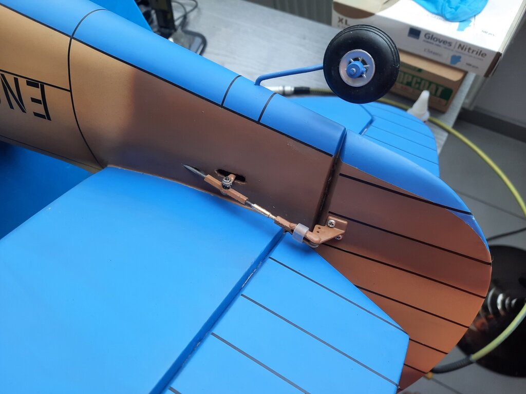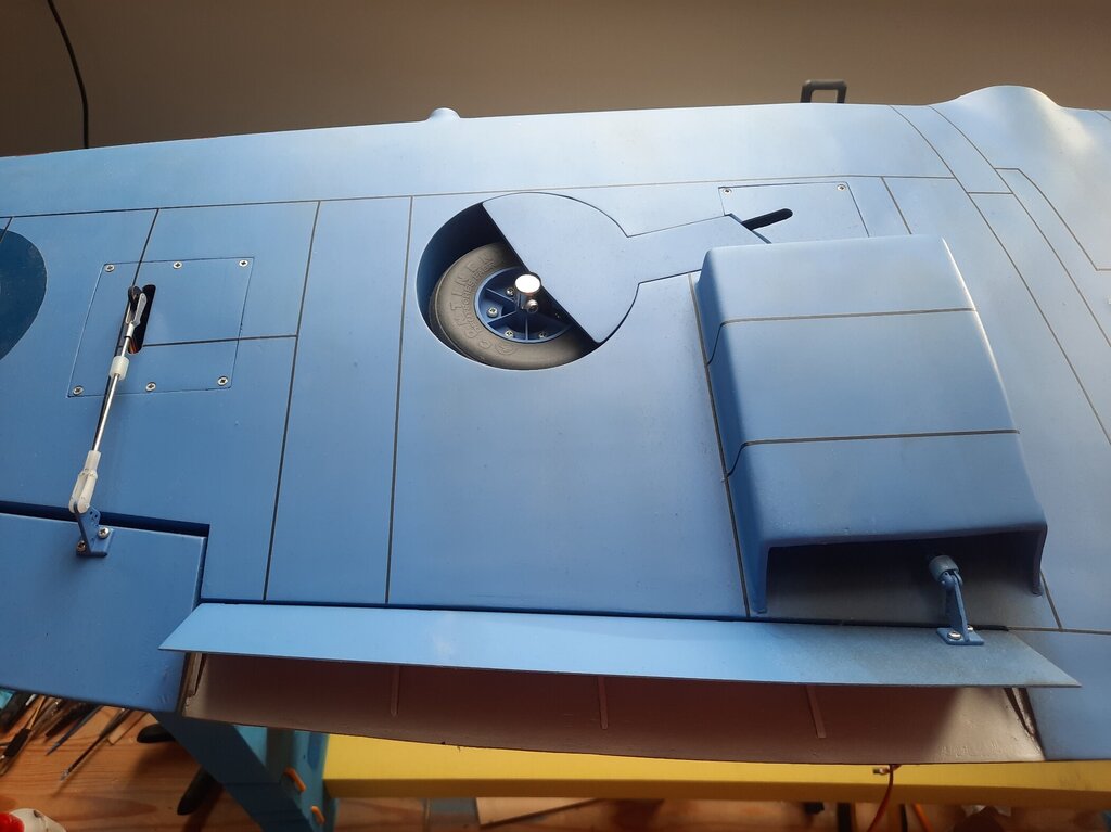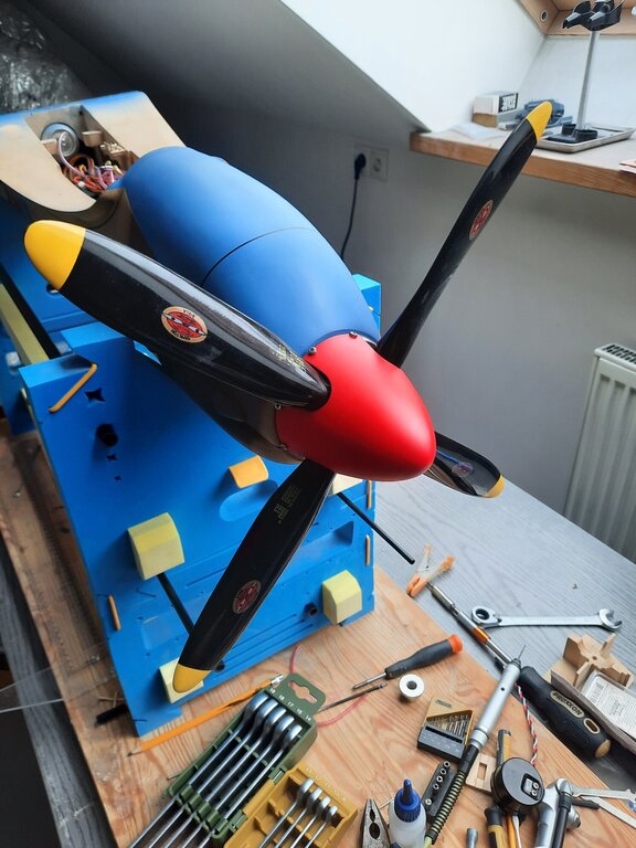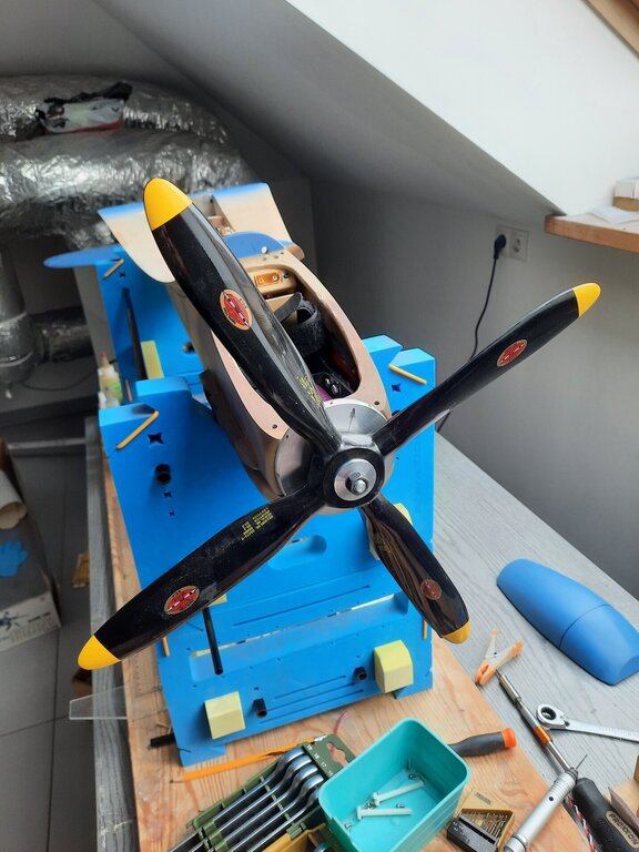 A to się nawet dobrze składa - jest dodatkowy karabinek. Nie ma co czekać, trzeba kończyć. Wyregulowałem zaworki w pneumatyce tak żeby podwozie sprawnie się wysuwało i chowało. Przykręciłem finalnie śmigło - wcześniej do ważenia było przykręcane byle tylko się trzymało. Przykręciłem też kołpak. Cegła gotowa do lotu. Teraz tylko poczekać do wiosny, znaleźć lotnisko oraz wsparcie. -
