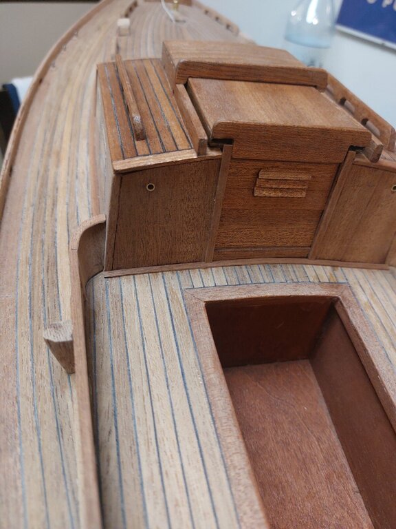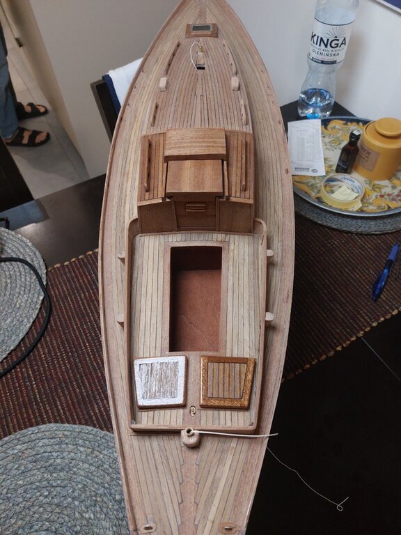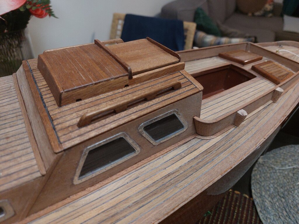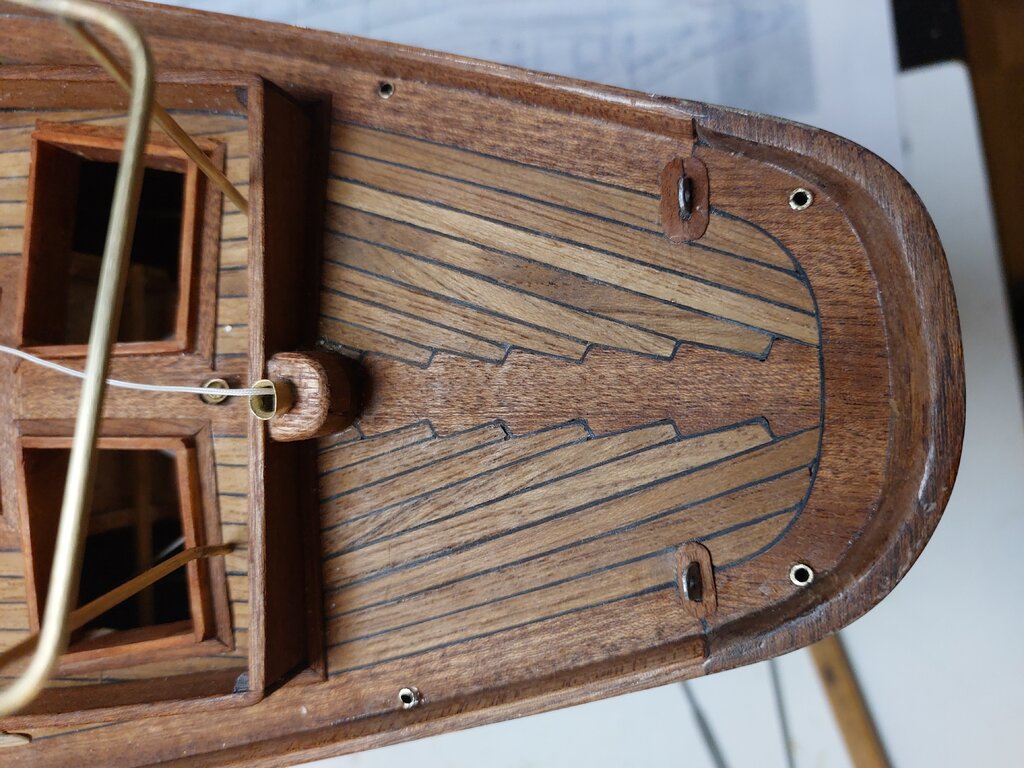 Prace nad detalami na pokładzie trwają, będzie tam sporo okuć, ale na razie zakońcczyć chcę prace z drewnem aby można było położych lakier. Dacg nadbudówki pomalowany juz został lakierem podkładowym (będzie klar). -