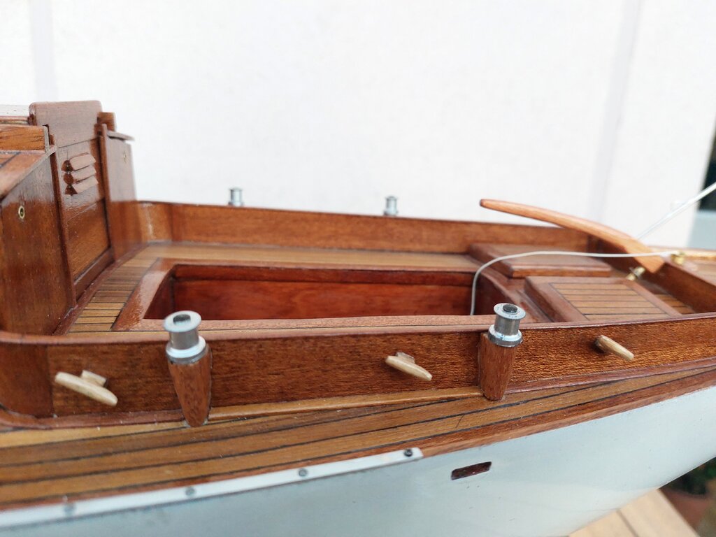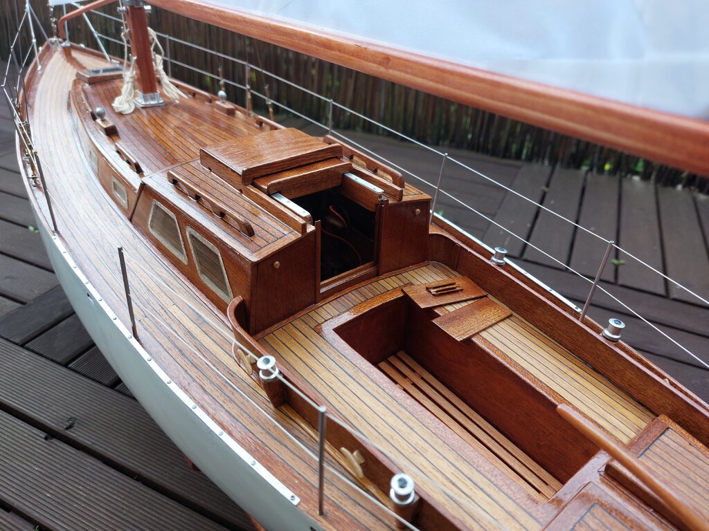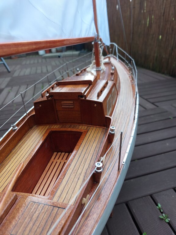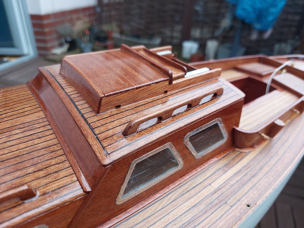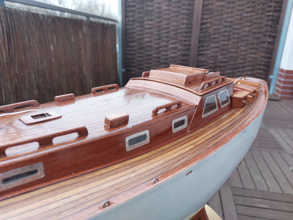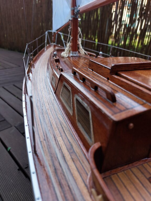 Zmieniłem malowanie kadłuba, w białym kolorze jest jej zdecydowanie lepiej, tzn mnie się bardziej podoba. Zresztą balsa jest trochę taka bez wyrazu, nie ma słojów jak sosna nawet bejcowana nie wygląda ciekawie, jest taka jednolita. Porównuję do kadłuba Omegi gdzie każda listewka jest inna i widać to nawet z dużej odległości co jest ładne. Położyłem również lakier na pokładzie i nadbudówce, czyli podkladowy na całości, na pokładzie z teaku lakier matowy, a na mahoń położyłem połysk. Jestem zadowolony z uzyskanego efektu. -