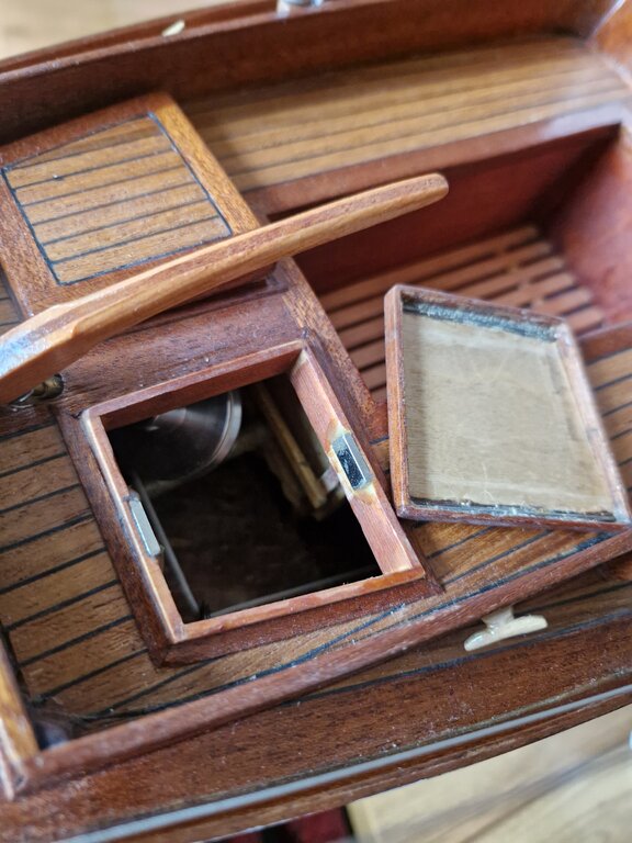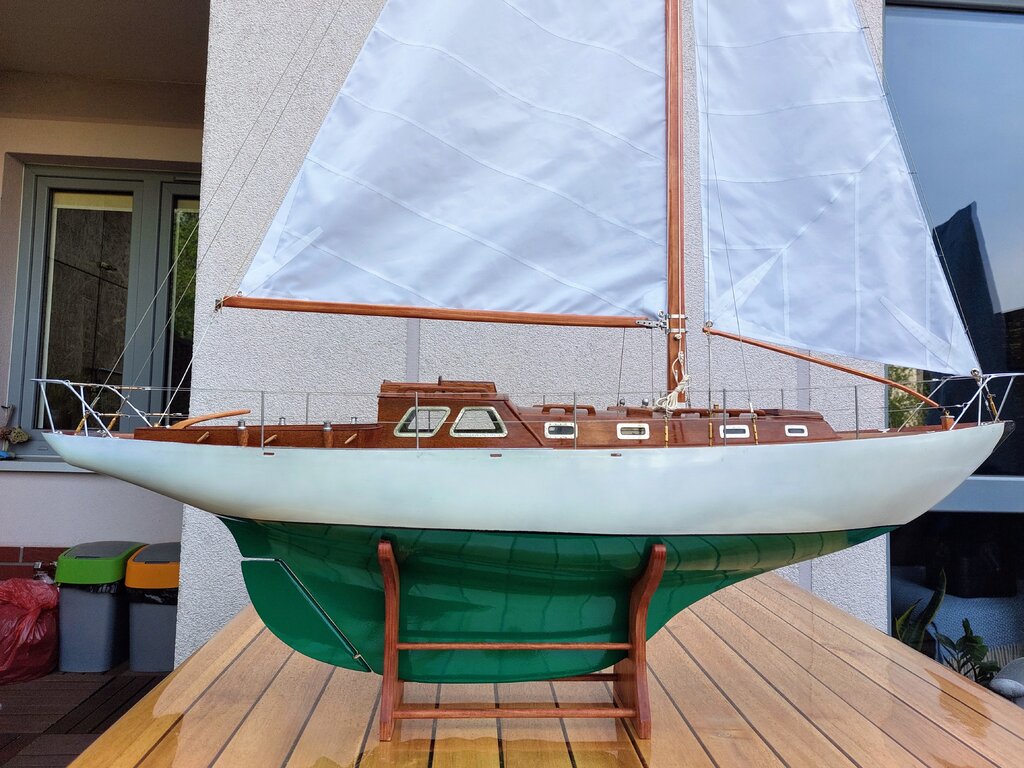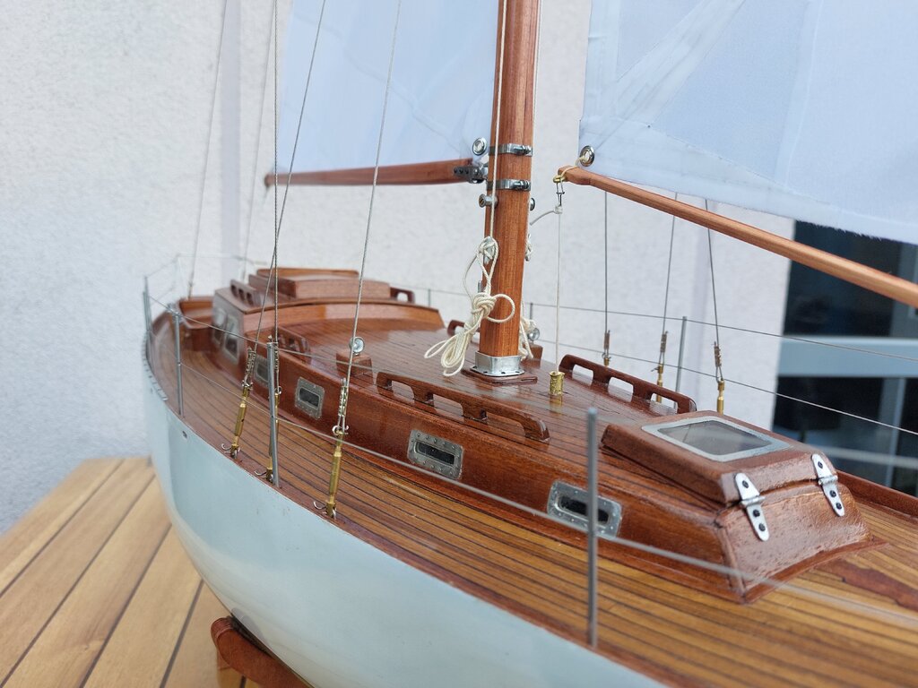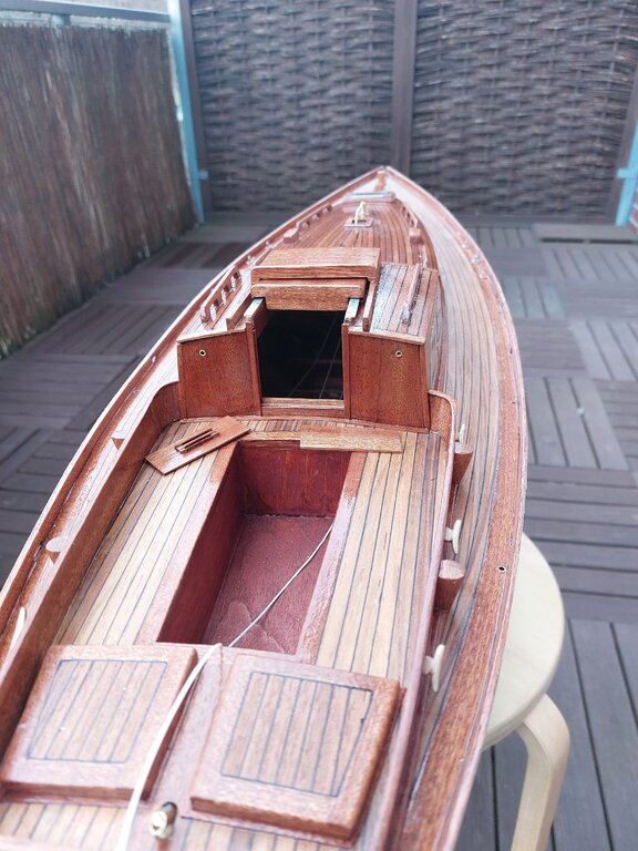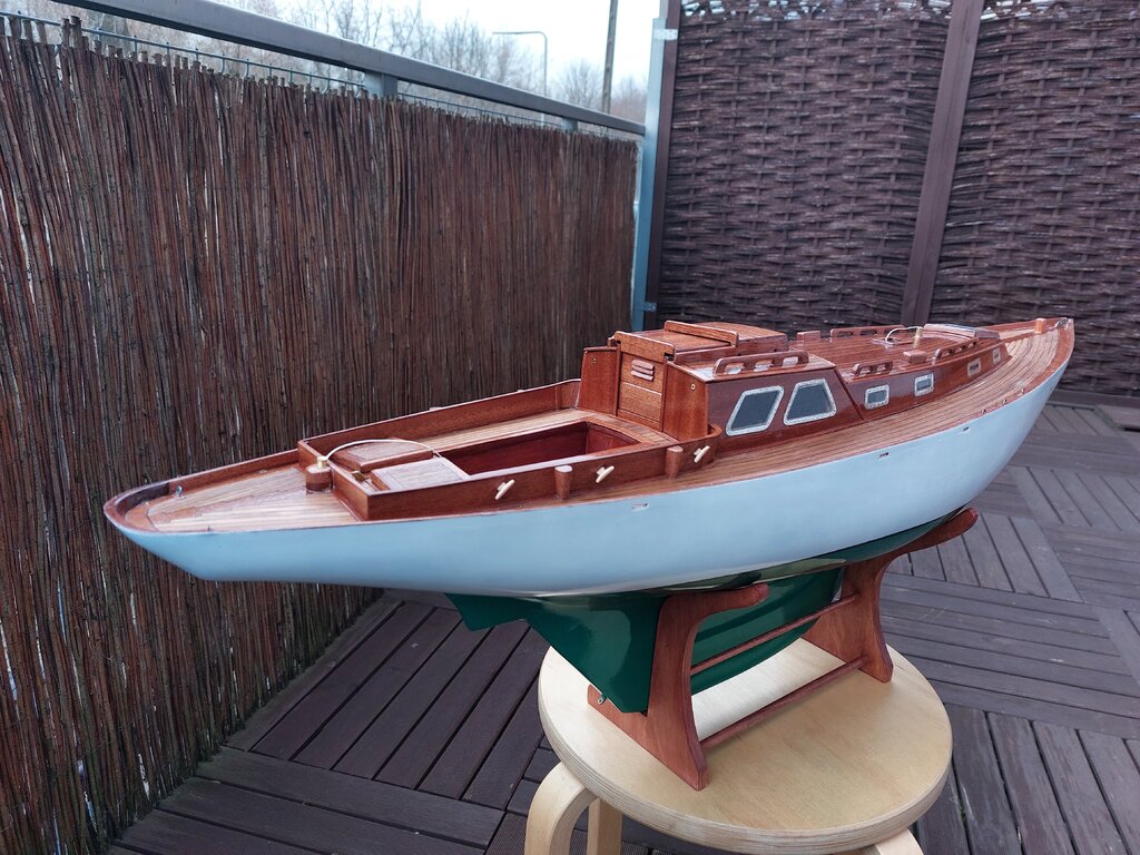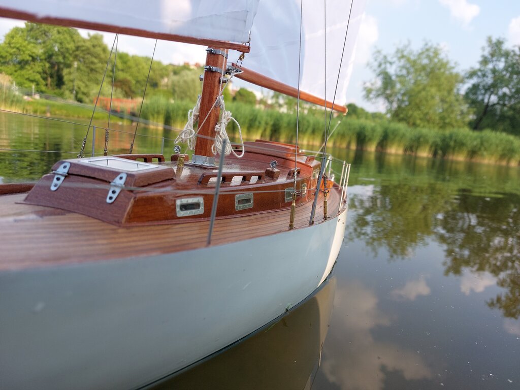 Zmieniłem malowanie kadłuba, w białym kolorze jest jej zdecydowanie lepiej, tzn mnie się bardziej podoba. Zresztą balsa jest trochę taka bez wyrazu, nie ma słojów jak sosna nawet bejcowana nie wygląda ciekawie, jest taka jednolita. Porównuję do kadłuba Omegi gdzie każda listewka jest inna i widać to nawet z dużej odległości co jest ładne. Położyłem również lakier na pokładzie i nadbudówce, czyli podkladowy na całości, na pokładzie z teaku lakier matowy, a na mahoń położyłem połysk. Jestem zadowolony z uzyskanego efektu. -