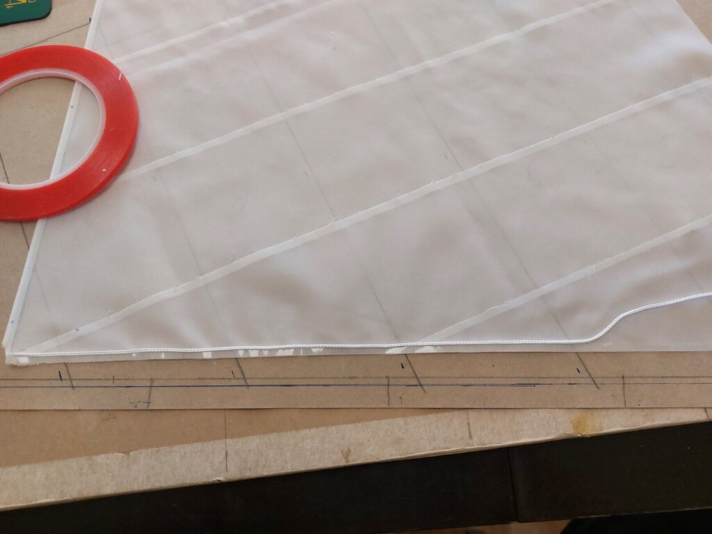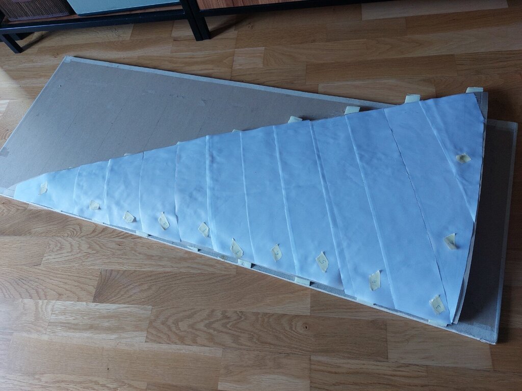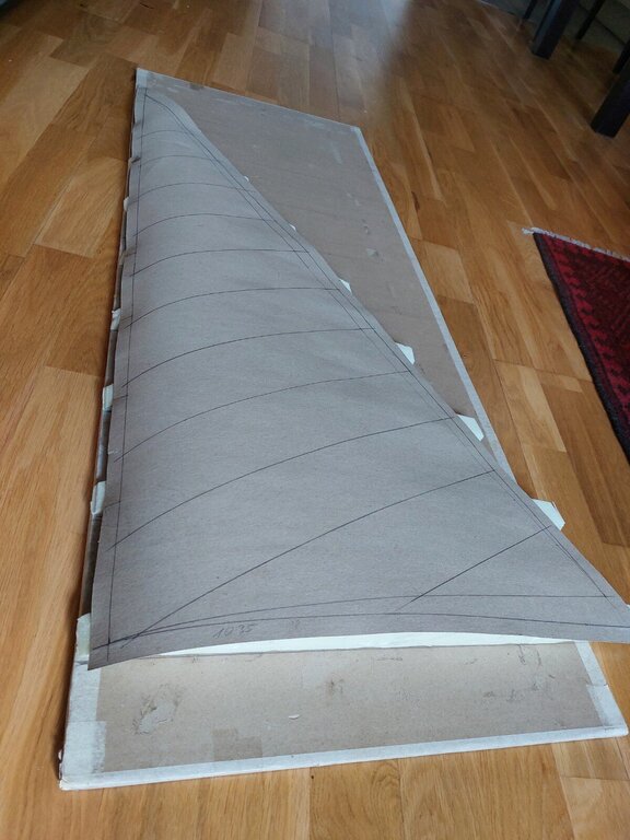 Przyszedł czas na żagle. Aby uzyskać wybrzuszenie żagla, wykonałem coś w rodzaju "kopyta" , na którym kleiłem bryty. Lik przedni foka ma wklejoną cienką stalową linkę, przez którą wpięte są małe agrafki wędkarskie (raksy), no i w grocie wklejona jest linka do wprowadzenia żagla w likszparę. Muszę teraz pokombinować nad bomem foka, gdyż trochę mi koliduje z relingami, ale już chyba znalazłem na to sposób... -
