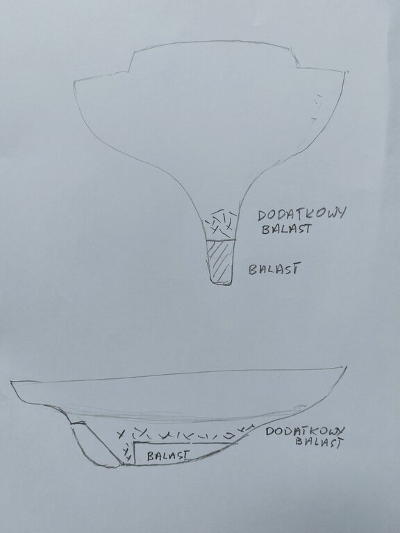 Dokładnie tak, model ma być możliwie jak najbardziej zbliżony do redukcyjnego, więc o żadnych przesunięciach masztu, czy zmianie kształtów żagli, czy kadłuba (balastu) nie będzie mowy. Dużo już myślę o balaście i tu wbrew pozorom, są możliwości regulacji jego masy, czy małego przesunięcia wzdłużnego. Na początku założę określoną masę balastu, a w późniejszym czasie, mając gotowy kadłub i mogąc oszacować w dużym przybliżeniu masę całej łodzi, posadzę go na wodzie i będę wiedział czy muszę dołożyć balastu i ile, czy też go zmniejszyć, aby „usiadł” na swojej KLW. Balast można dołożyć w prosty sposób, dosypując go na stępce i co jest dodatkowym atutem, można go rozłożyć w miarę potrzeb, w kierunku dziobu lub rufy (naszkicowałem to na zdjęciu). A jeśli balast okaże się zbyt ciężki, to przed zamocowaniem go na stałe, można będzie „ulżyć” mu, nawiercając otwory, i tu również jest możliwość wyważenia wzdłużnego, wiercąc w przedniej lub tylnej części balastu. Taki mam „chytry” plan. W tym miejscu nasuwa się pytanie: jaką masę balastu przyjąć? Sięgnąłem do relacji z budowy jachtu El Draco, kolegi Andrzeja (Skipera), który to swoimi wymiarami (kadłuba) przypomina moją Vegę (Lc 970mm). El Draco: długość Lc : 1000 (mm) długość linii Lw : 700 szerokość B: 200 szerokość wodnicy Bw: 180 zanurzenie: 150 wyporność: 3000-3500 (cm^3) balast: 1500 g pow. żagli : 40 dm^2 Szkoda tylko że Andrzej chyba odłożył budowę modelu, ba relacja nie zakończyła się wodowaniem. Pozdrawiam Paweł -