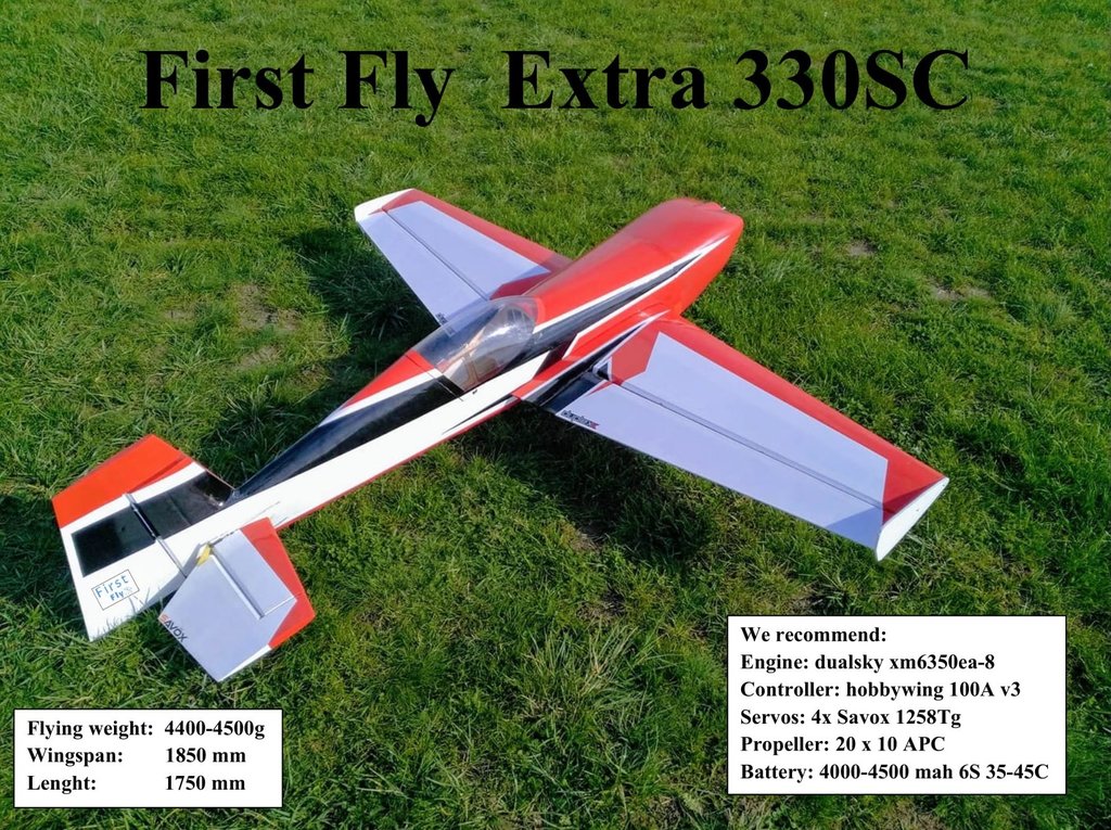 2. Model Extra 330 sc 1,8m od First Fly Models. Model jest przeznaczony do akrobacji 3D, bardzo dobrze lata z automatycznymi manewrami i ma bardzo agresywne skrzydła. Ciężar lotu tego modelu wynosi około 4500 g, w zależności od zastosowanego akumulatora. Rozpiętość skrzydeł: 1850 mm Długość: 1750 mm Wyposażenie: Silnik: dualm xm6350ea-8 Serwa: 4x Savox 1258Tg Śmigło: 20x10 (APC, jeśli można go dostać, jeśli nie jest tak dobry) Sterownik: hobbywing 100A v3 (regulowany 10A) Bateria: 4000-4500 mah 6S 35-45C W przypadku zainteresowania są możliwe wycięcia lub pełne wycięcia stevebnica, haubna, kabina zależy od umowy. Instrukcje: https://drive.google.com/drive/u/1/folders/1yLf9dCZv6I2uOoNbF5lRjYWQzCaTOBuN
