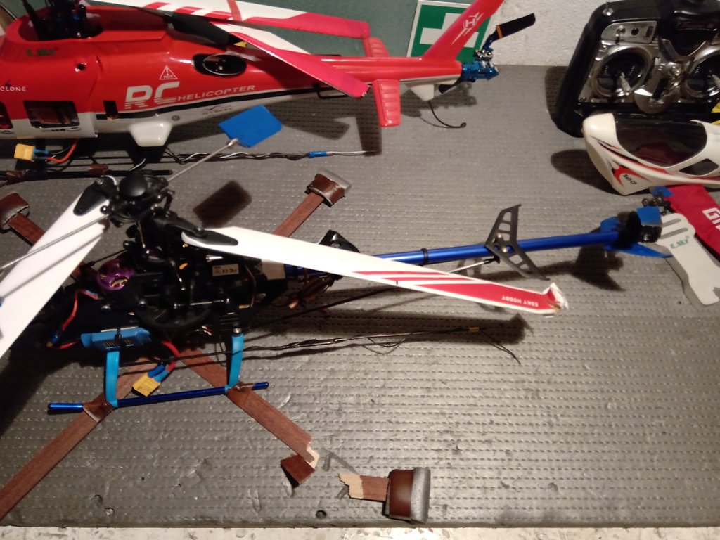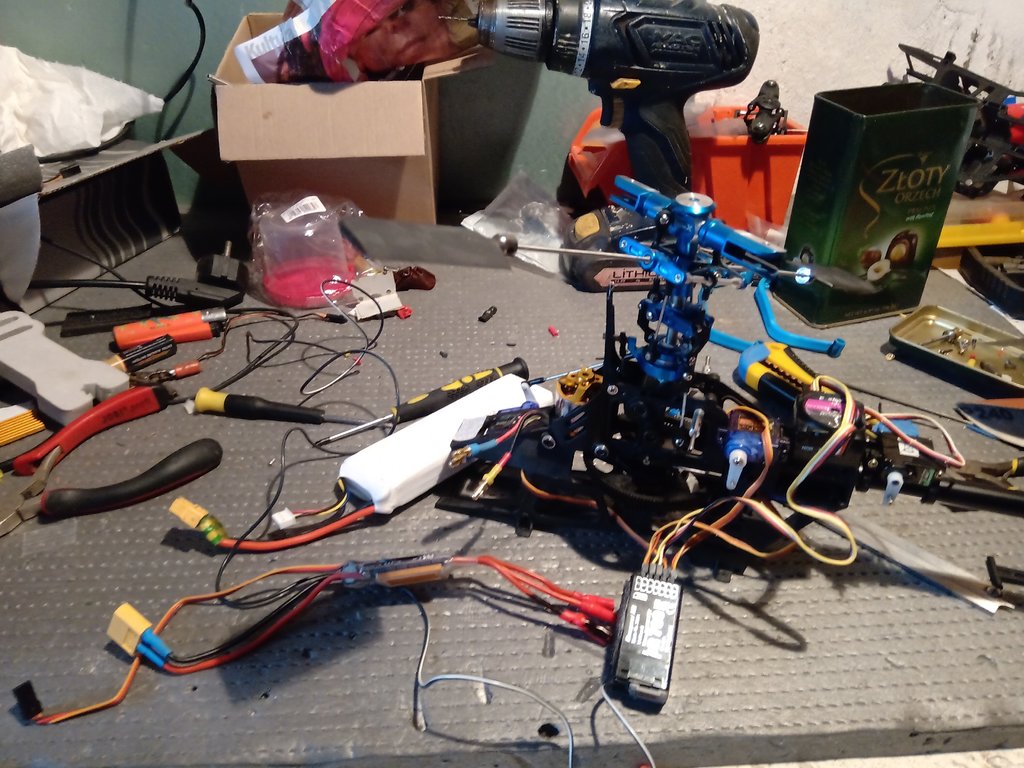 Witam serdecznie wszystkich kolegów po świątecznym lenistwie... Sporo czasu było, żeby zaglądnąć do modeli. Ostatecznie...oba w pełni sprawne...oba dostrojone... wyregulowanie w warunkach pracowni...pora na oblot, niestety na razie mocno wieje i... śnieg zaczyna padać heh...??? Dziadek zostaje w oryginale, natomiast drugi dostał alu głowice i ogon copter x (na ogonie już była)...pod względem technicznym i estetycznym wydaje mi się, że wszystko pracuje na 5-, a wygląda minimum na 3 ??? Oblatam mechanikę... wszystko jeszcze raz dostroje...i zakładam ubranko... Dziękuję Wam bardzo koledzy za pomoc, rady, dobre słowo i cierpliwość. Sam się jej nauczyłem spędzając przy heli łącznie ponad 40 roboczogodzin... Wszystkim życzę samych udanych startów i lądowań. Pozdrawiam ??? Ps. Przepraszam za jakość zdjęć...fotograf ze Mnie kiepski,a zdjęcia robione karmieniem ?