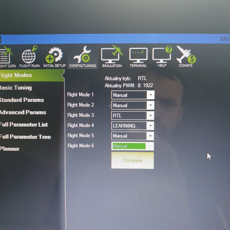 Przełącznik 3 pozycyjny (SWC) W mission planner zakładka failsafe reaguje Radio 8 (1090/1506/19922) Flight Modes: MANUAL/LEARNING/RTL
