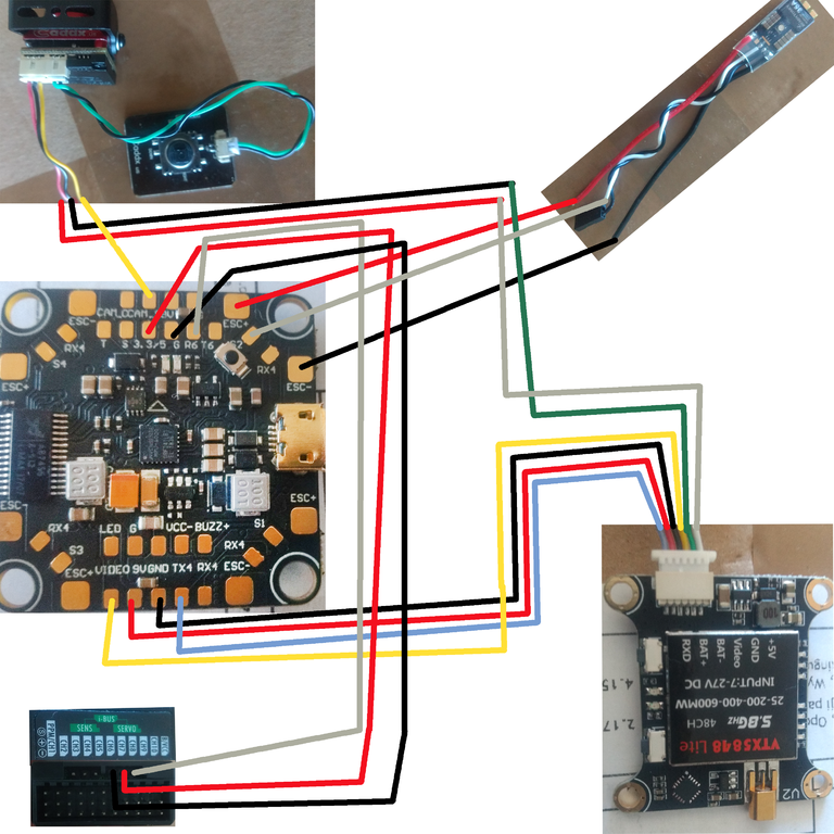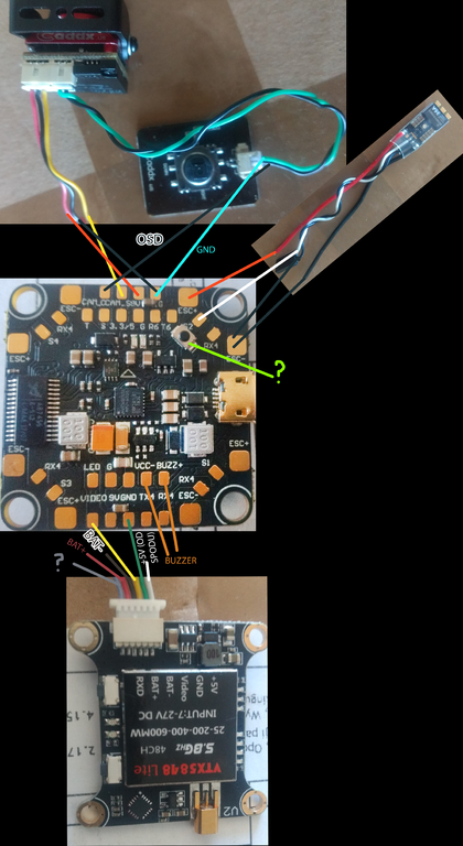 Zabrałem się za skręcanie i pojawiły się kolejne pytania. Pierwsze odnośnie podpięcia kabli. Narysowałem schemat jak chcę to polutować ale nie jestem pewny czy wszystko jest dobrze. Tutaj jest widok z góry: A tutaj FC od dołu: Tutaj moje pytania: Czy VTX może być tak przylutowany bezpośrednio do baterii Czy do 5V od spodu mogę przylutować 3 rzeczy (wtedy ledy planuję uziemić do jakiegokolwiek GND na FC). Od czego jest kabelek RXD w VTX i gdzie go przylutować? Mogę kabelek 5V od VTX przylutować do 9V na FC? Czy dobrym pomysłem jest nie lutowanie OSD do FC tylko podłączanie tego "pilocika" za każdym razem jak chcę coś zmienić? Do czego służy przycisk zaznaczony na zielono na FC? Od spodu na FC kolo 5V jest mostek do lutowania i zmiany wyjścia 5V na 3,3V. Niestety nie znalazłem informacji jakie napięcie jest domyślnie bez lutowania. Czy ktoś może się orientuje? Kolejne pytania są odnośnie samej konstrukcji: Odbiornik jest dość duży i nie mogę znaleźć na niego innego miejsca jak na dole albo górze drona. Można go rozkręcić żeby zajmował mniej miejsca? Te nakładki antywibracyjne są dość duże, przez co mam problem z dokręceniem FC od góry. Zrobić to na siłe czy może lepiej zamaist tych podkładek użyć zwykłych nakrętek jako dystansu od ramy albo po prostu przyciąć je o połowę? Wydaje mi się, że drgania i tak będą przenoszone przez śruby na których będzie zamontowany FC i te nakładki są zbędne. Czy takie ułożenie nie spowoduje zbyt dużego nagrzewania się VTX i FC? Montaż na trytytkach odbiornika i anteny nie wydaje się zbyt solidny. Czy macie jakieś pomysły jak innaczej to zamontować? Może jakieś styropianowe obudowy, kropelka? Zamaist kleju anearobowego mam cyjanoakrylowy. Czy mogę taki klej nałożyć na śrubki żeby się nie odkręcały? Czy są jakieś obudowy dodatkowe do kamerki? Tej która przyszła w zestawie nie jestem w stanie w żaden sposób przymontować do ramy. Myślałem o wycięciu ze styropianu/drewna jakiejś ramy i zamontowaniu tego na trytytkach. Na YT widziałem, że ludzie mieli takie boxy które wkładali w ramę ale nie mogę tego nigdzie znaleźć do kupienia. Po montażu śmigieł jest dosyć spory luz między nimi, a śrubą która ma je dociskać. Na dodatek wszystkie zakręcają się w lewo. Czy silniki CCW nie odkręcą ich podczas lotu? Podłączenie odbiornika: Z tego co zrozumiałem muszę zastosować protokół iBUS. Podpinam wtyczkę serwo (sygnał u góry, + na środku, GND u dołu) i potem lutuje kabelek od sygnału do miejsca podpisanego na FC jako S, + lutuję do +5V (tylko którego, na odbiorniku pisze 4-6,5V), a GND do jakiegokolwiek GND. Czy mam rację? Ładowarka: Ładowarka przyszła bez kabla zasilającego. Muszę kupić do niej osobno jakiś zasilacz. Pisze na niej że obsługuje 220V, więc mógłbym ją włączyć bezpośrednio do gniazdka? Niestety te tematy są mi całkowicie obce i proszę o polecenie jakiegoś bezpiecznego rozwiązania :(. Tak będę podpinać baterie do ładowania. Mam nadzieję, że dobrze to rozkminiłem: Na koniec ostatnie pytanie. W pudełku od ramy znalazłem taką małą plastikową płytkę wielkości FC. Do czego ona służy? Dzięki za całą pomoc jaką do tej pory tutaj uzyskałem