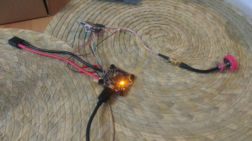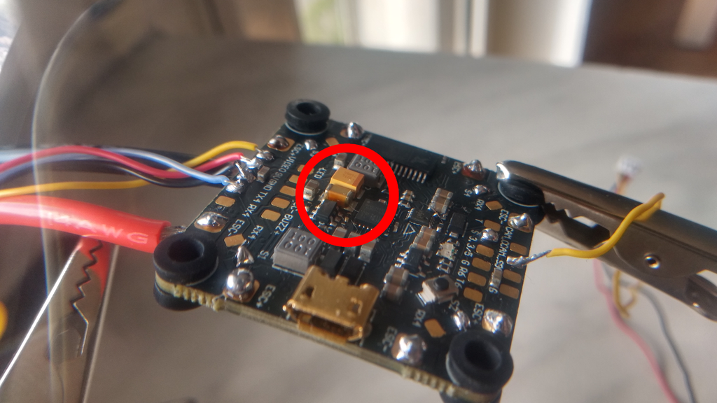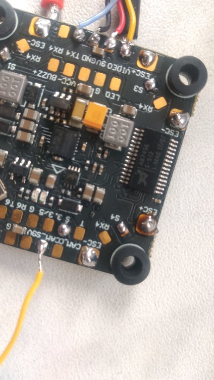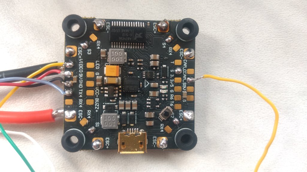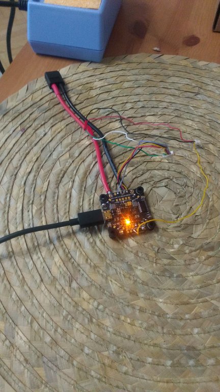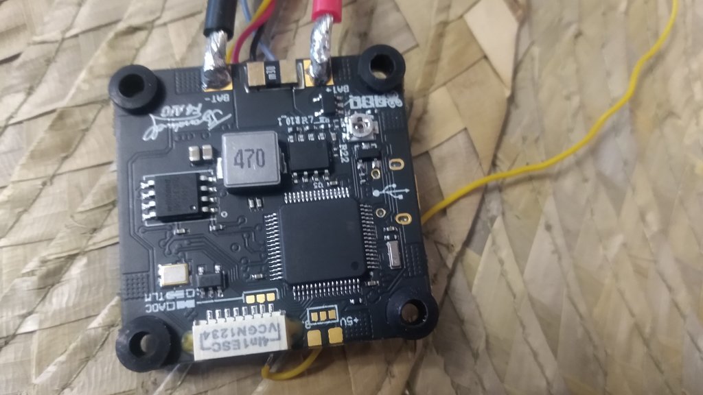 Po podpięciu FC pod USB od laptopa chwilę miga zielona dioda, a pomarańczowa się świeci, następnie cały czas pali się pomarańczowa (z podpiętym VTX oraz bez podpiętego VTX tak samo). Po dokładnych oględzinach lutów i kabli na 99% nie było możliwości, żeby jakieś się zwarły. Z podpiętym VTX: Bez podpiętego VTX: FC od spodu: