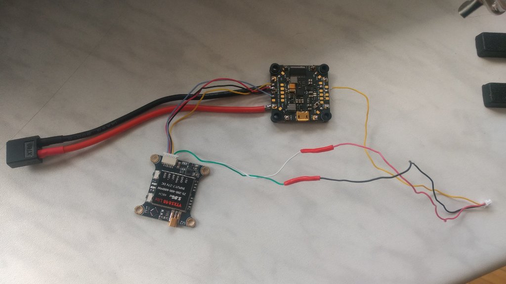 Zdecydowałem się zaryzykować i podpiąć FC i VTX tak jak na schemacie wcześniej tylko z podpiętą anteną i nic złego się nie stało po podłączeniu baterii. Dolutowałem resztę kabli (silniki, ESC, odbiornik) i wygląda na to, że nic złego się nie dzieje (na goglach widać ładny obraz z kamerki zamontowanej na dronie, zakłócenia podczas wydawania dźwięków przez drona). Ładowarkę zasilam zasilaczem z laptopa podpiętym przez przejściówkę i też wszystko wygląda ok. Przed przylutowaniem zbindowałem radio z odbiornikiem. Po podpięciu baterii dron wydaje cały czas głośne pikanie. Próbowałem go ustawić w Betaflight ale na wykresach w zakładce reciver nie widać ruchu drążków na radiu (są one niezmienne pomimo wychylenia drążka). W zakładce motor kiedy poruszam suwakami od śmigieł też się nic nie dzieje. W zakładce PORTS ustawiłem Serial RX UART6 na ON (kabel od odbiornika przylutowany do pola R6). W zakładce CONFIGURATION ESC ustawiłem na DSHOT 150 (na moich ESC pisze DSHOT 200 ale takiego nie znalazłem. Są jeszcze 300 i 600), w okienku RECIVER: reciver mode ustawiłem na serial-based reciver, a serial reciver provider na ibus. Są wgrane najnowsze sterowniki do FC, a w BETAFLIGHT obraca się model 3D, który widać w zakładce SETUP. Czy ominąłem jakiś krok/ coś zrobiłem źle, że odbiornik nie dostaje sygnału od radia? Może to przez to, że w silnikach CCW zamieniłem kabelki miejscami żeby kręciły się w drugą stronę? Target mojego FC to CLRACINGF4, a w BETAFLIGHT miałem do wyboru legacy albo CLRA (wybrałem legacy). Led na odbiorniku się nie świeci po podpięciu baterii/USB. EDIT: Dorzucam filmik (na początku widać jak lewy tylni silnik się porusza): VID_20200611_125512948.mp4 EDIT 2: Okazało się, że miejsce gdzie przylutowałem zasilanie od odbiornika domyślnie ma 3,3V (bez mostka lutowniczego). Po przylutowaniu do 5V od spodu płytki działa odbiornik, jednak dron dalej piszczy i miga po podpięciu baterii ? EDIT 3: Po podpięciu pod BF i szybkim connect widać jak napięcie rośnie, a po naładowaniu paska na full dron się rozłącza (tak jakby dron się wyłączał). Potem znowu daje connect i dzieje się to samo i tak w kółko (wciąż piszczy). Po około minucie dotknąłem FC, VTx i ESC i są trochę ciepłe. Wygląda na to, że to problem z zasilaniem. Macie jakieś pomysły jak to naprawić?
