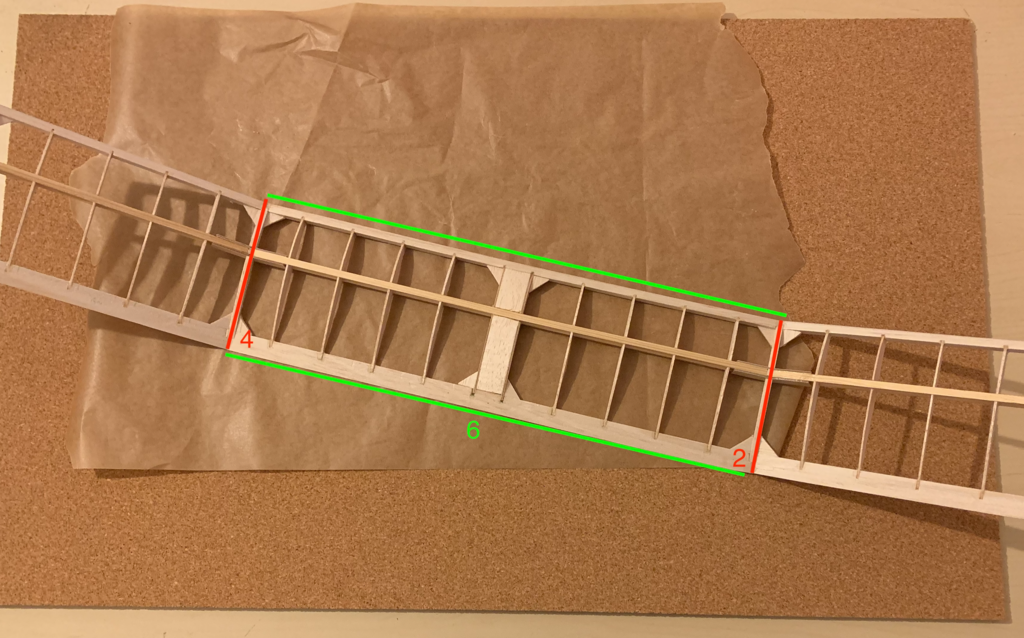 Nie do końca rozumiem "nasadowego". Zakładając, że kleję dół skrzydła jak na zdjęciu, na początku kleję do jednego krańca żeberka (2), później do drugiego krańca (4) i na końcu robię wzdłuż (6)?