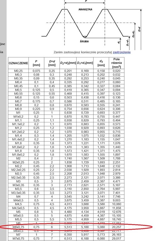 Zamówiłem gwintownik 1/4-32 spróbuję poprawić gwint , a jak nie, to wysyłam do Pawła Prausa, aby zatulejował te głowice. Mi nie chodziło o o nietypowy gwint 6x0,8 bo to bardzo nietypowy gwint, drobnozwojowe dla M6 to 0,5 i 0,75mm. Cytat " A nie M6x0,75 na pewno? " Wydaje mi się ze to ten gwint Pomiar średnicy wewnętrznej gwintu tej świecy z poprzeczką - oryginalnej wykręconej z radugi - na końcu świecy jest minimalny kawałek bez gwintu ten do którego dogrzana jest poprzeczka o średnicy wewnętrznej - i pomiary są ok 5,1-5,15 mm ( to nie jest perfekcyjny pomiar ) co przemawiałoby za gwintem M6x0,75. bo pasuje do wymiaru wewnętrznego gwintu M6x075 ( D1-d1 w tabeli ) 5,188mm. Przykładałem do świecy (MP-Jet , chińczyk ) wzornik ( co prawada metryczny ) gwintu 0,8 ( calowy i metryczny maja obrys 60* i ząbki szablonu wchodzą dokładnie w obrys gwintu świecy ( jak pisałem calowy ma skok 0,794mm ( te "6 setek " ) nie do uchwycenia przy szablonie ząbkowym, Dalej jednak świeca oryginalna ta z poprzeczką pasuje i nie uszkadza gwintu. MP-Jet od biedy co któraś Chińczyk tak samo, a OS kleszczy się na 2-gim zwoju i ani kroku dalej . Na świecy OS widać już niezgodności gwintu świecy z szablonem 0,8. Nie mam profesionalnego wzornika gwintu 1/4-32 i nie kupię do radugi którą używam do zabawy w "pyrkolenie na ogródku" ( akurat ten wzornik kosztuje ok.900zł !!!!)