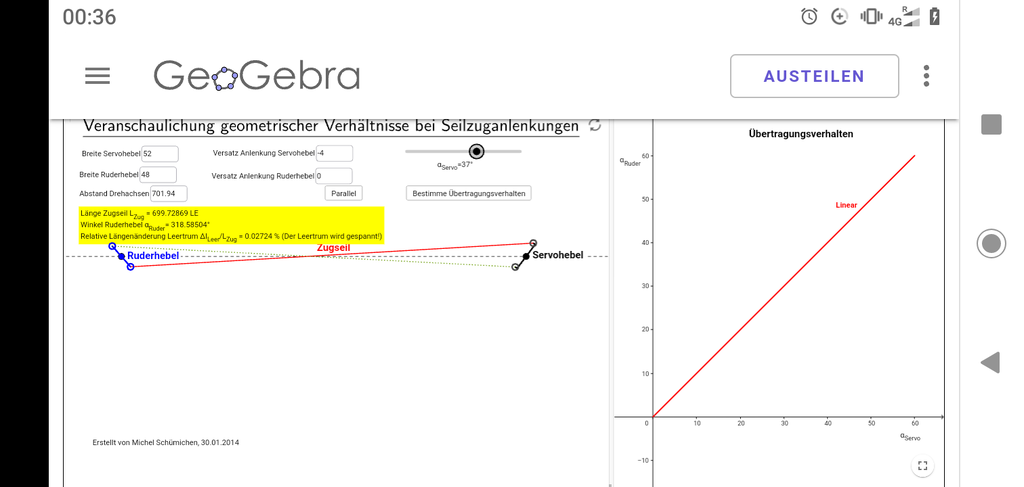 10. Dziekuję Amadeusz.Zima minęła,kolejna wiosna przyszła ,a model jeszcze nie poleciał.Wykończenie idzie mi jakoś bez entuzjazmu .Więcej siedzę w modelarstwie "wirtualnym" i symulatorze.Ale w tym sezonie to nie będzie wymówek i lepiej czy gorzej na pewno poleci. Zacząłem robić formę na owiewki kół,bo z nimi Extra nabierze" stylu",a na jak długo,to zobaczymy. Druga rzecz to steru kierunku na linkach ,w układzie na krzyż.Wklejając orczyk na sterze kierunku zrobiłem błąd taki ,że wypadł nie w osi obrotu.To spowodowało złe ułożenie linek.Żeby nie wyciągać wklejonego już orczyka ,dodałem małą korektę.Do symulacji ruch linek i doboru offsetu i kątów ,jak i wielkości orczyków użyłem programu,którego "screen"wrzucam poniżej.Jaki będzie efekt,postaram sie podzielić. (A te sznurki na zdjęciu to tylko tak na razie do wciągnięcia stalowych) Pozdrawiam.