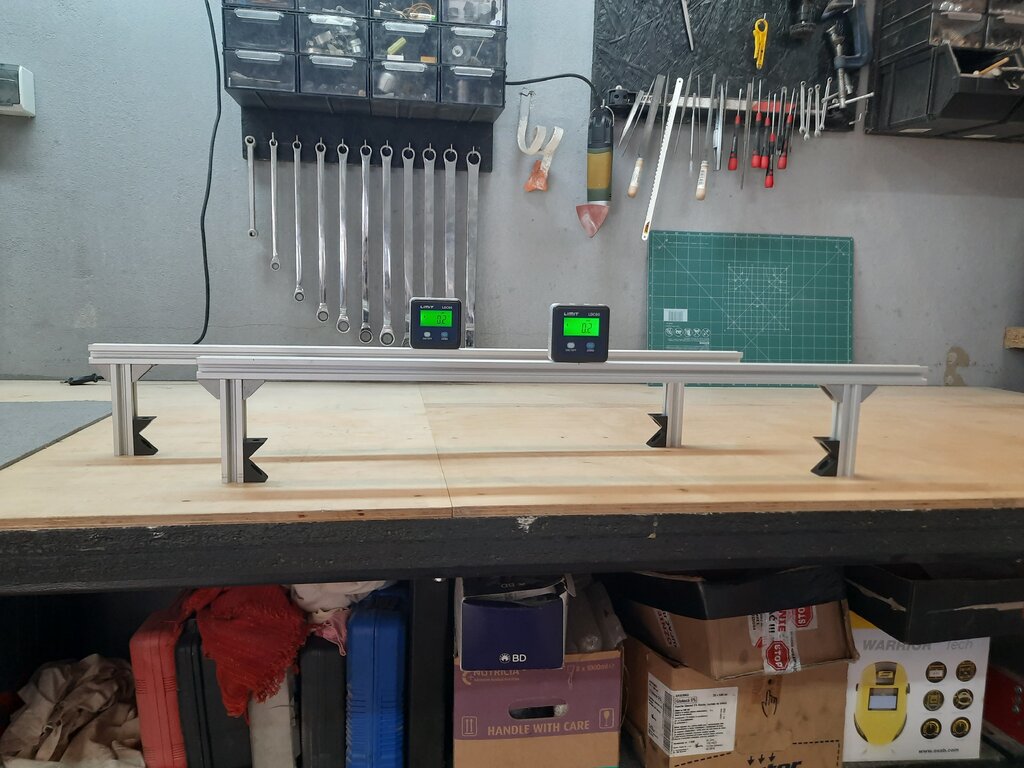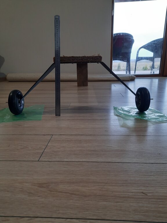 Sprawdzilem i przy ustawionym poziomo modelu mam 13 cm zapasu do ziemi: Ugięcie podwozia przy przeciażeniu 3g (52kg) było na poziomie 7 cm także mam 6 cm zapasu, chodź chętnie wstawiłbym jeszcze większe koła o ile znajde takie lekkie i pompowane. licze że 18 kg nie przekrocze:) Dorobilem sobie jeszcze takie przyrządy na bazie profili 20 mm V-slot, które wykorzystsm do niwelacji modelu - pomiaru kąta natarcia skrzydeł. Działam dalej. -