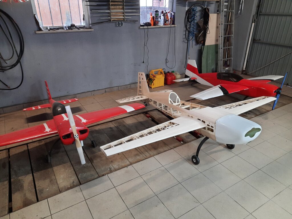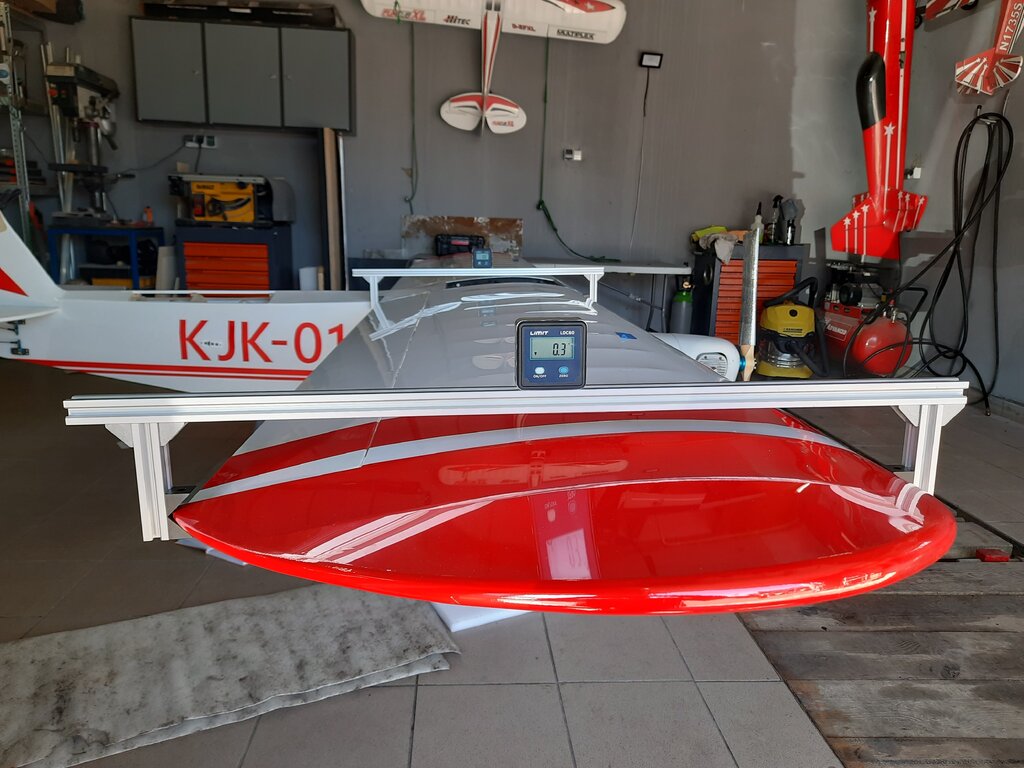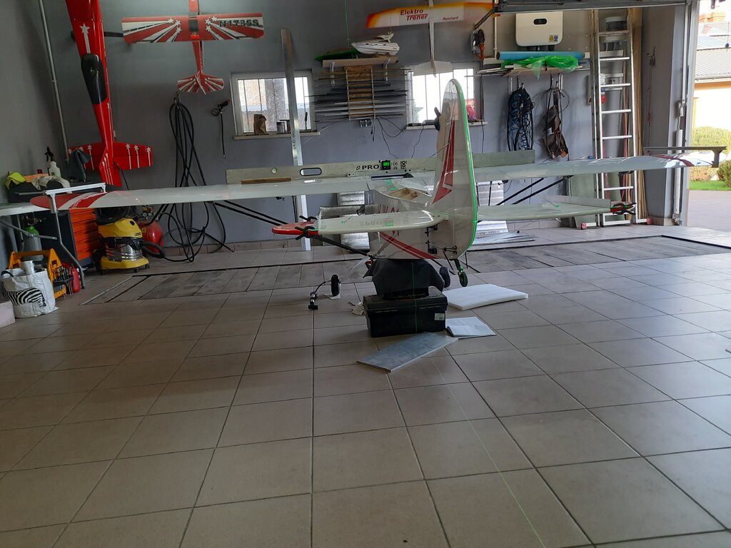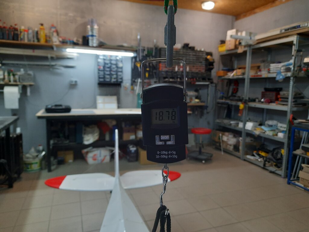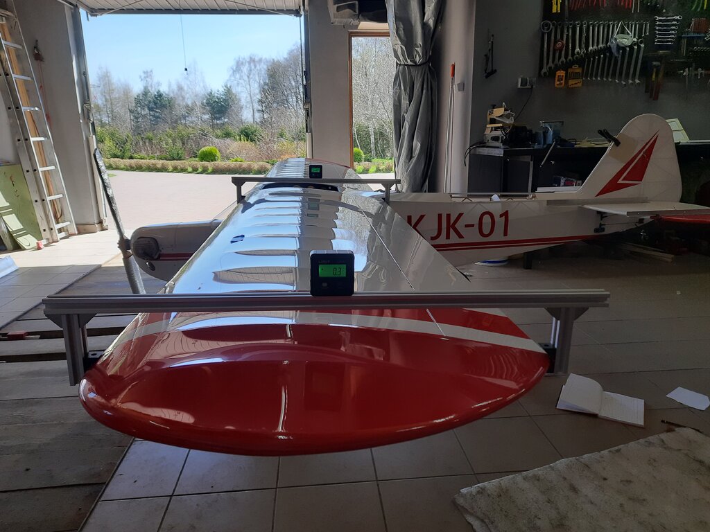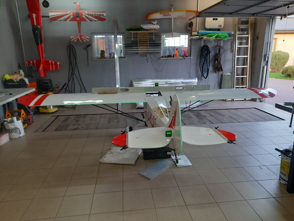 Dziś cały dzień zajmowałem się niwelacją, najpierw ustawiłem delikatne zwichrzenia skrzydeł po -0,3 stopnia W kolejny kroku ustawiłem poziom skrzydeł względem poziomu statecznika poziomego, następnie ustawiłem statecznik pionowy. Po niwelacji zwarzylem model i niestety małe rozczarowanie, wyszło 18,8 kg a planowałem 17 kg. Sądzę że przasadziłem z konstrukcją skrzydeł, można je zrobić lżejsze o 0,5 kg. Mogę jeszcze zrobić nową maskę lżejszą o 100g, pomogło by to ze środkiem ciężkości który obecnie wyszedł w 25%. Ale przy rozpiętości 4,2m i silniku 178cm i dużych tłumikach myślę że nie da się zejść poniżej 18 kg. No nic, i tak nie jest źle, teraz święta a poźniej odpalam silnik. -