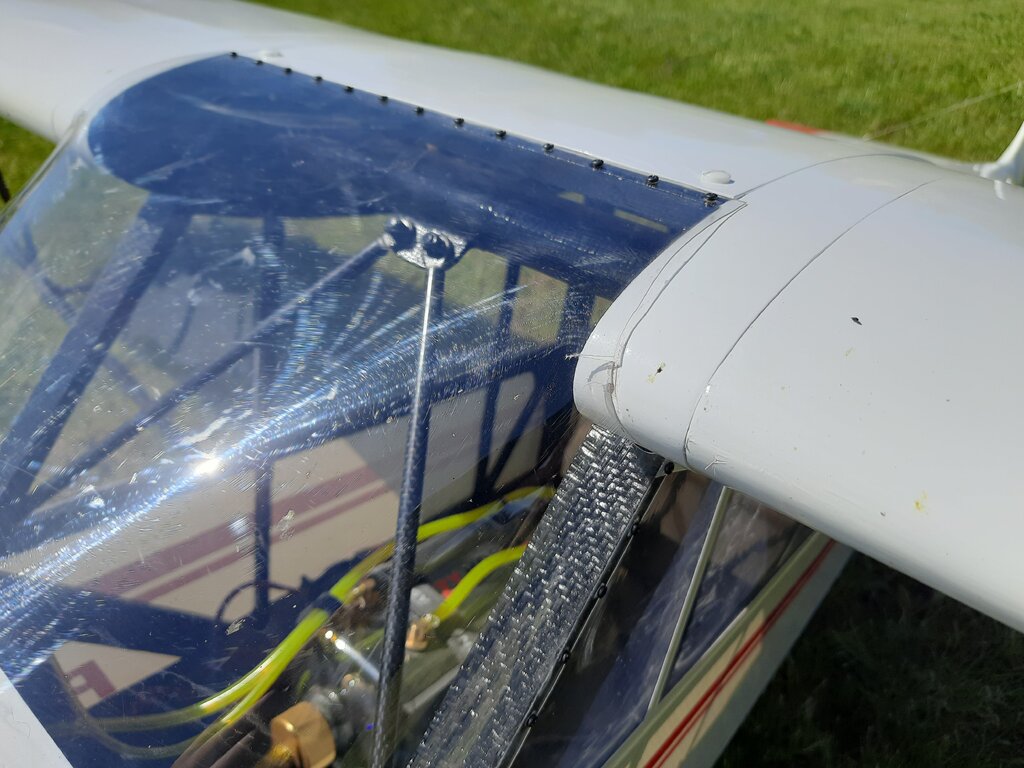 Silnik już dotarty i choroby wieku dziecięcego wyleczone. Na przednią szybę użyłem grubszego materiału 0,7 mm, prawdopodobnie pet-g, gdzieś odgrzebany ze starych zapasów. Przy próbie wyłamania go kombinerkami zabiela się i ciągnie ale nie pęka. Blaszane półbafle i dolna ramka pod szybą rozwiązały problem przegrzewania spodu szyby powietrzem chłodzącym cylindry Wlatałem się już trochę w model i co ważniejsze jestem pewny jego działania, i tak się relaksuje przy niedzieli: -