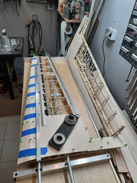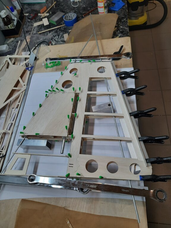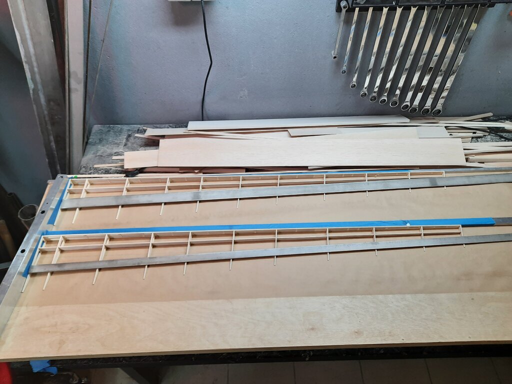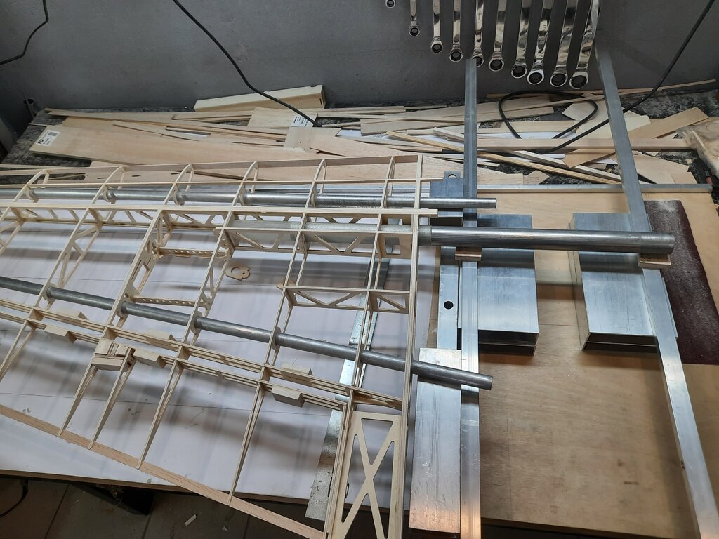 Dziś skleiłem lewe skrzydło. Napiszę przy okazji dwa słowa o mojej desce montażowej, wszystkie jej części można nabyć przycięte na gotowo na znanym portalu aukcyjnym. Sama deska to 2 warstwy sklejonej sklejki grubości 15 mm o wymiarach 500 x 1500 mm. Od spodu przykręcone są 2 stalowe rury kwadratowe 50 x50 x 3 długości 1500 mm. Dało to tolerację płaskości około 0,3mm mierzone łatą i szczelinomierzem. Do dłuższej krawędzi przykręciłem płaskownik aluminiowy 40 x 10 x 1500 który jest bazą do ustawiania kątownika którym ustawiam dokręcane do deski elementy pomocnicze. Do zmontowania tego skrzydła przykręciłem 2 aluminiowe rury prostokątne 25 x 50 x 3 długości 500 mm po bokach deski. Rury te mają nawiercone otwory fi 10 w równej odległości od krawędzi w które włożyłem kolki ustalające (z rurki fi 10). Na tych kołkach oparłem rury montażowe fi 16. Żebro zewnętrze dosunąłem do jednej z prostokątnych rur aluminiowych 25x 50. Taki wiec prosty przyrząd pozwolił na dokładne ustawienie rur montażowych skrzydeł równolegle do siebie oraz zebra zewnetrzenego skrzydła prostopadle do rur montażowych. Buduje już tym systemem trzeci duży model, polecam zbudowanie podobnej deski, bardzo ułatwia to pracę i zapewnia dokładność. -