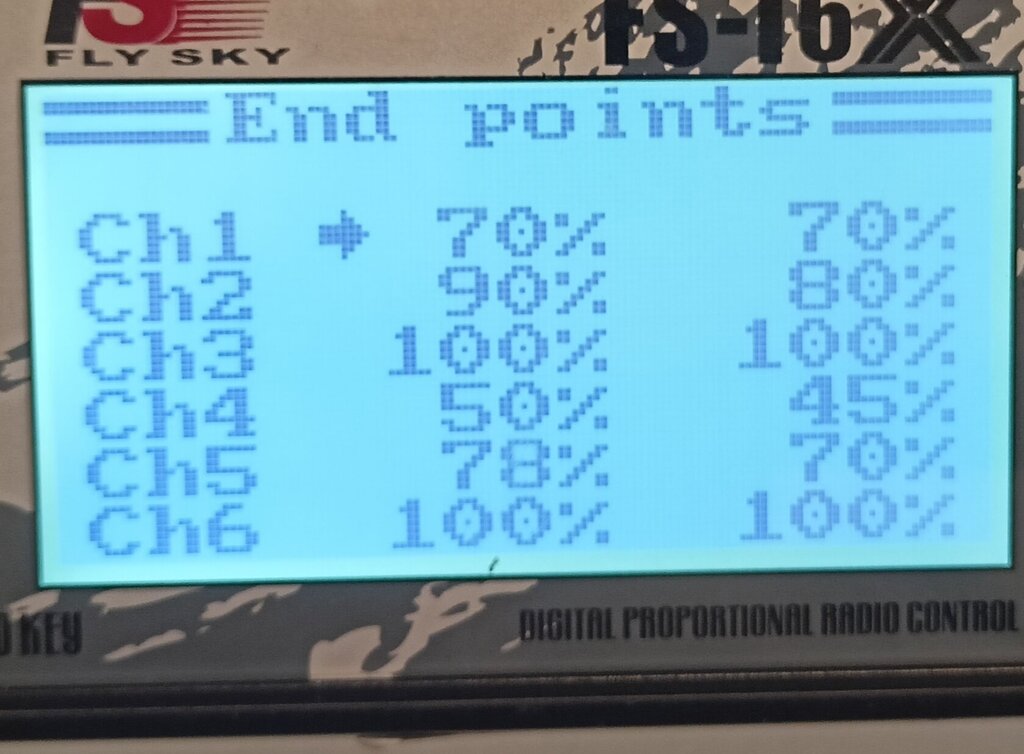 W takim razie ustawiłem jeszcze mniejsze, dodałem 5% do każdego przez te serwa i wygląda to tak: Ch4 - ster kierunku, zostawiam jak było przy oblocie na pewno nie użyje. Ch2 - wysokość, na obu powinno być 45% ale to moje serwo bardziej wypycha w górę niż ciągnie popychacz w dół. Tak będzie ok?