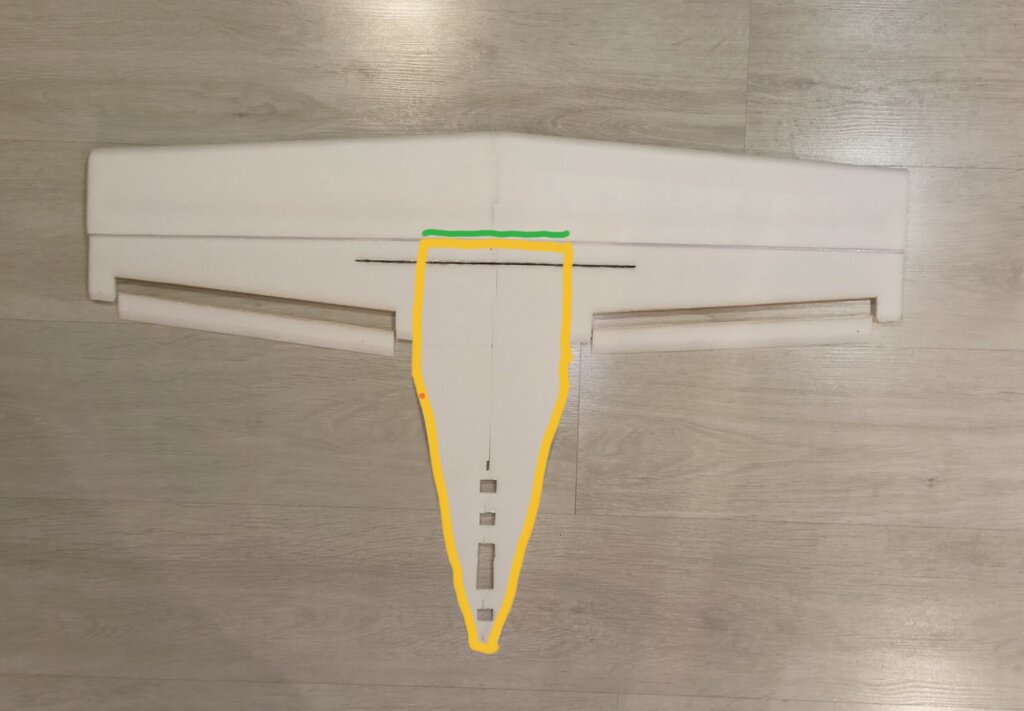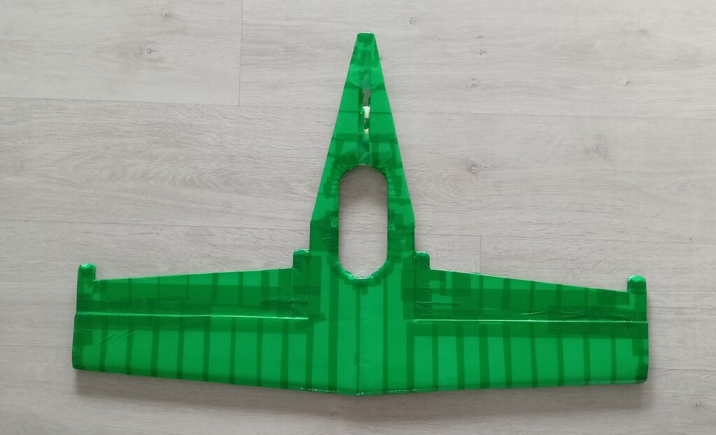 Na dużą prędkość modelu nie liczę. Udało mi się zrobić ster wysokości, statecznik to sklejone dwie warstwy xps 6 i 3mm a sam ster to xps 6mm. Całość okleiłem zieloną taśmą pakową, nie wyszło to jakoś świetnie bo taśma przebija ale myślę że narazie może być. Tak to wygląda: