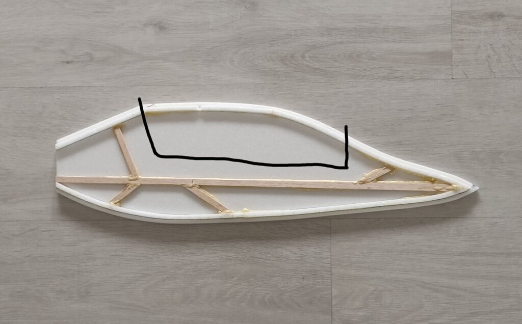 Zrobiłem połówkę kadłuba, zrobię go podobnie jak w toto. Wzmocnienia są z twardej balsy, może ktoś napisać z czy są dobrze ułożone. Tam gdzie czarna linia będzie wycięta kabina.