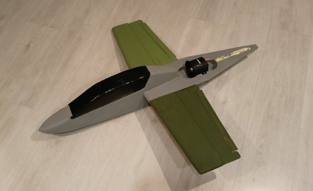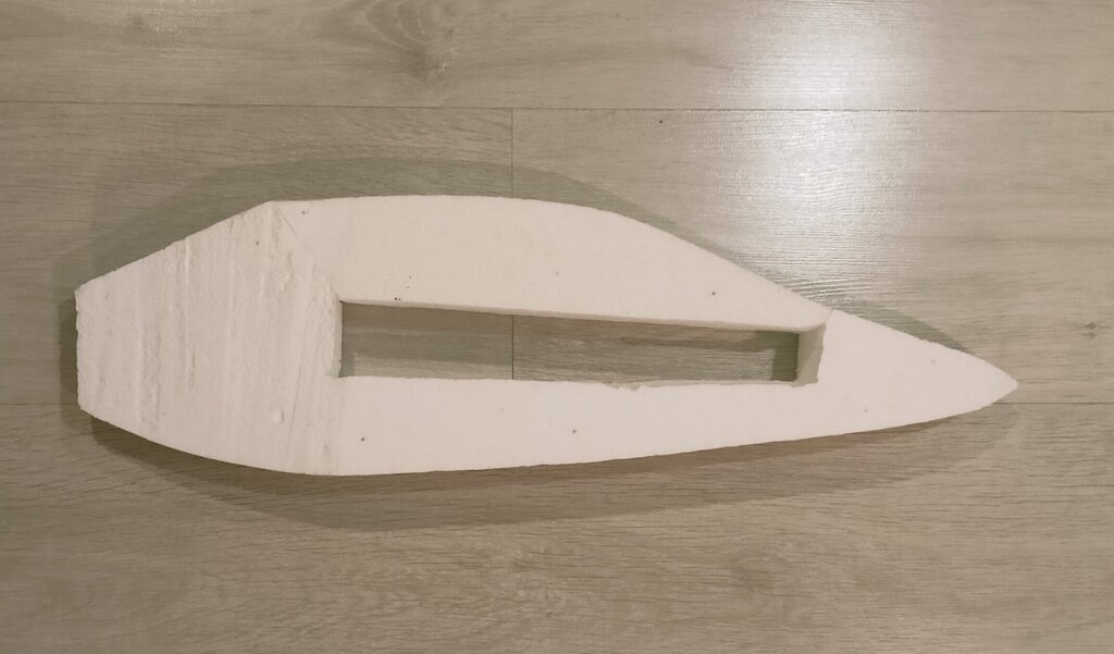 Była mała przerwa w relacji to też udało mi się trochę zrobić. Starłem te krawędzie tych białych elementów tak aby powietrze się rozdwajało. Wkleiłem drugą warstwę XPS na tyle skrzydła, wyszło całkiem sztywno. Tak wygląda skrzydło po oklejeniu, może nie jakoś super bo ta taśma przebija ale dla mnie może być. Dopowiem jeszcze że te pomarszczenia już usunąłem za pomocą suszarki. Dalej wyciołem kształt przodu z bloczku styropianu 5cm. Robiłem to gorącym drutem, jak na pierwszy raz wyszło ok.