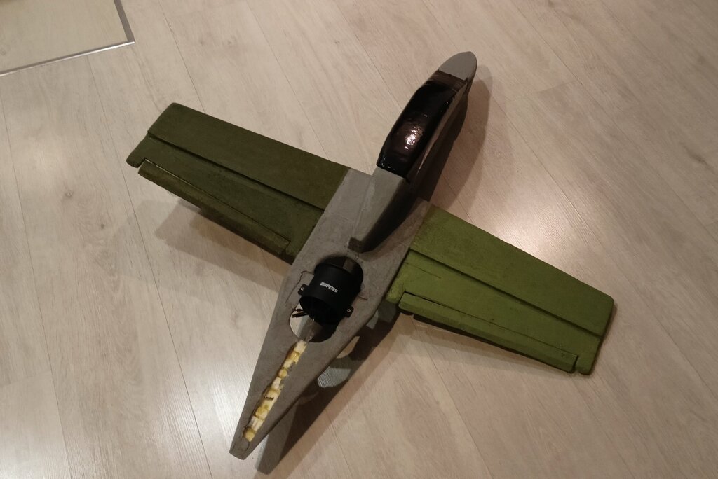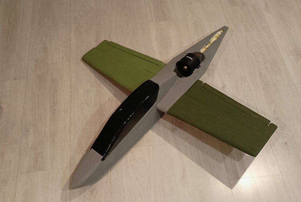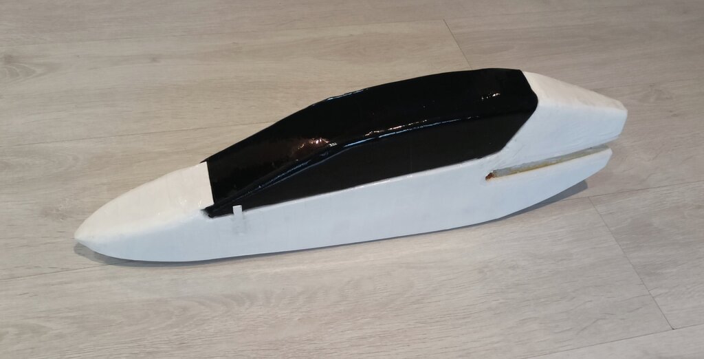 Zrobiłem tą kabinę. Owiewka na magnesy neodymowe z tyłu. Po bokach oklejona xps 6mm a na dole i górze 3mm. Oklejona czarną i białą taśmą pakową. Wyszła bardzo solidnie ale mimo że wyciołem trochę styropianu wewnątrz owiewki to waży 247g. Ważąc wszystkie elementy waga powinna wyjść 1300-1400g. Niby turbina ma 1630g ciągu ale wiem że jest to zawyżona wartość.