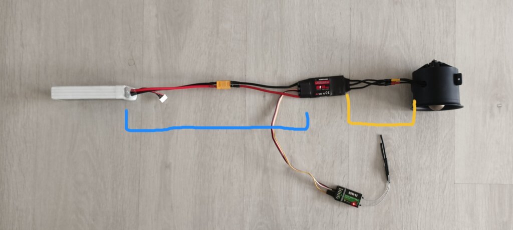 U mnie tak to wygląda: Ten niebieski odcinek ma ok.30cm. A ten żółty ma ok.14cm. I teraz pytanie, przedłużać te pomiędzy ESC - EDF i skracać pomiędzy baterią a ESC. Kable takiej długości jak są teraz razem spokojnie wystarczają. ESC będzie na zewnątrz więc przewód esc-edf nie musi być długi. Coś tu zmieniać/skracać?