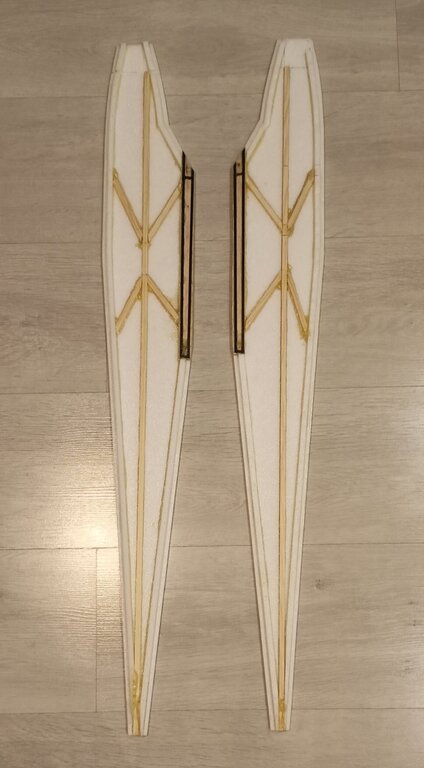 Cześć, zaczynam budowę pierwszego modelu od zera. Wybór padł na toto-7 ze względu na łatwość budowy. Od razu zaznaczam że czasami coś mogę zrobić nie tak, dlatego proszę o podpowiedzi.? Do budowy będę używał pianki XPS Diall z Castoramy. Na początku wyciołem wszystkie elementy z pianki łączenie z listwami. Następnie na obie połówki kadłuba przykleiłem w odległości 6mm od krawędzi listwy z pianki oraz listwy sosnowe 3x6. W tym miejscu napotkałem pierwszy problem ponieważ w sklepie w którym zamawiałem nie było twardej balsy 3mm, była tylko standard więc postanowiłem wzmocnić ją płaskownikiem węglowym 1x3. Po przyklejeniu wzmocnionych elementów pod skrzydło całość wygląda tak: I tutaj po wyschnięciu zauważyłem że nakładam za dużo kleju. Całość jest sztywna i solidnie sklejona. Zastanawiam się czy wzmacniać dodatkowo kadłub profilem węglowym, mam dwa profile kwadratowe 3x3. Jak tak to gdzie je umieścić?