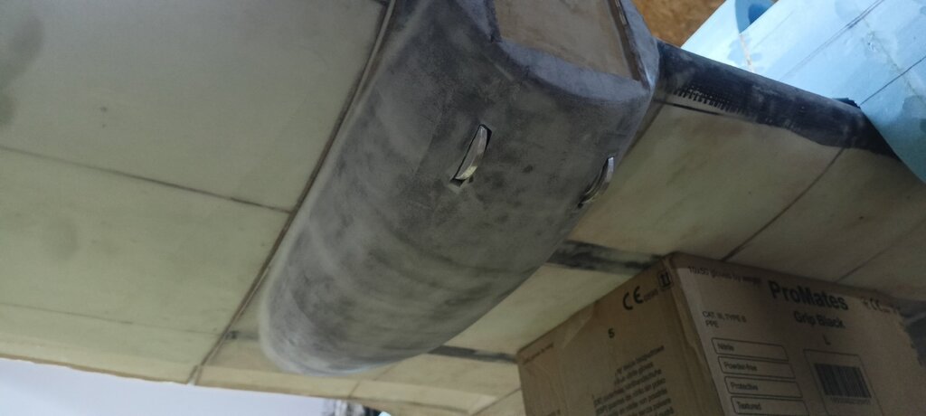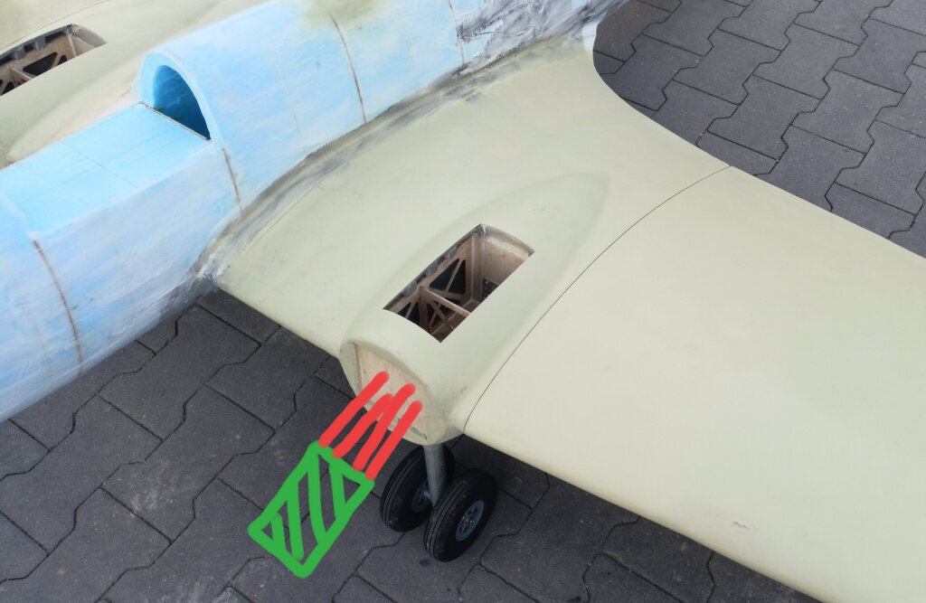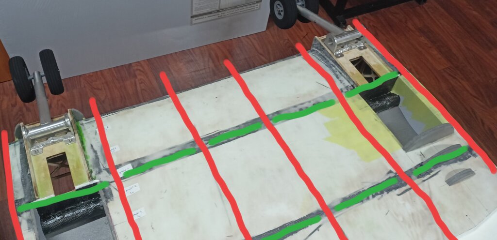 Cześć, dawno się tu nic nie działo. Przez ten czas narobiły się spore zaległości w relacji. Jeszcze przed kryciem tkaniną przykleiłem domki silników ze sklejki 6mm. Boki są wzmocnione tkaniną węglową. Następnie wziąłem się za pokrycie centropłatu, robiłem to po raz pierwszy więc nie obyło się bez błędów. Pierwsza warstwa to tkanina 80g i wzmocnienia węglowe 160g, zostawiłem to do wyschnięcia (pierwszy błąd). Teraz żeby druga warstwa się trzymała delikatnie zmatowiłem pierwszą warstwę i położyłem tkaninę Interglass, na to od razu mikrobalon. Podczas szlifowania chciałem sobie ułatwić sprayem, średni był ten spray bo był brązowy i nie dało się go całkowicie wyszlifować z białego/ przeźroczystego laminatu. Wyszło pancerne, przez dzielenie warstw trochę ciężko ale nie jest źle. Największy błąd który popełniłem to konstrukcja dźwigara, sam nie wiem dlaczego tak zrobiłem ale dźwigar jest klejony z kawałków. Niby całość kleiłem wzmacniając wszystko paskami tkaniny ale nie daje mi to spokoju. Rysunek to pokaże, żeberka (czerwone) są całe a dźwigar (zielone) jest podzielone na takie kawałki: Łoś stoi już na docelowym podwoziu, robiłem testy - na kadłubie który jest na środku centropłatu układałem 50kg. Wszystko spokojnie wytrzymuje, nic się nie ugina nie trzeszczy. 50 kg to prawie 3 krotność wagi do lotu. Dźwigar jest za to wzmocniony węglem co trochę widać na zdjęciu, pokrycie nadaje dużo sztywności . Myślicie że to wytrzyma czy trzeba będzie robić na nowo? Wracając do budowy, po pokryciu zaczęły powstawać gondole silników: Gondole wyszły całkiem fajnie, od dołu wystają elementy podwozia. Nie przewidziałem wysokości głównego zawiasu podwozia, ale praktycznie nie będzie tego widać. Reszta będzie w drugiej części.