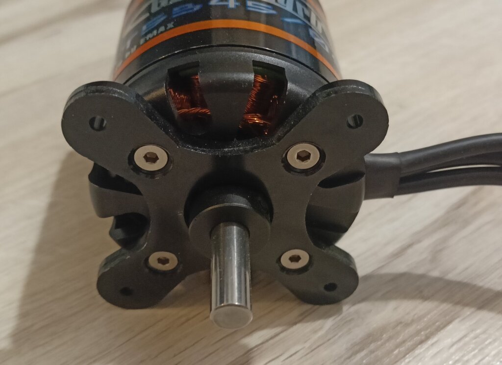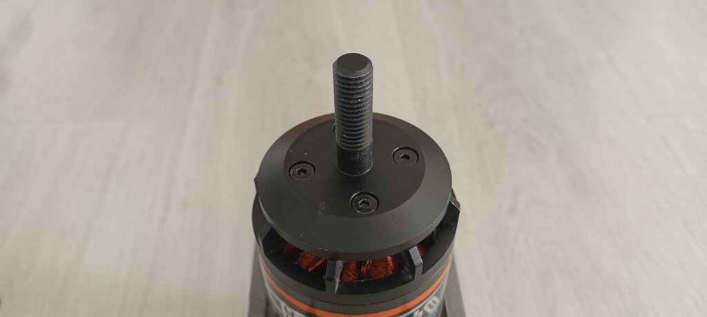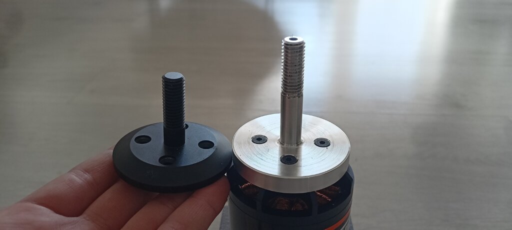 Wszystkie problemy rozwiązane🙂 (na razie) Odebrałem od tokarza zrobione na nowo ośie. Zrobione z lotniczego aluminium: Otwór na śrubę centralną M4, usunąłem też to fazowanie na podstawie tego elementu tak żeby śmigło dolegało całą powierzchnią. Również domki silników ze sklejki 6mm, czekają na wzmocnienia węglowe i sklejenie.