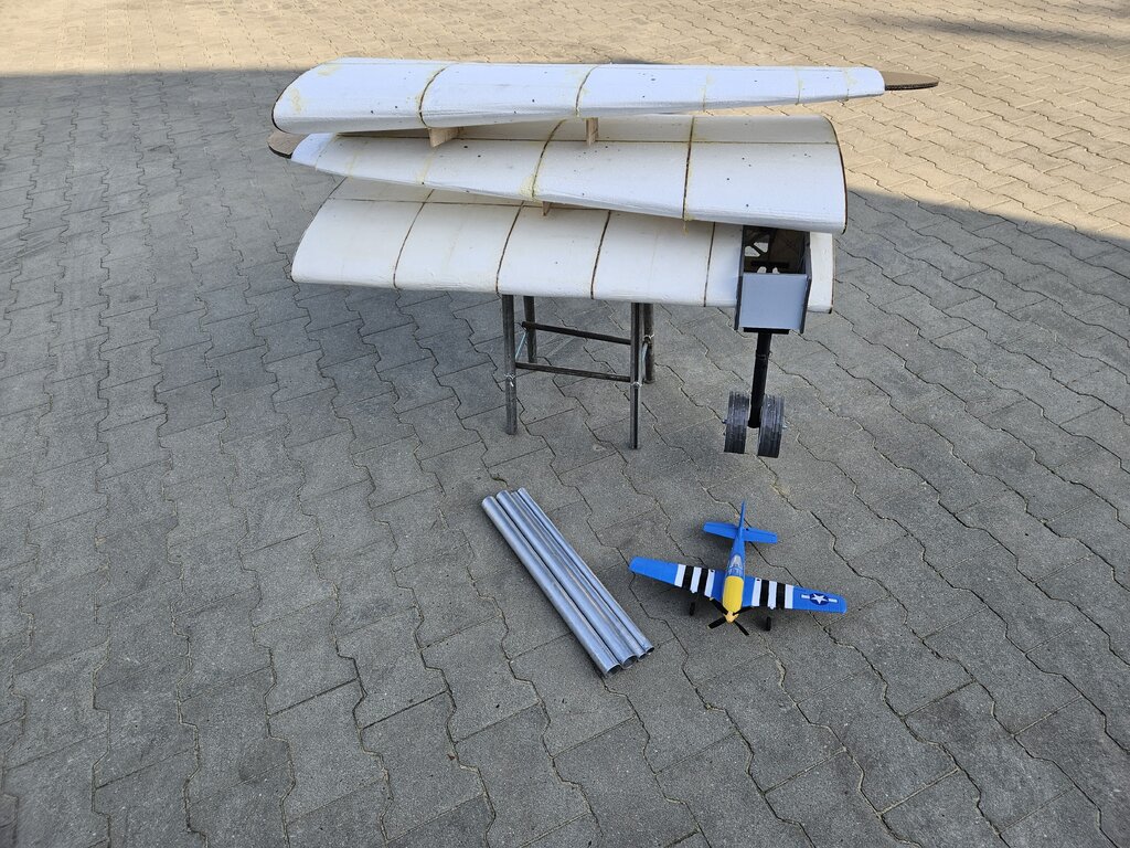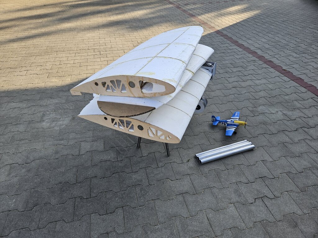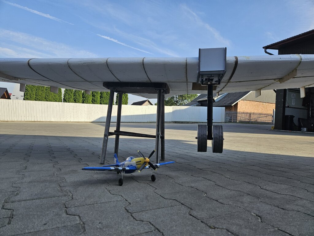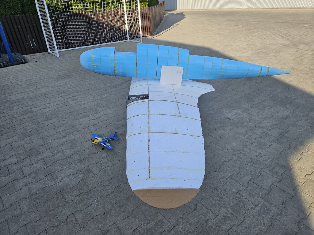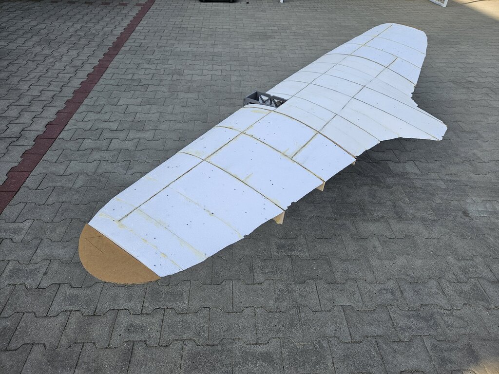 Na razie niewiele się dzieje 🙂. Wypełniłem końcówki styropianem i widać już całość skrzydła. Z grubego kartonu zrobiłem szablony do wycięcia ostatnich elementów skrzydła. Tak to teraz wygląda: Na tym etapie myślę o podwoziu żeby wiedzieć jak pokryć skrzydło. Pierwszy prototyp już jest, domek silnika do testów zrobiony z pianki 7 mm docelowo będzie sklejka 6 mm. Prototyp jest wydrukowany na drukarce 3D, jest jeszcze kilka elementów do poprawienia, miało się to chować na dość duże i mocne serwo ale prawdopodobnie podwozie chował będzie siłownik elektryczny. Do zmiany jest także szeroki otwór w goleni który mocno ją osłabia. Do transportu tak jak było w planie skrzydło jest dzielone na 3 części, centropłat będzie na stałe z kadłubem. Mam też już tkaniny na skrzydło, Interglass 24,5g w porównaniu do zwykłej tkaniny 25g jest dużo gęściej tkany. Na zdjęciu kawałek Interglasu: Na razie tyle, w połowie września budowa powinna przyspieszyć. Z oblotem chcę wyrobić się w tym roku.🙂 Dla skali na zdjęciach pojawia się Mustang firmy Volantex który ma 40 cm rozpiętości.