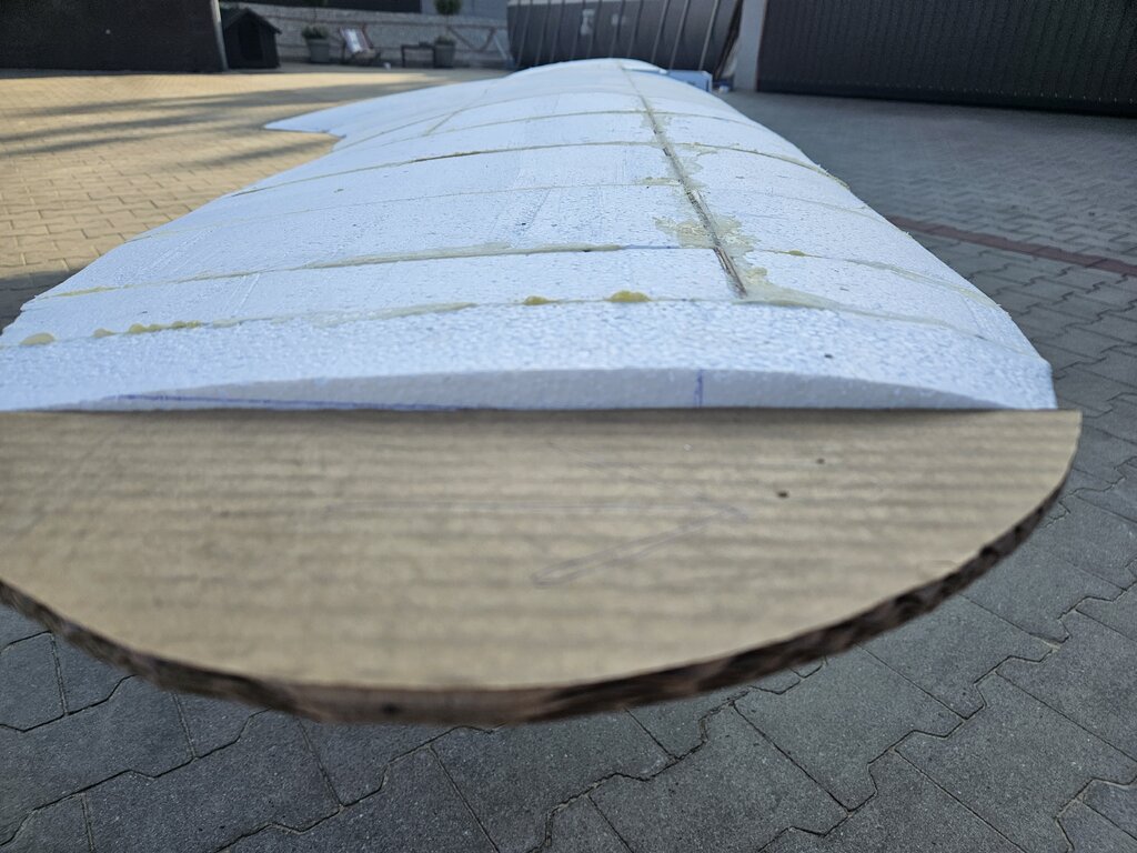 Na razie styropian jest tylko wklejony, nic nie było szlifowane. Wszystko przed pokryciem będzie szpachlowane super lekką szpachlą. Znalazłem taką która ma gęstość 0,4g/cm3, czyli gęstość podobna do xps. Styropianu trzyma się bardzo dobrze. Te niedoskonałości powstały przy wycinaniu, wszystko jest wycinane ręcznie od sklejkowych szablonów. Głównie drobne błędy są przy natarciu, wystarczyło żeby drut zjechał z jednego szablonu i segment ma pokrzywione natarcie.