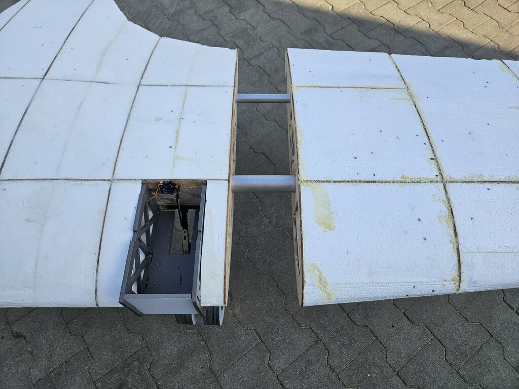 Wyciołem centropłat i kawałki końcówek, tak to wygląda przyłożone do zdjęcia: I utknąłem z dzieleniem skrzydła.🙂 Mam jeden pomysł i poniżej spróbuję go wyjaśnić: Pomysł zakłada dzielenie skrzydła zaraz za gondolą (łatwiej z przewodami od silników i solidnym podwoziem), chcę użyć na bagnet główny jednej rurki duraluminiowej 35x1,5mm o długości 1m czyli na jedną stronę po 50 cm. Poniżej rysunek na którym grubszy czerwony pasek to rurka 35 mm: Cieńszy pasek to również rurka duraluminiowa tylko o średnicy 20 mm. Kieszenie do tych rurek opierały by się na dwóch żeberkach po każdej ze stron: (niebieskie to kieszenie) Wtedy w centropłacie i w końcówce było by po 25 cm rury, dodatkowo w centropłacie oraz w odłączanych elementach skrzydła sklejkowe żeberka połączone były by listewkami sosnowymi (zielone linie). Potem całość pokryta tkaniną szklaną/węglową, poszycie laminatowe będzie głównym elementem konstrukcyjnym dlatego wzmocnienia nie będą skomplikowane. Pytanie tylko czy 50 cm wystarczy żeby Łoś nie zgubił końcówek w locie? Ogólnie takie rozwiązanie ma sens czy szukać czegoś innego? Dodam jeszcze że podobne rozwiązania widziałem w modelach podobnej wielkości, czyli rurka nie szła przez cały centropłat tylko była tam gdzie centropłat łączył się z końcówką.