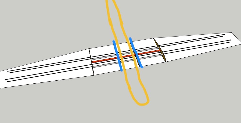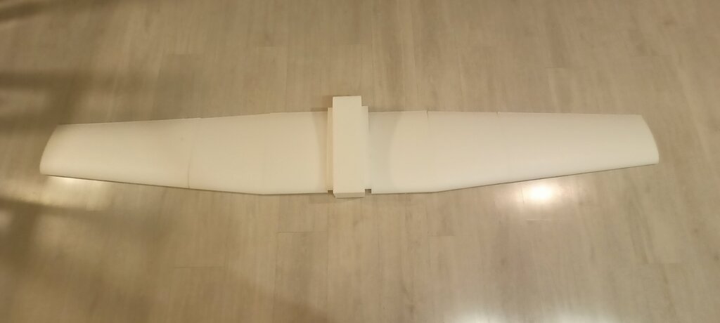Kolejny update. Mam skrzydło wycięte z EPP: Zdjęcie na pewno zniekształca skrzydło 2,5m. Do mocowania w kadłubie jest negatyw: Tak wygląda centropłat w kawałkach: I teraz tak się zastanawiam czy potrzebne są mi te sklejkowe żeberka. Kieszeń bardzo ładnie pasuje w otwory w centropłacie, materiału nad i pod rurka jest sporo a EPP jest dość twarde. Mam u siebie sklejkę balsową i jest dość delikatna, z drugiej strony na każdym ze skrzydeł są dwie gondole w tym jedna z podwoziem. A silniki finalnie będą Emax CF2822, ciąg się zgadza, są o połowę tańsze i sprawdzone przez wielu modelarzy. Mam jeszcze zdjęcie jak to wygląda w modelu A10 Freewinga który waży >5kg. Wygląda na 2 mm sklejkę, może u mnie też taka płytka łącząca tylko rurki. -