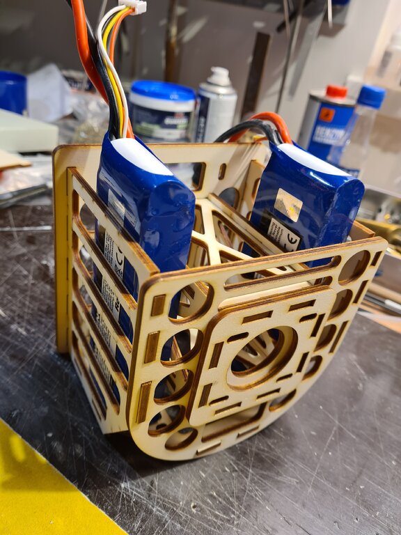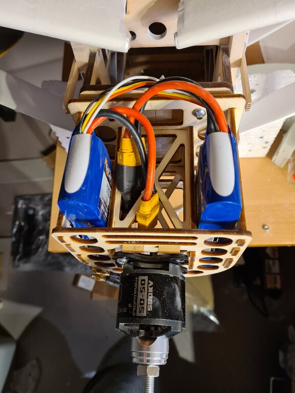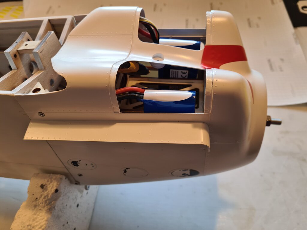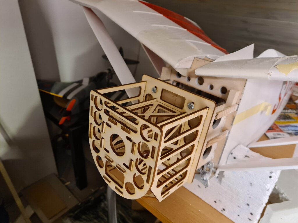 Po "krótkiej" przerwie kontynuuję prace nad modelem, zamiast domku pod silnik wykonałem kosz, który spełnia rolę zarówno domku pod silnik jak i kosza na akumulatory. W celu wyważenia modelu akumulatory można będzie przesuwać do przodu lub tyłu. Zacząłem również wykonanie osłony silnika -