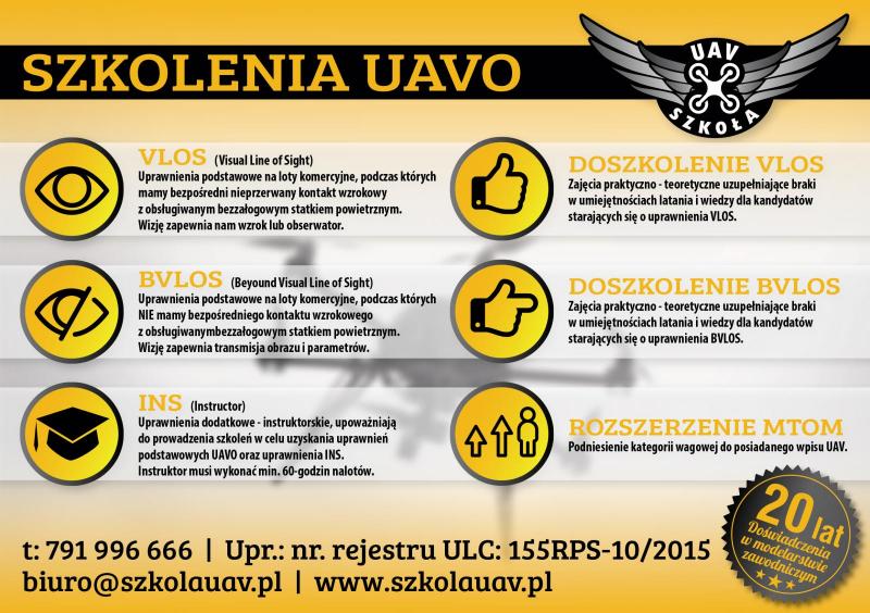 Zarejestrowany Ośrodek Szkolenia operatorów bezzałogowych statków latających UAVO oraz modeli zdalnie sterowanych. SZKOŁA UAV FUN & FLY POZNAŃ/SZCZECIN/GDYNIA/WROCŁAW Uwaga ruszamy z kolejnymi szkoleniami UAVO na sezon 2016!!!! Najbliższe terminy szkoleń VLOS i BVLOS to: Szkolenie UAVO VLOS z wyżywieniem 14-17.04.2016- nabór otwarty !!! Szkolenie UAVO VLOS z wyżywieniem 25-28.04.2016- nabór otwarty !!! "FORMULARZ ZGŁOSZENIOWY NA SZKOLENIE UAVO" *Specjalistyczne szkolenia UAVO dla służb mundurowych *Szkolenia z dofinansowaniem ze środków WUP i EFS Z dniem 2.01.2015r. Fun & Fly została wpisana do Rejestru Instytucji Szkoleniowych Wojewódzkiego Urzędu Pracy pod numerem ewidencyjnym 2.30/00001/2015 Z dniem 09.10.2015r. Fun & Fly została wpisana do Rejestru Instytucji Szkoleniowych Urzędu Lotnictwa Cywilnego pod numerem ewidencyjnym 155RPS-10/2015 Cennik: Szkolenie VLOS teoretyczne + praktyczne z wyżywieniem ( 4dni ) 1700 zł Dodatkowe godziny szkolenia na lotnisku 170 zł/h Szkolenie BVLOS teoretyczne + praktyczne z wyżywieniem (6 dni) 7200zł Dodatkowa godzina szkolenia praktycznego BVLOS na lotnisku 300 zł/h Terminy szkoleń VLOS i BVLOS: 05.02.2015 - 07.02.2015 - szkolenie zakończone 16.02.2015 - 18.02.2015 - szkolenie zakończone 05.03.2015 - 07.03.2015 - szkolenie zakończone 19.03.2015 - 21.03.2015 - szkolenie Straży Pożarnej zakończone BVLOS 01.04.2015 -03.04.2015 - szkolenie zakończone 23.04.2015 -25.04.2015 -szkolenie zakończone Egzaminem Państwowym 7.05.2015 - 9.05.2015 - szkolenie Służb Mundurowych z egzaminem BVLOS 19.05.2015 - 22.05.2015 - szkolenie zakończone Egzaminem Państwowym 08.06.2015 - 10.06.2015 - szkolenie zakończone Egzaminem Państwowym 22.06.2015 - 24.06.2015 - szkolenie zakończone Egzaminem Państwowym 13-15.07.2015 - szkolenie zakończone Egzaminem Państwowym 27-29.07.2015 - szkolenie zakończone Egzaminem Państwowym 10-12.08.2015 - szkolenie zakończone Egzaminem Państwowym 29-31.10.2015 - szkolenie zakończone Egzaminem Państwowym 23-25.11.2015 - szkolenie zakończone Egzaminem Państwowym Szkolenie UAVO VLOS 26-28.02.2016 (weekend)- szkolenie zakończone Egzaminem Państwowym !!! Szkolenie UAVO VLOS 18-20.03.2016 - szkolenie zakończone egzaminem !!! Szkolenie UAVO VLOS 21-23.03.2016- szkolenie zakończone egzaminem !!!! Szkolenie UAVO VLOS z wyżywieniem 14-17.04.2016- nabór otwarty !!! Szkolenie UAVO VLOS z wyżywieniem 25-28.04.2016- nabór otwarty !!! Dla Klientów zaopatrujących się w drony w Naszej firmie atrakcyjne zniżki !!! "FORMULARZ ZGŁOSZENIOWY NA SZKOLENIE UAVO" -