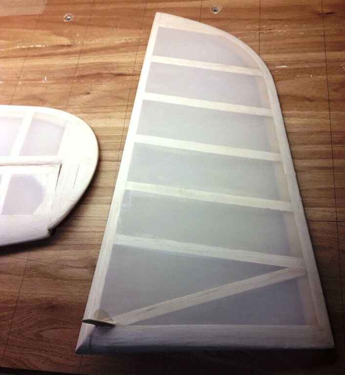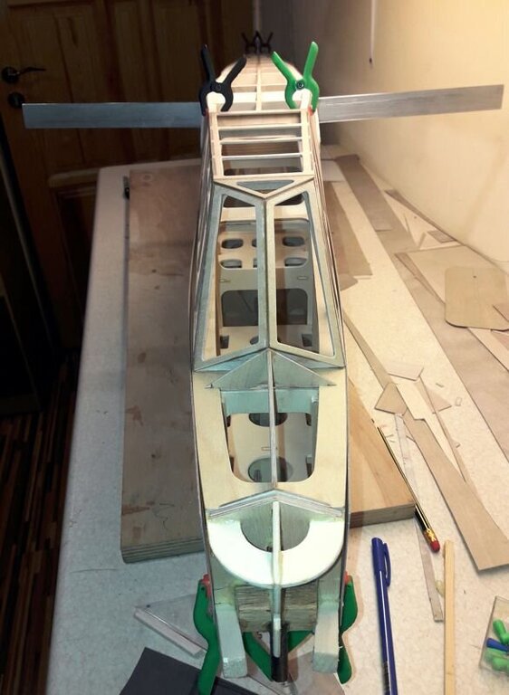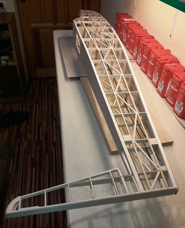 Dzisiaj na początek, w ramach ciekawostki - sposoby ulatniania DFS 230. Klasycznie na holu. Na "sztywnym" holu Ciekawe czy ktoś próbował tak z modelami, chyba niewykonalne, ja nigdzie nie widziałem takiej próby. Nie wiem jak to nazwać, ale samolot holujący-napędzający startował razem z szybowcem przyczepiony do niego. W rejonie lądowania był odczepiany i stanowił też osłonę szybowca. Niestety nie znalazłem filmiku z lotu tymi modelami. Zostały jeszcze inne ciekawe metody ulatniania, ale to może następnym razem. Postępy prac przy modelu - sklejony statecznik poziomy i ster kierunku ( oklejone balsą 1,5 mm) Statecznik wyszedł na 101 cm, mocowanie to dwie rurki węglowe 3 mm z prętem aluminiowym w środku, wsuwane w wręgę, a z przodu śruba nylonowa M4 . Orczyk pospawany tigiem z nierdzewki - drut 4 mm blacha 1,5 mm. Wchodzi w rurkę weglową, która będzie cała zaklejona (widać na następnym zdjęciu) Przeniesienie napędu statecznika poziomego, planuję popychaczem, a pionowego linkami. Statecznik w tym stanie( przed oklejeniem) waży 217 g . Do tego dojdzie koveral i farba. Klejenie kadłuba. Widać przykręcone blaszki do mocowania zastrzałów ( duraluminium 2mm skręcone śrubami M3 3 szt. ), oraz klocki dębowe do amortyzatorów płozy. Wklejony zaczep do holu, razem z rurką przedłużającą i wzmocnienie z twardego drewna (dąb) do przykręcenia płozy. Tutaj już sklejenie całego kadłuba w jedną całość ? -