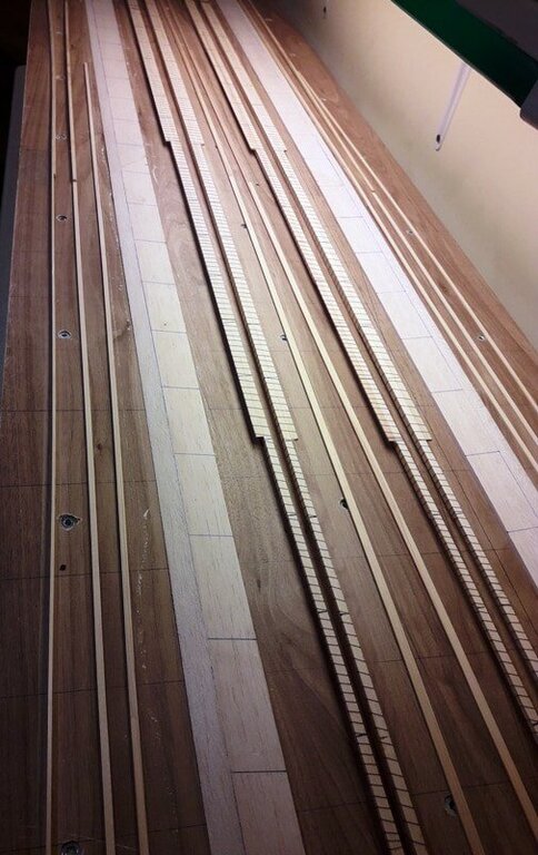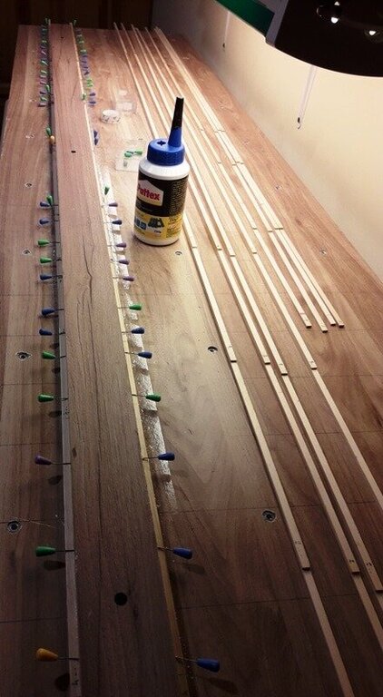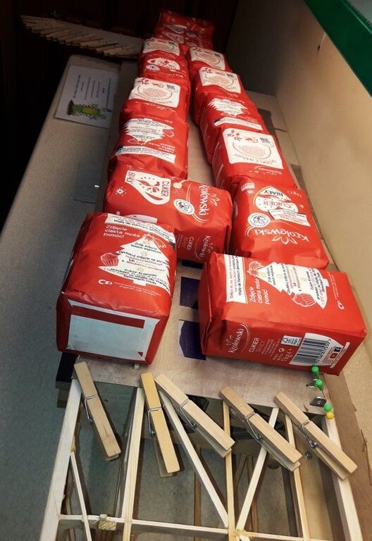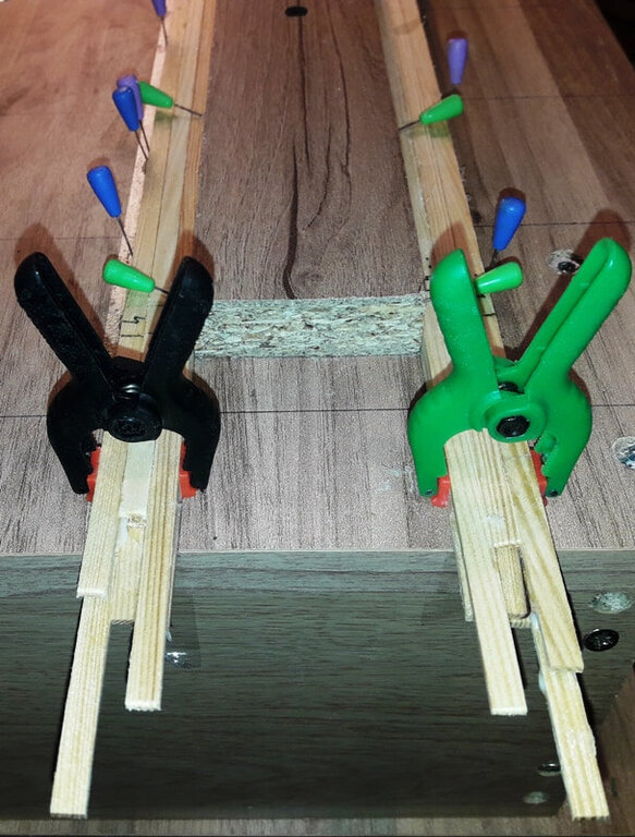 Nie było tak źle, sklejanie poszło szybciej niż myślałem ( kleiłem po 2 naraz), nie wiem czy szybciej bym wystrugał równy dźwigar o takich przekrojach z jednego kawałka. Na początku chciałem " wystrugać " ale nie udało mi się zdobyć nic suchego o równych wąskich słojach o tej długości. Poza tym, jeśli taki dźwigar zda egzamin, to budowa większego modelu bez dostępu do dobrego (długiego) materiału nie będzie problemem. Wyjdzie w praniu, ale w zasadzie już jestem pewny że spokojnie wytrzyma ?. -