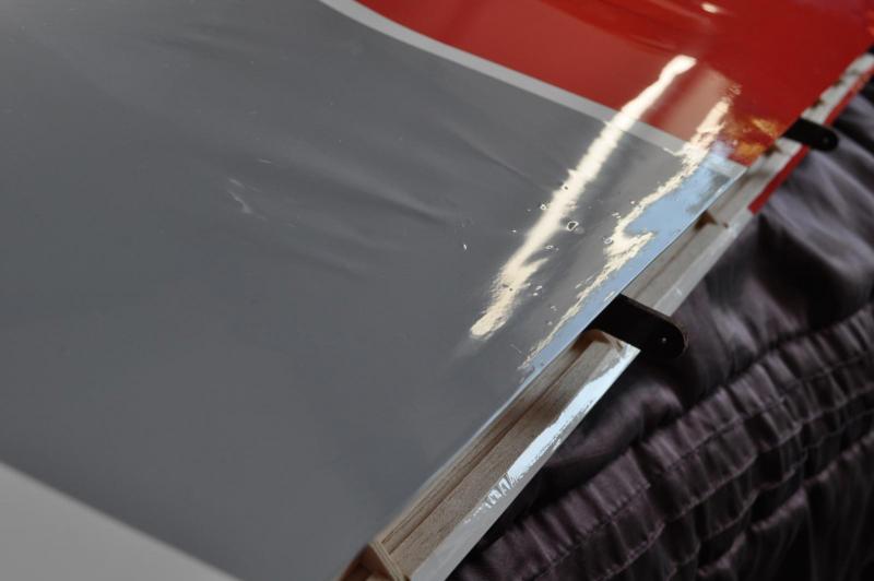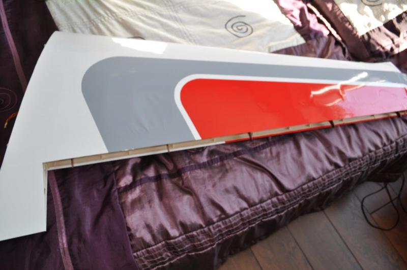 Klasyczne skrzydło konstrukcyjne z kesonem od natarcia do dźwigara. Pisząc o łapaniu na brzegach miałem na myśli już układanie na skrzydle całego białego arkusza ze wstępnie przyprasowanymi ozdobami. Łącząc arkusze folii na szklanym blacie oczywiście nie prasowałem bez ładu i składu, a starałem się wyciskać powietrze i prasować rozpoczynając od krawędzi i dalej poruszać się równolegle od tej krawędzi, od której zaczynałem (coś jak przyklejanie folii ochronnej na ekranie telefonu). Próba nałożenia kolorowego zdobienia już na naciągniętej na skrzydle białej folii jest oczywiście jakimś pomysłem, ale boję się, że jeżeli to połączenie nie udało się na gładkiej i idealnie równej szybie, to tym bardziej będzie trudne na powierzchni, która już nie jest równa i dodatkowo się zapada pod naciskiem (elastyczność folii).