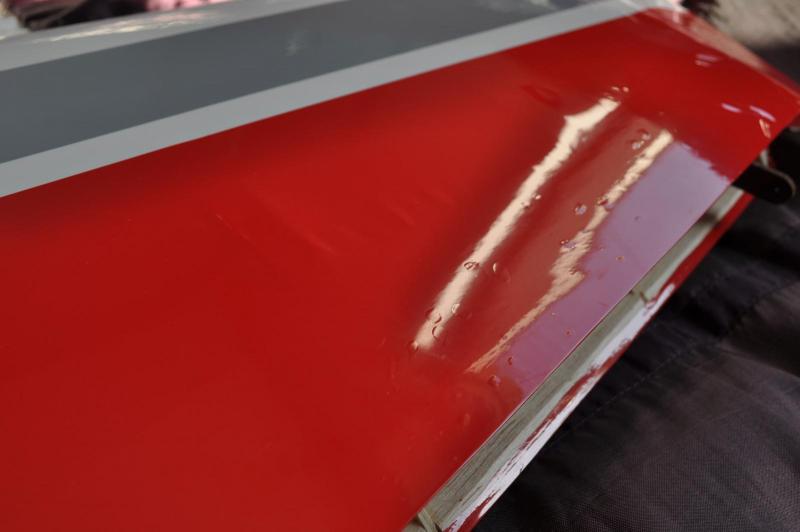 Czy ma ktoś jakiś sprawdzony sposób na oklejanie metodą folia na folię? Chodzi mi o bąble powietrza widoczne na zdjęciach. Cały bryt do oklejania skrzydła przygotowywałem najpierw na szklanym blacie wyciskając tyle powietrza spomiędzy sklejanych warstw, ile tylko mi się udało. Następnie przeprasowałem łączone arkusze żelazkiem o temperaturze około 155 stopni. Chodziło o w miarę solidne sklejenie warstw ale jeszcze bez finalnego efektu obkurczania się folii. Efekt może nie był estetycznie powalający, ale tragedii też nie było. Od biedy taki wygląd bym zaakceptował. Niestety prawdziwy problem zaczyna się po położeniu całości na skrzydło, wstępnym przyłapaniu na rogach i próbie naprężania. Wtedy dopiero wyłazi masa nowych bąbli, a istniejące dodatkowo puchną. Od razu dopiszę, że nie zwilżałem powierzchni folii przy łączeniu elementów. Gdzieś słyszałem o takim sposobie, ale bałem się, że przecież tej wody ani do końca nie wycisnę, ani ona sama nie da rady odparować. Jakieś sprawdzone rady praktyczne jak uzyskać zadowalający efekt zbliżony do oklejenia fabrycznego? Chociaż w tym przypadku to 'fabryczne' to przecież również efekt czyjejś ręcznej pracy.