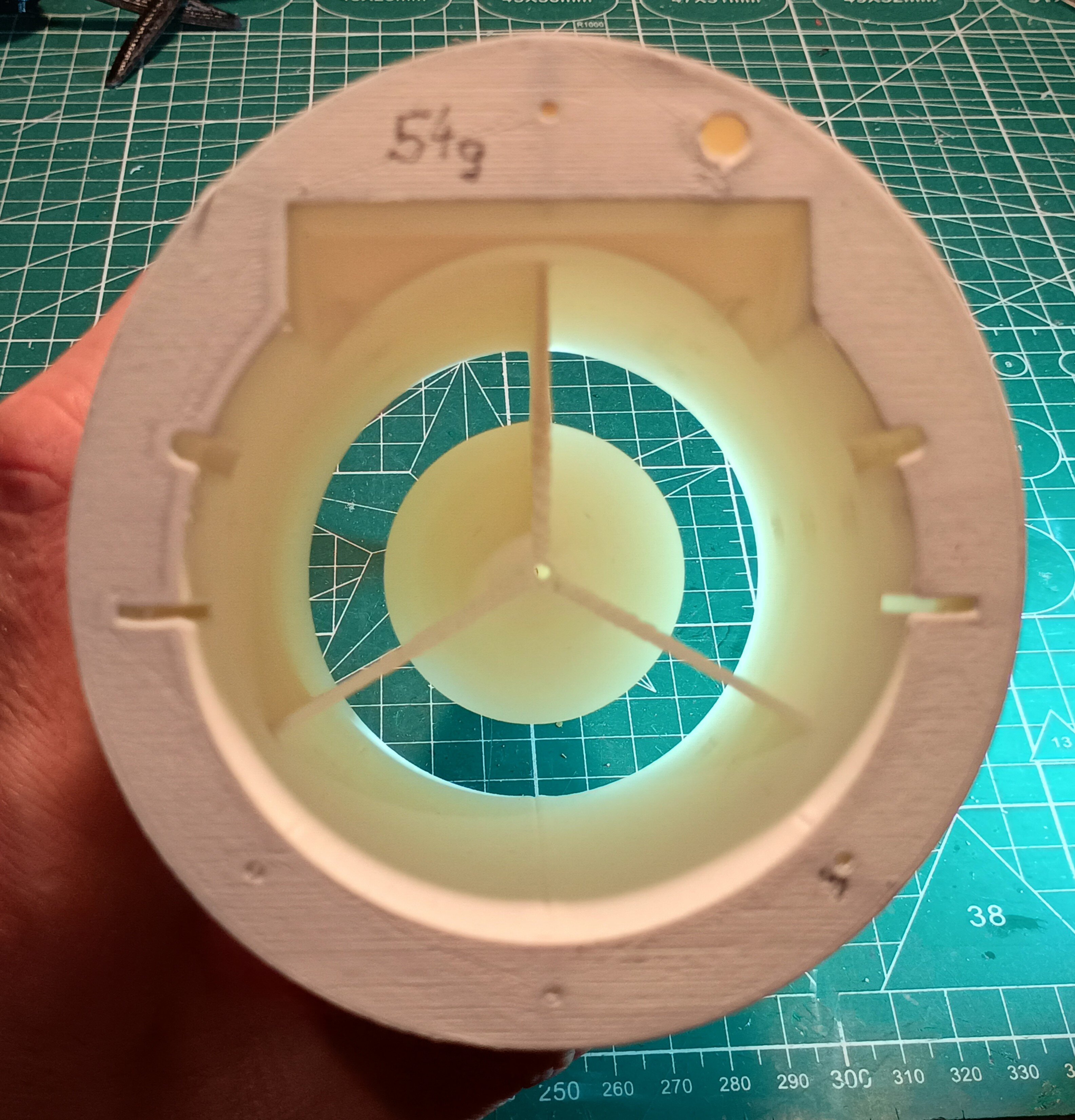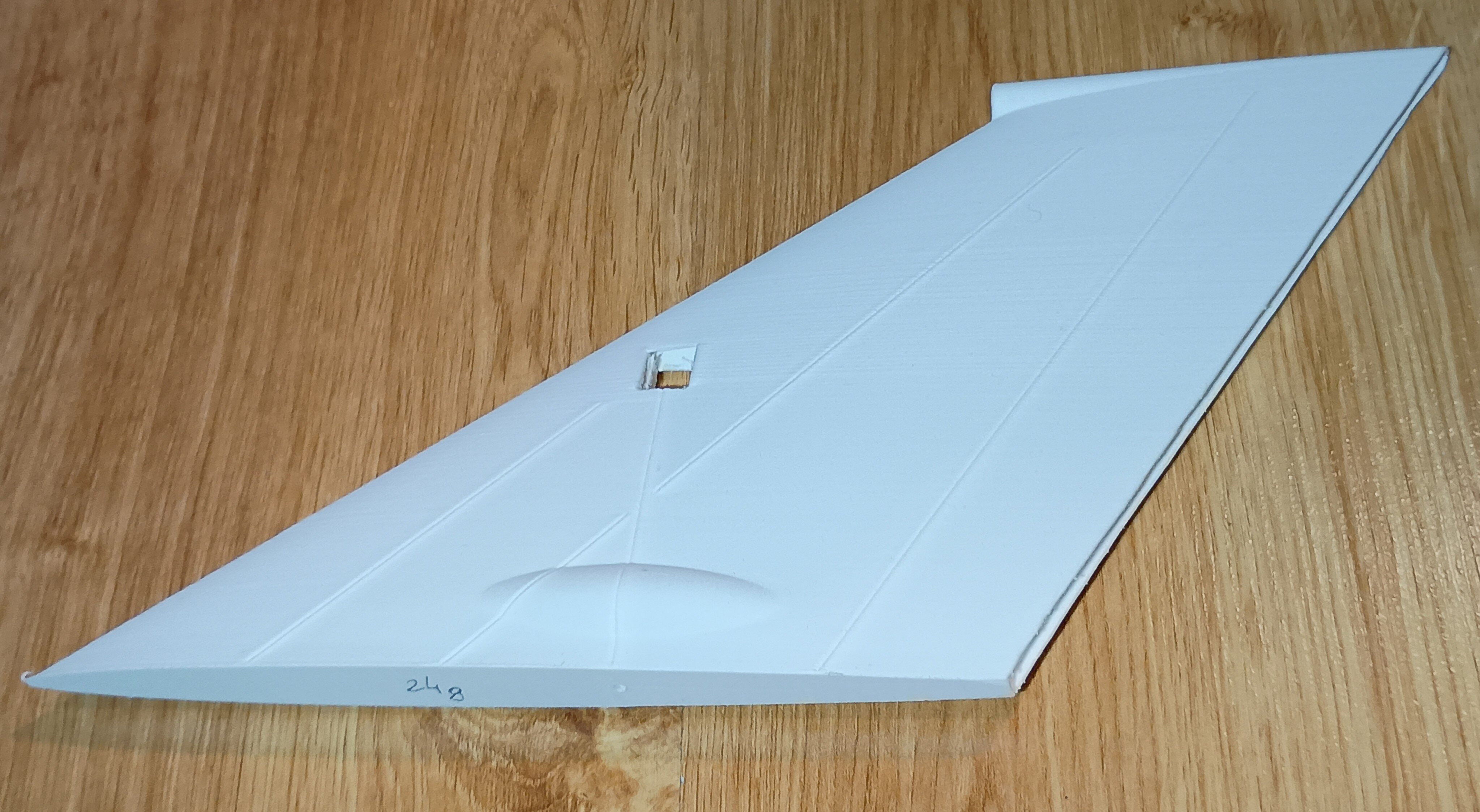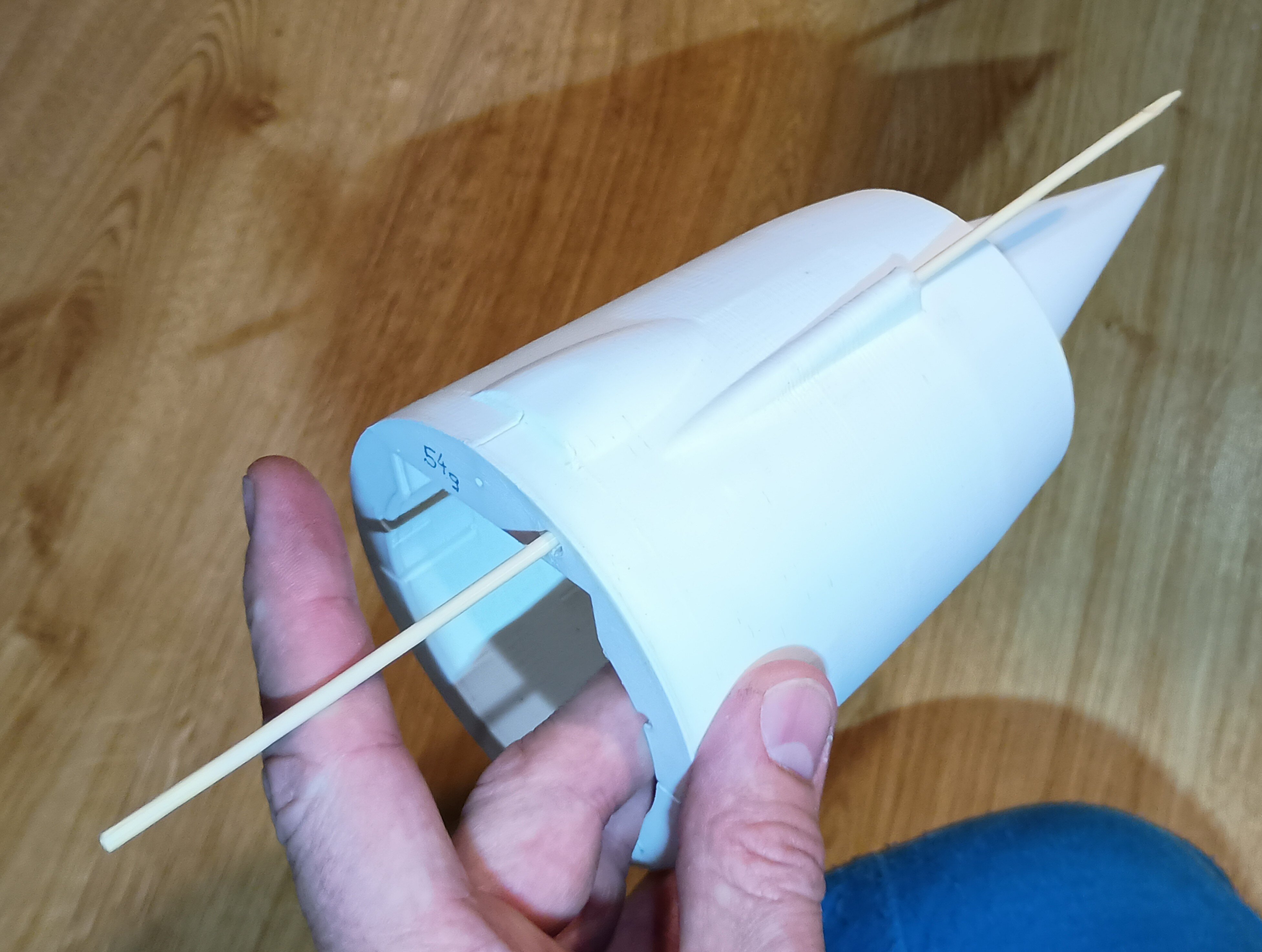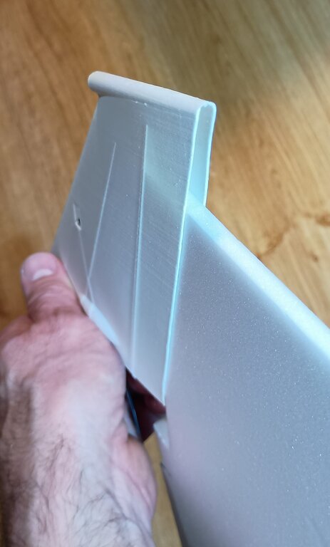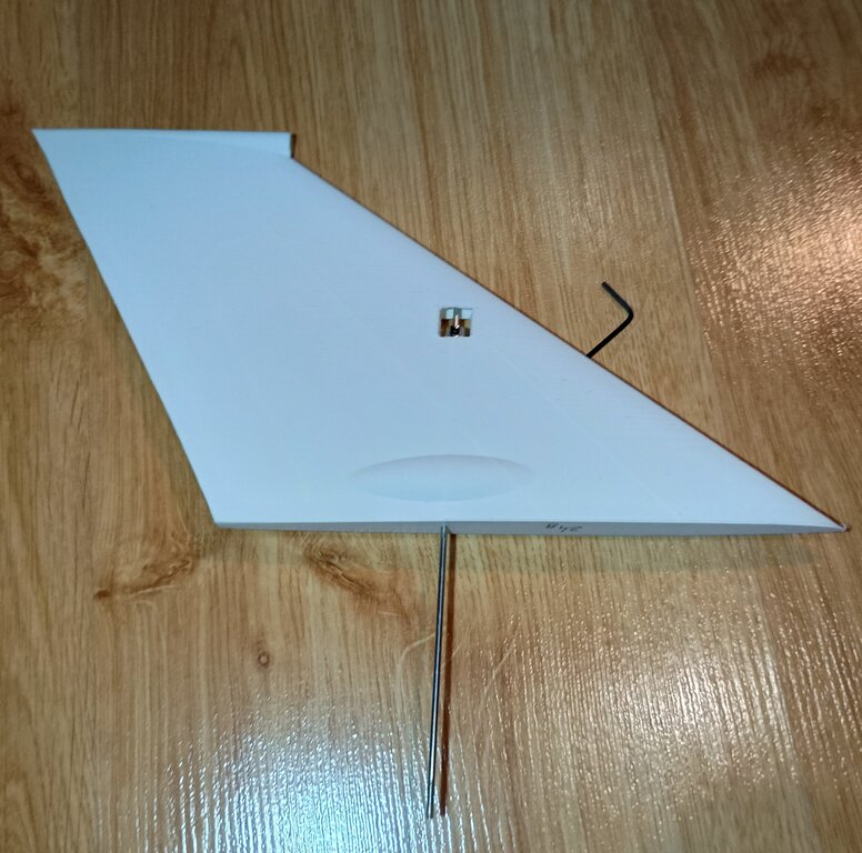 Dzisiaj zrobiłem pierwsze wydruki i nawet jestem zadowolony. Nos że stożkiem wlotowym wydrukowałem bo tak jest prościej i można uzyskać cieńsze ścianki niż przy styropianie dając większy przekrój kanału turbiny. Wydruk PLA LW. Drukowanie figurek samolotów się opłaciło bo wyszło całkiem nieźle. Można jeszcze dopracować papierem ściernym. Element waży 54g. Tam gdzie wchodzi rurka pitota jest przelot by wstawić tam zamek blokujący pokrywę akumulatora, tak sobie to wymyśliłem... pod wiatr, ale zobaczymy... Wydrukowałem też połówkę steru wysokości.. doszedłem do wniosku, że wydrukuje od razu z prowadzeniem dla osi obrotu. Niestety cały nie wszedł na moją drukarkę, ale to nie problem. Wycinałem tylną ściankę, jest idealnie dopasowana do szerokości 6mm depronu, który mogę wsunąć i wkleić w końcówkę steru. Będzie lżejszy i łatwo wykonać. W wydruku jest okienko na stoper osi. Wystarczy nasunąć ster na os i zablokować pierścieniem. Nie drukowałem dźwigni bo przykleję klasycznie dźwignie, jakoś za delikatne te wydrukowane. 24g sam wydruk steru... Najchętniej wzmocniłbym ten wydruk PLA jakimś lakierem scalającym i utwardzający mi powierzchnię. Nadającym się pod farbę akrylową. Co jakbym chciał pomalować wszystko klejem CA... nie wiem Cellon czy jakiś lakier...??